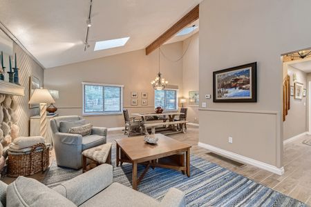 Living Room/Dining Room: Step into a space filled with comfort and charm. The open concept living room and dining room area provides the perfect setting for you and your group to relax and get cozy. With its tall vaulted ceiling, stone-built gas fireplace, and ample seating, this area instantly feels like home.