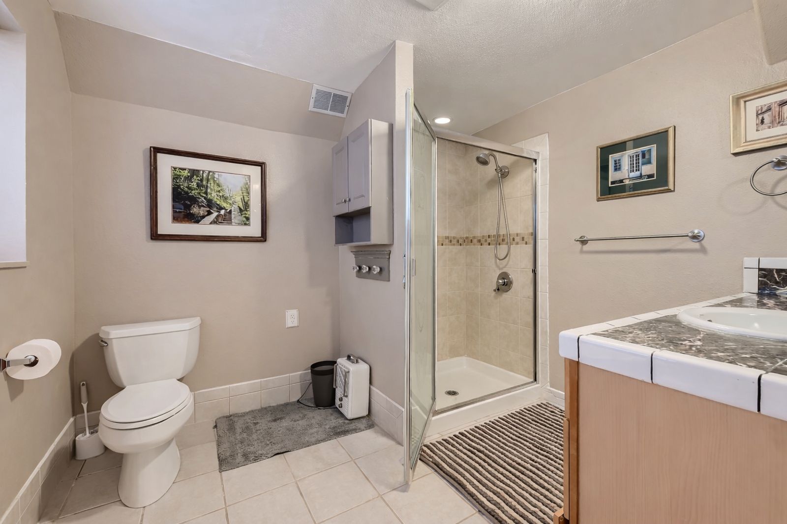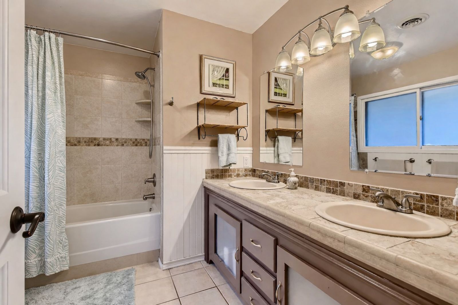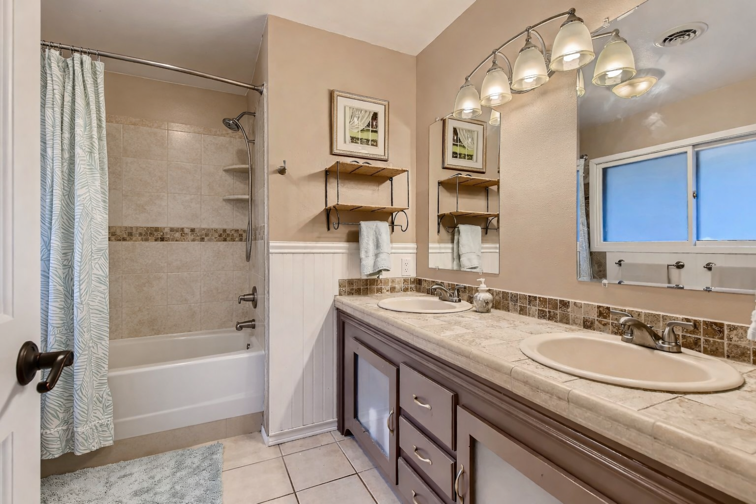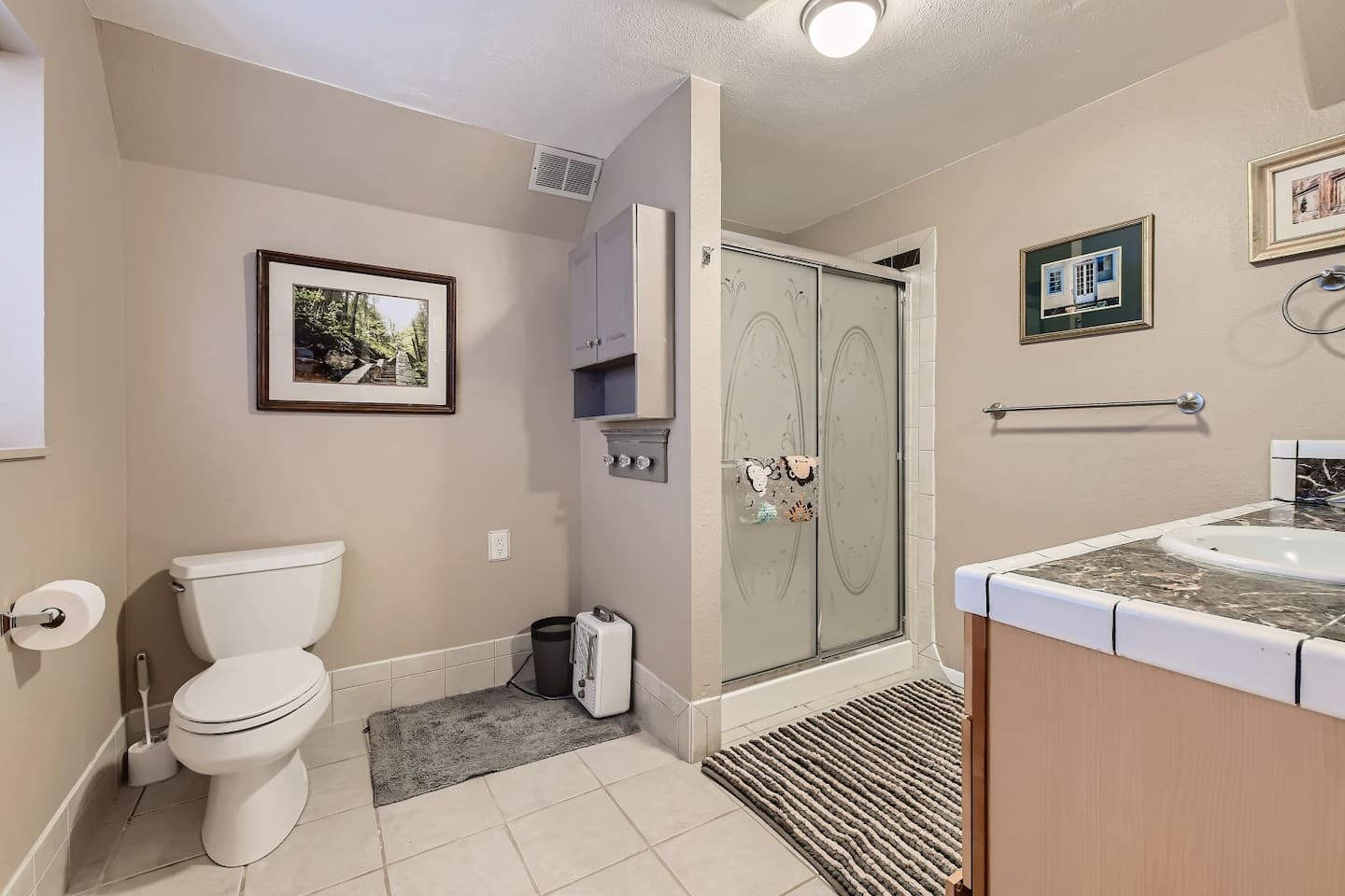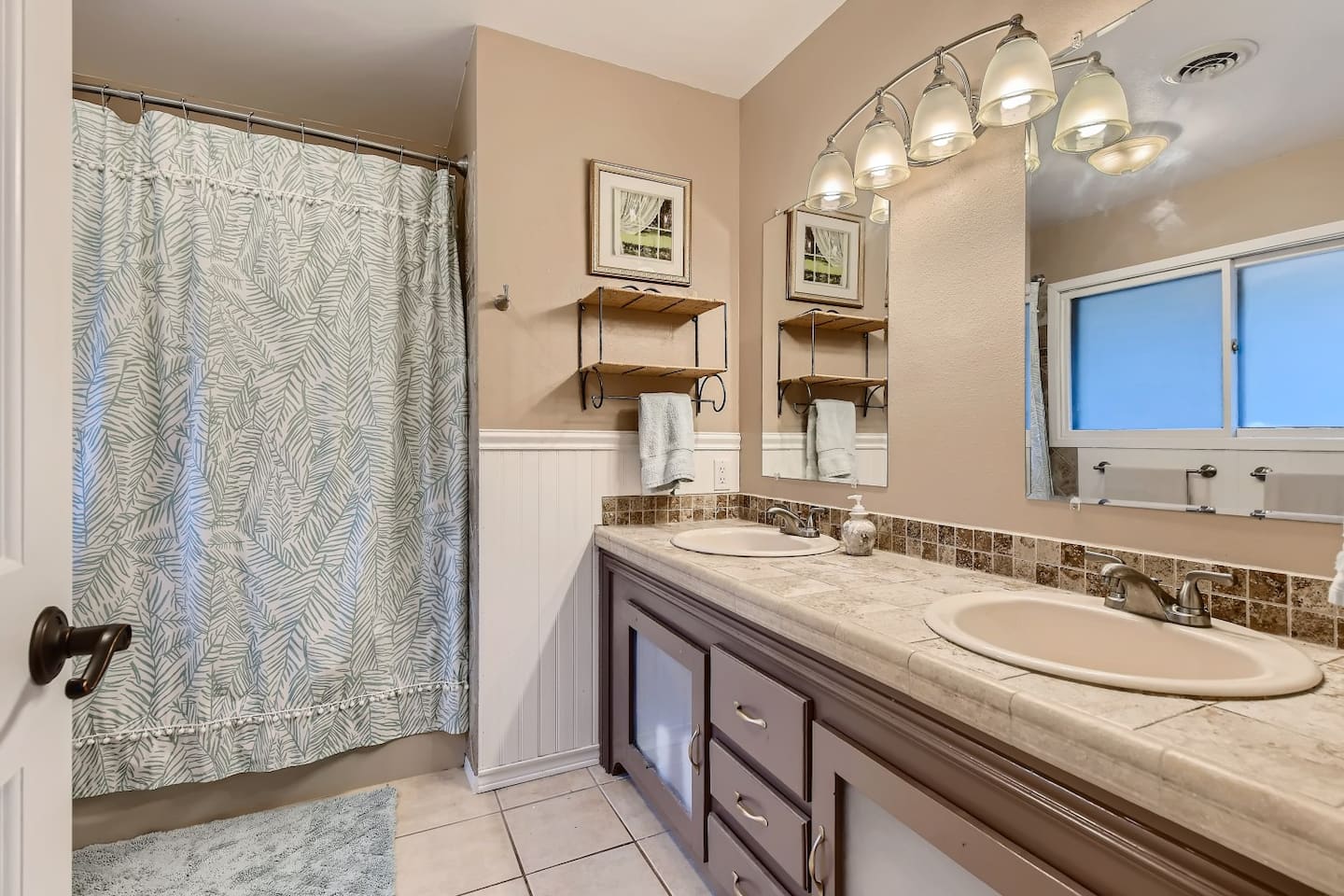 Bathroom: The upstairs bathroom is a full-sized bathroom serving bedrooms 2 and 3.