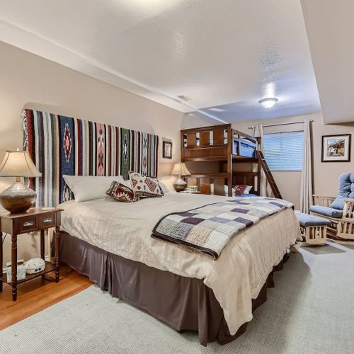 Bedroom 4: Adjacent to the downstairs living room, this bedroom features a king bed and twin-sized bunk beds. It includes an en-suite full bathroom for added convenience. The plush rocking chair and ottoman offer additional seating in this room.