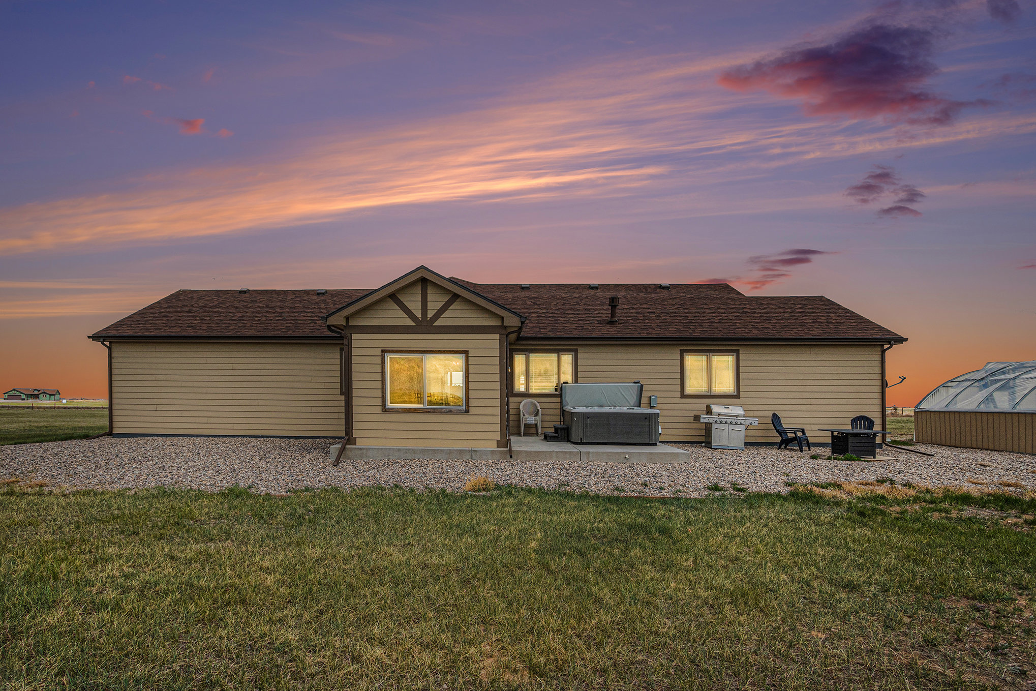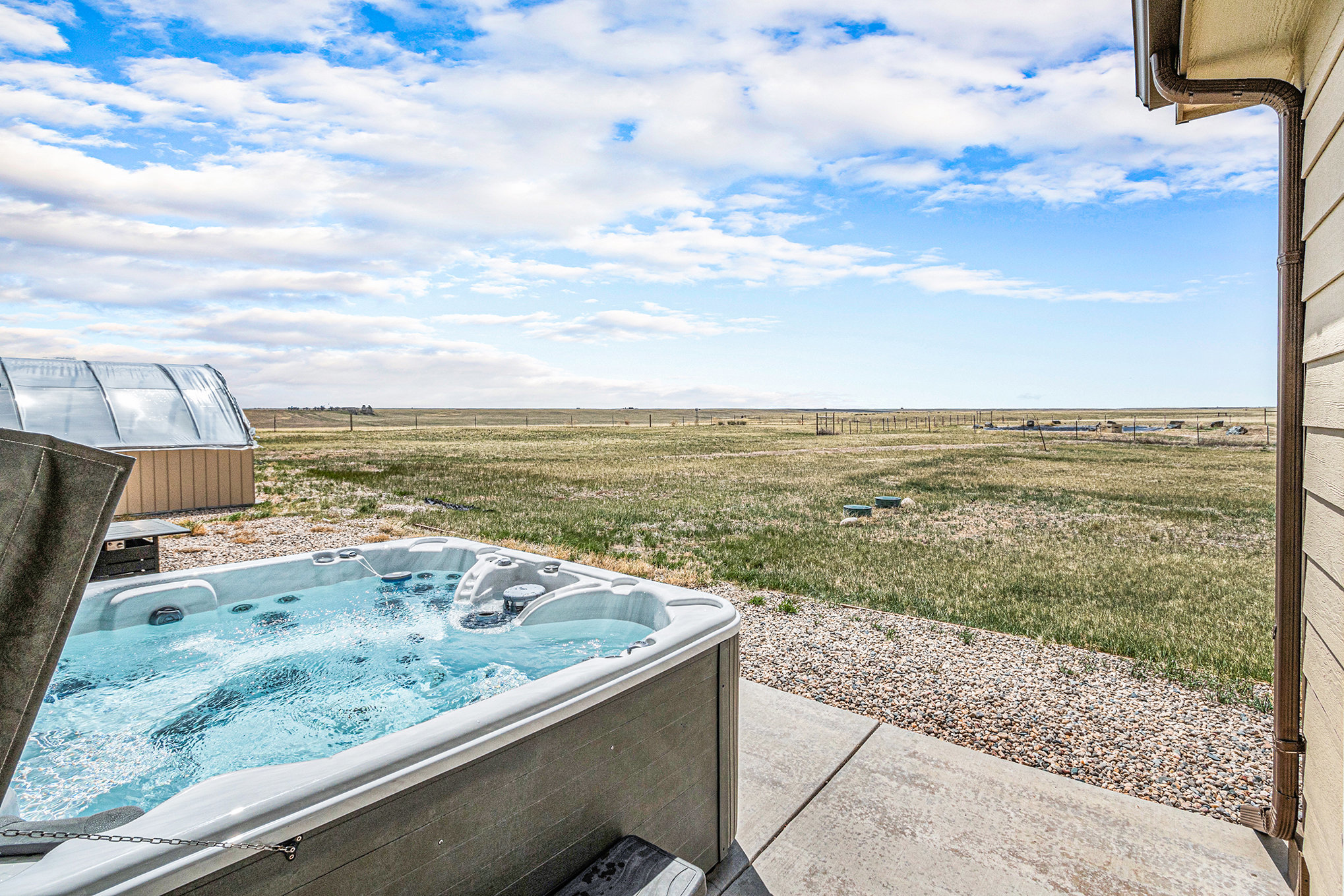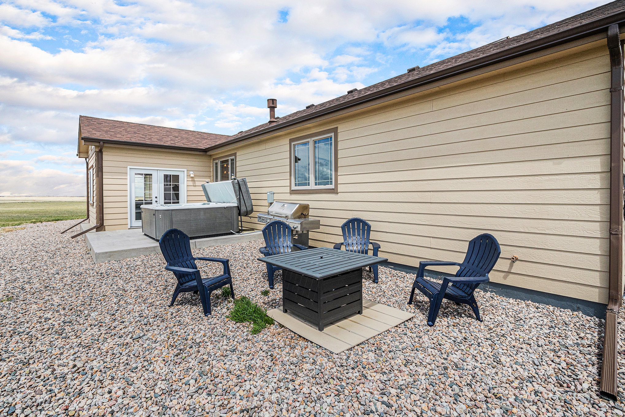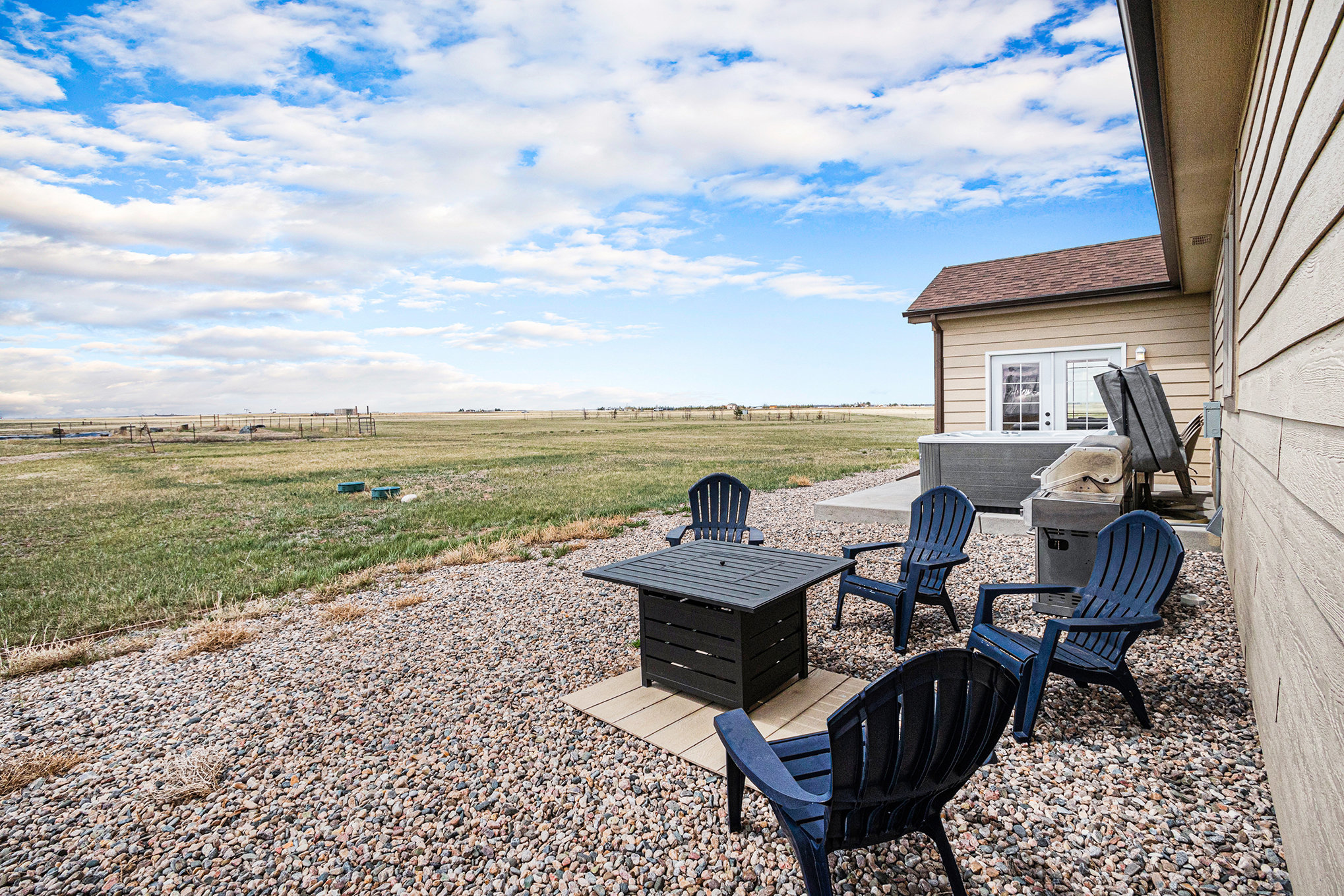 Embrace the Wyoming winter outdoors with a soak in the hot tub as steam curls into the cold night air or gather around the fire pit beneath a field of stars. A patio with outdoor furniture and a BBQ grill awaits when the weather turns mild, offering space to relax and dine while taking in open prairie views.
