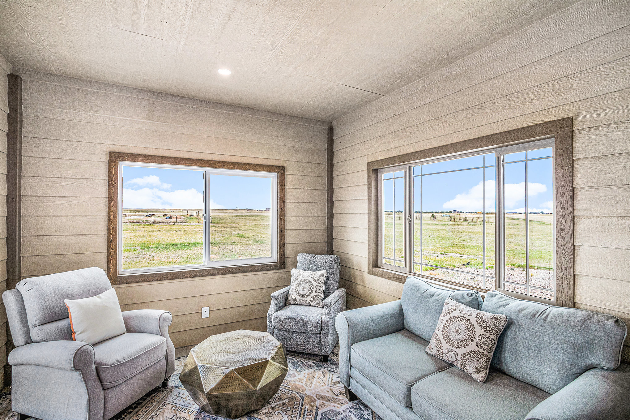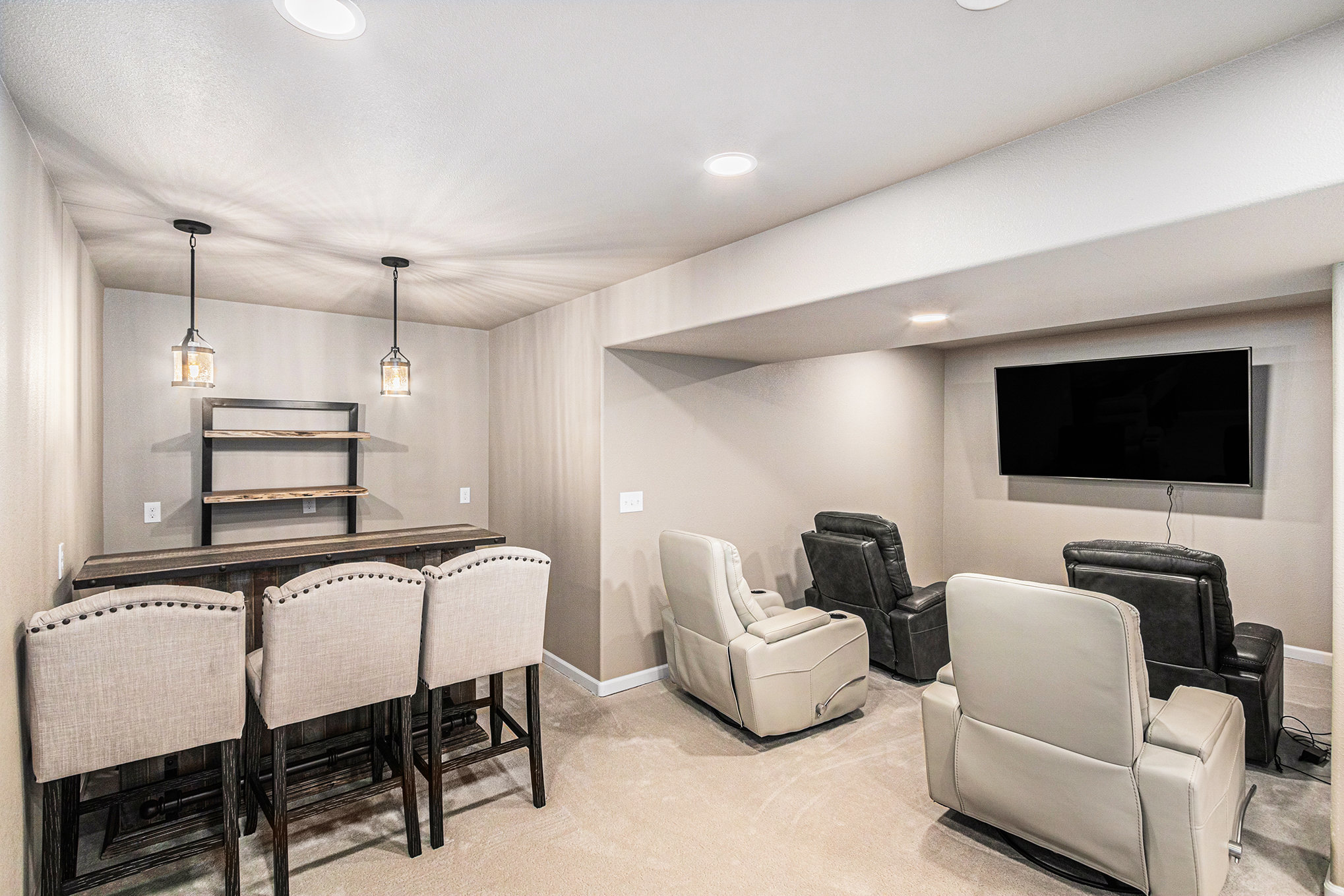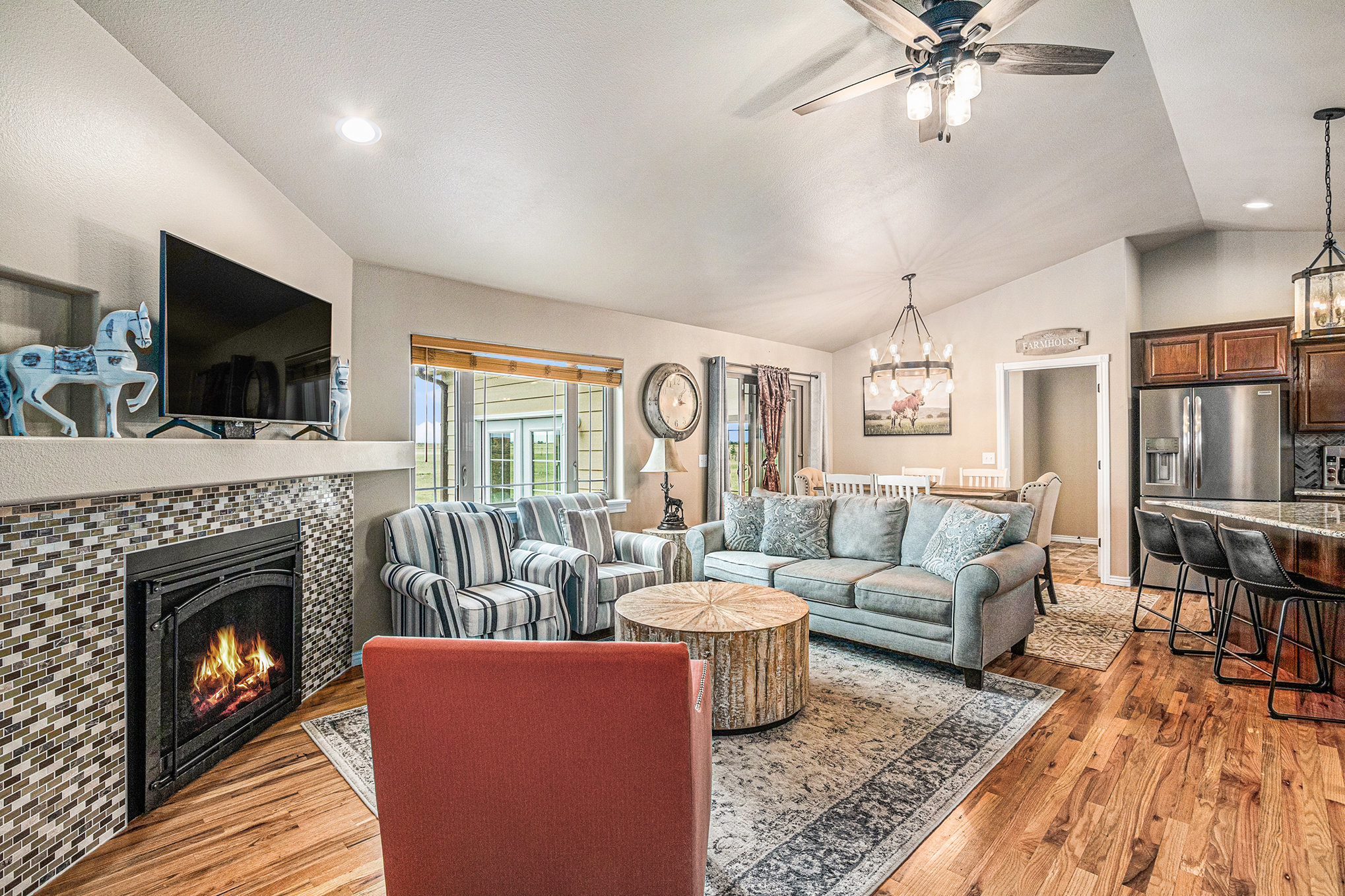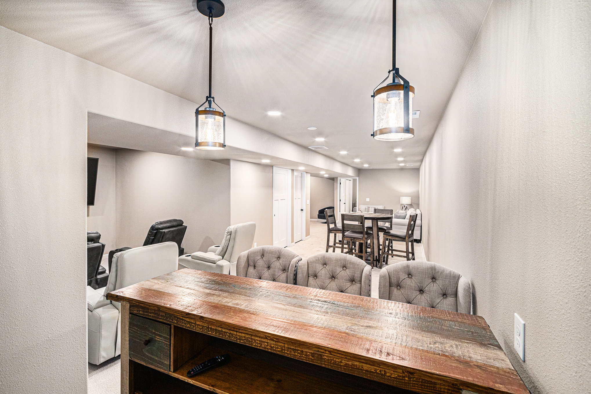 The main living area features high ceilings, wood-beam accents, and large prairie windows that flood the space with soft light. Downstairs, a second living room transforms into a cozy movie space with plush seating and a big-screen TV - perfect for family movie nights or quiet afternoons indoors.