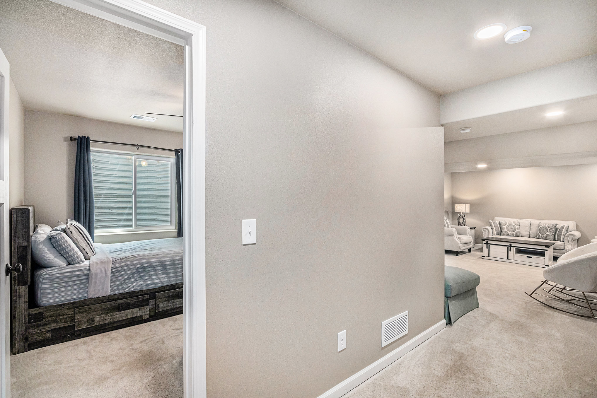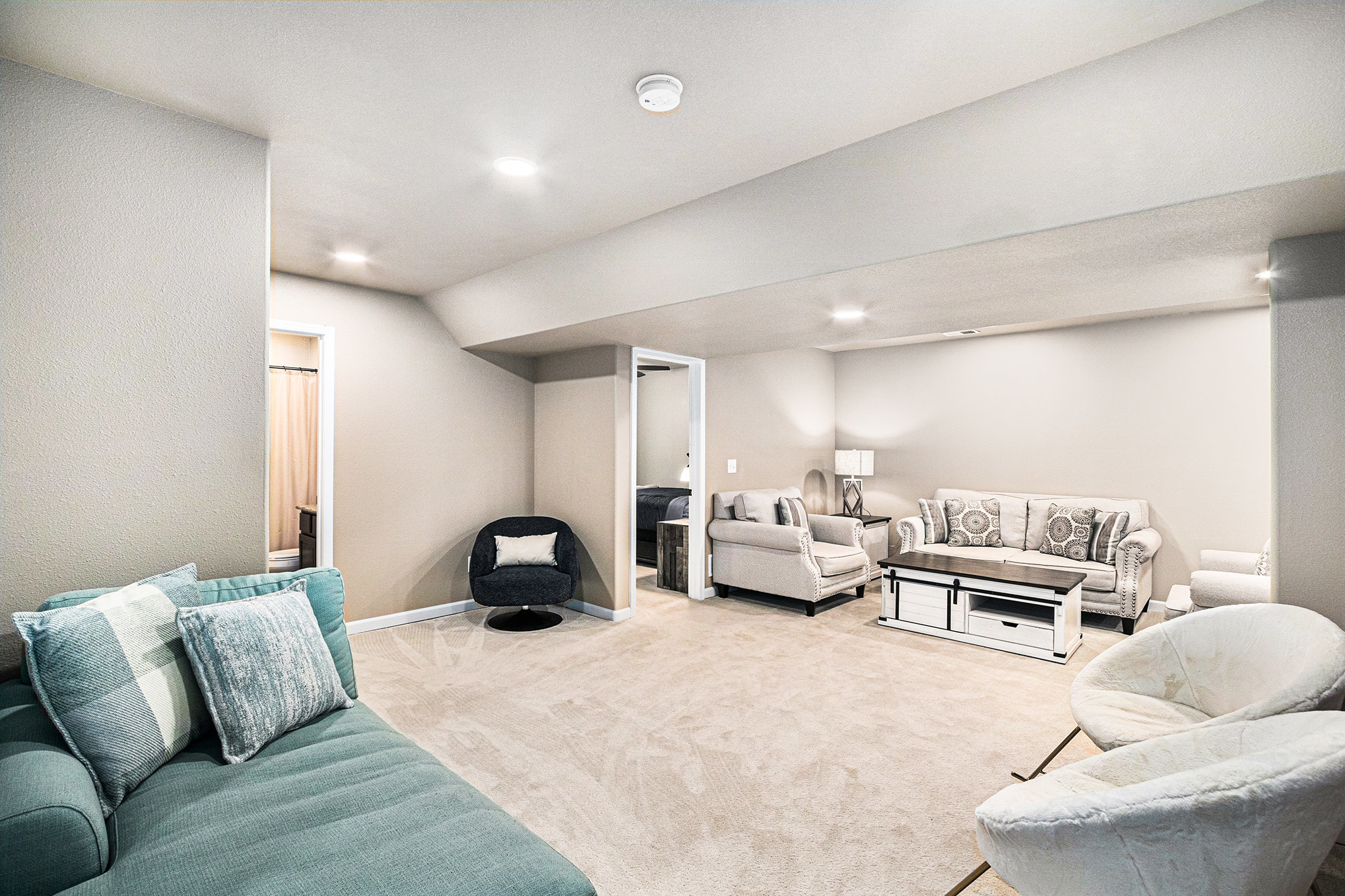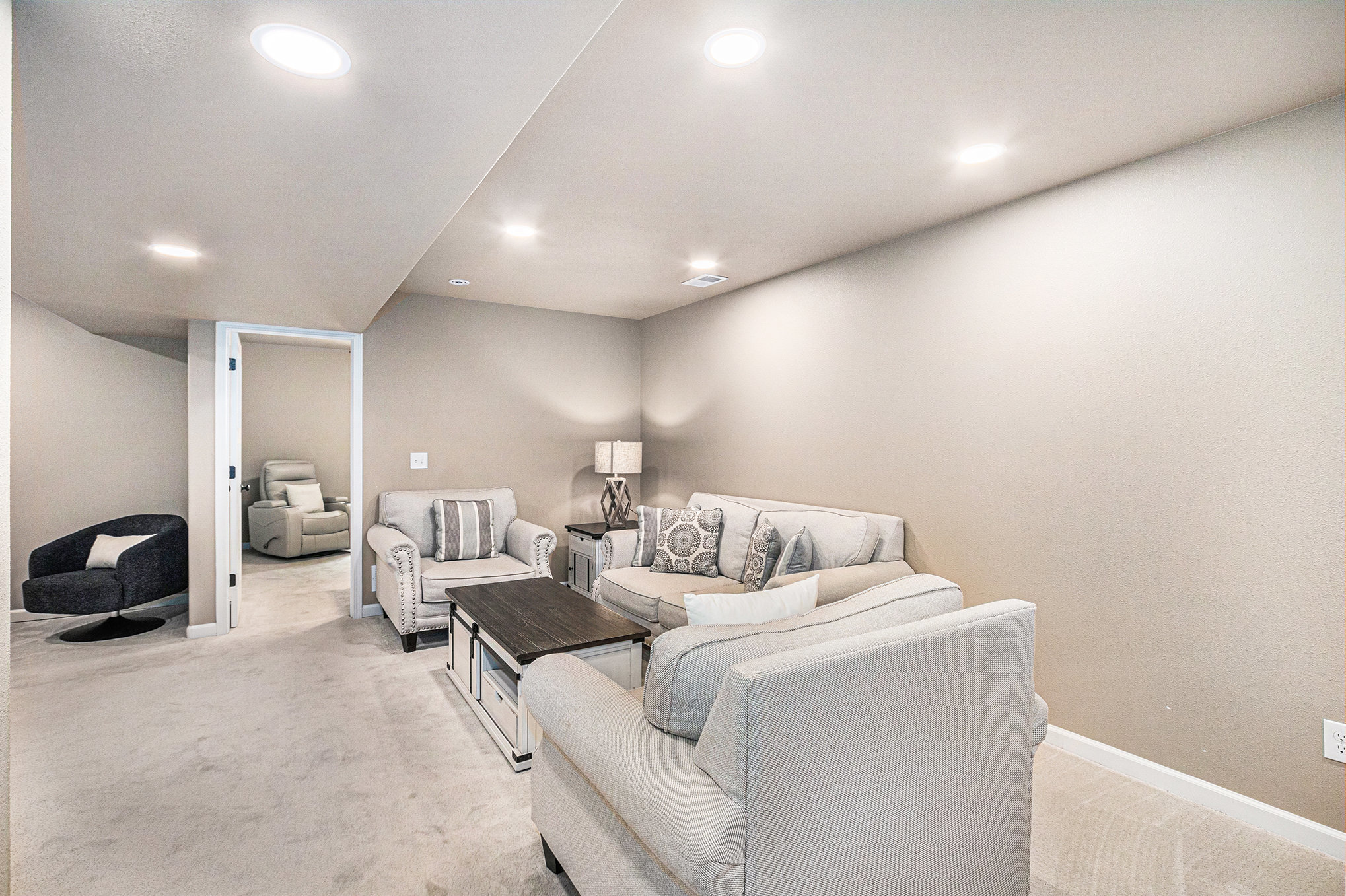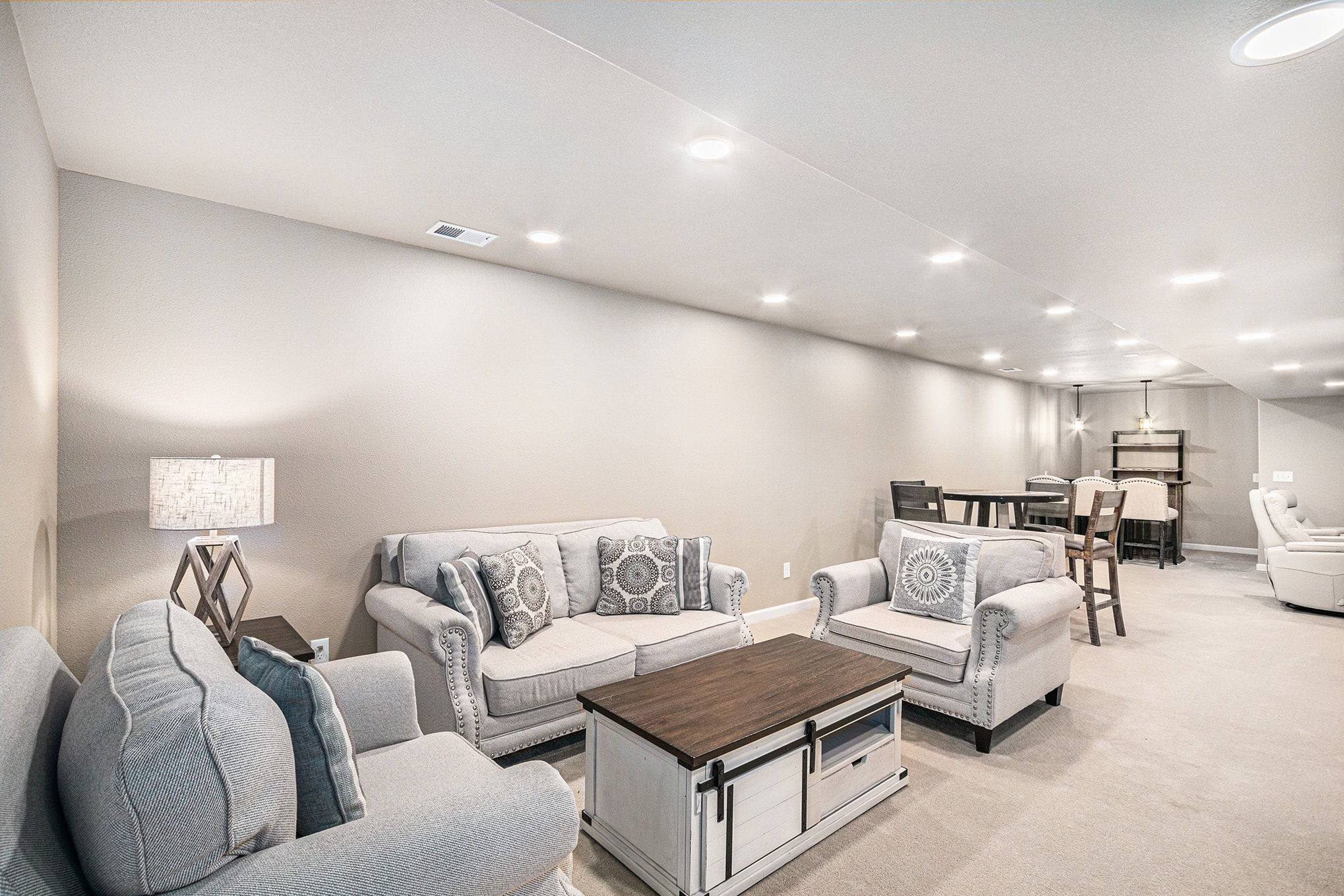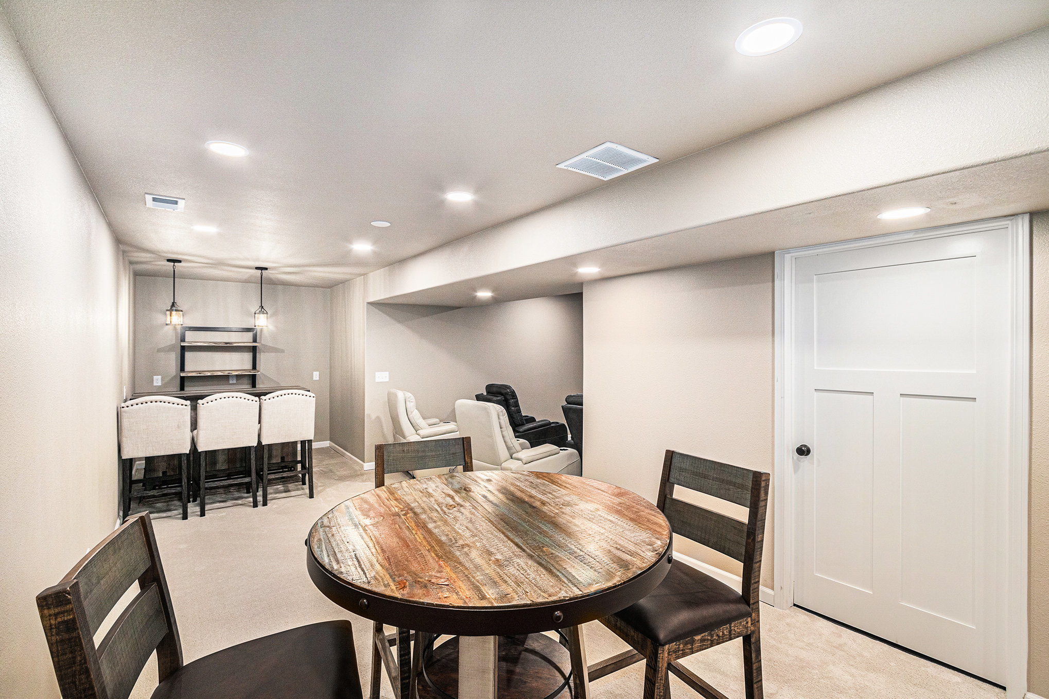 The main living area features high ceilings, wood-beam accents, and large prairie windows that flood the space with soft light. Downstairs, a second living room transforms into a cozy movie space with plush seating and a big-screen TV - perfect for family movie nights or quiet afternoons indoors.