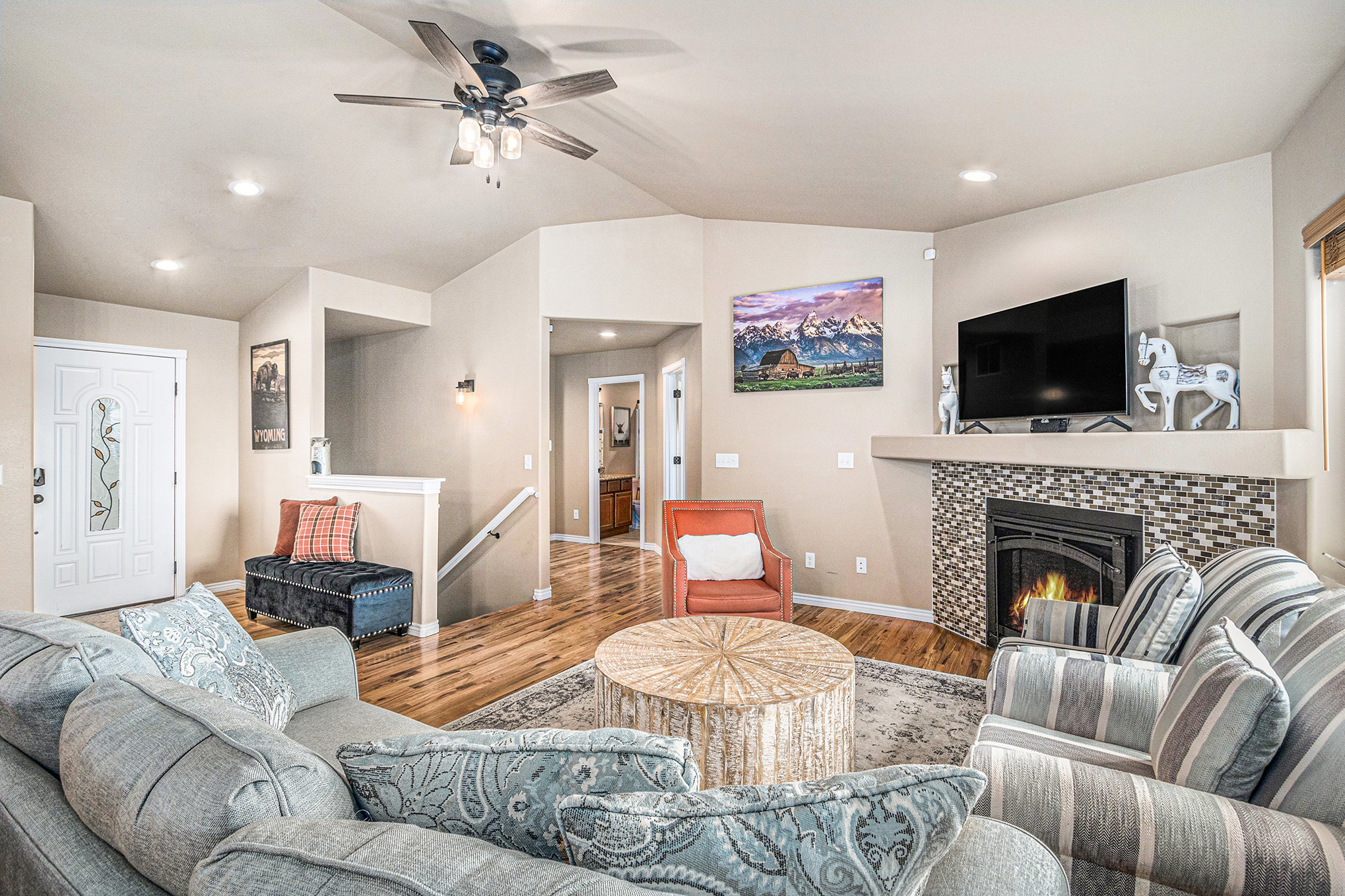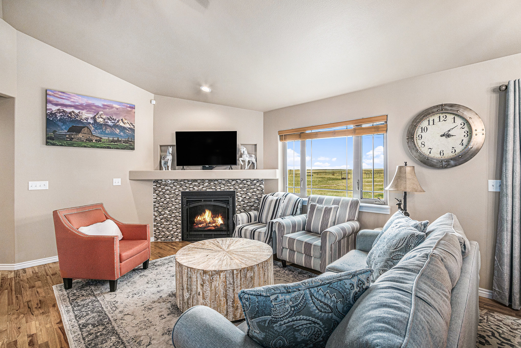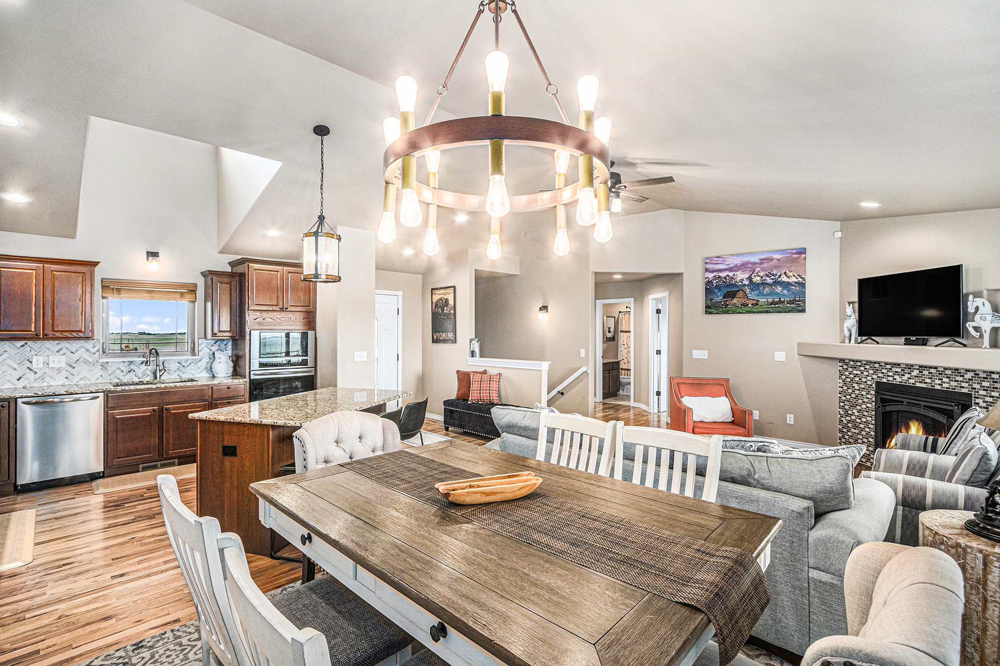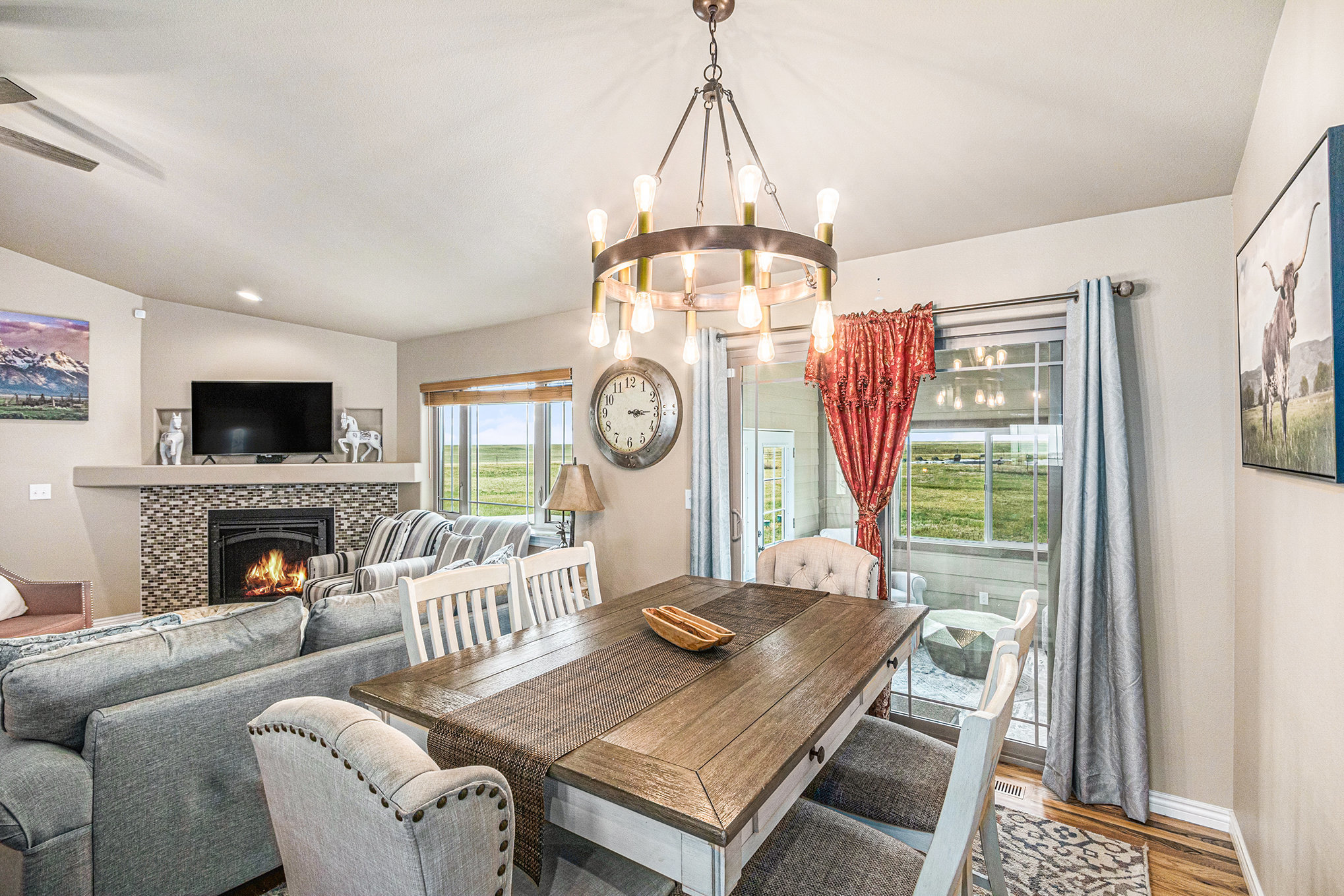 Soft light spills across the Wyoming plains as you settle into the calm of Ayu Ranch, where crisp air and quiet prairie views set the tone for your stay. Inside, warmth rises from the indoor fireplace while the snow-dusted landscape stretches beyond wide windows. Whether you’re gathered in the living room with family or watching the stars from the bubbling hot tub, each moment here invites you to unwind and reconnect.