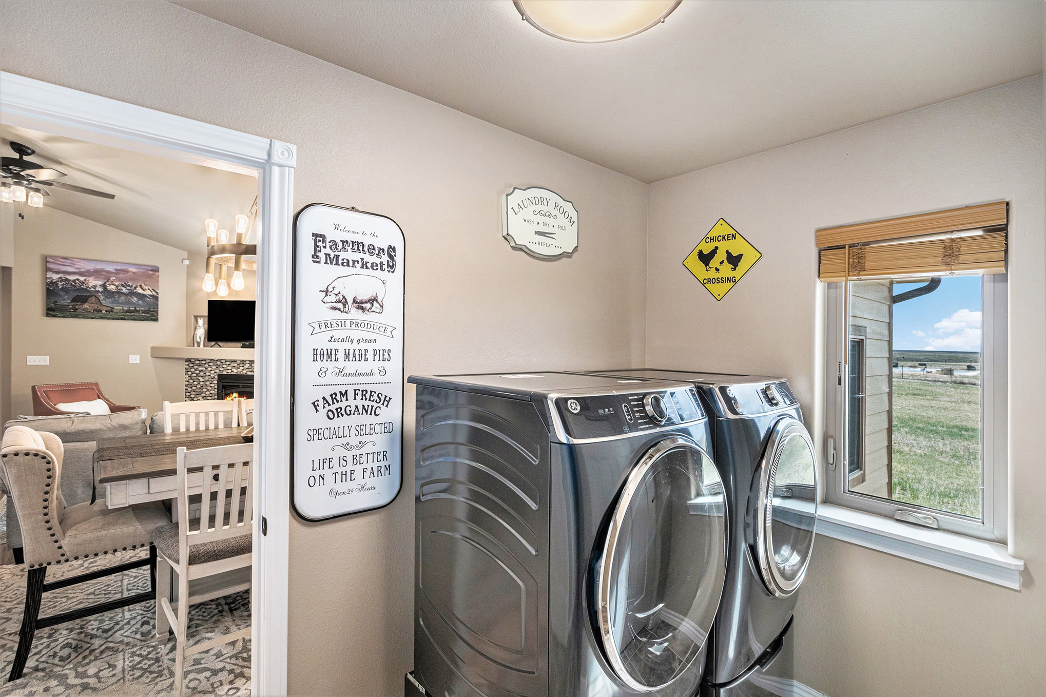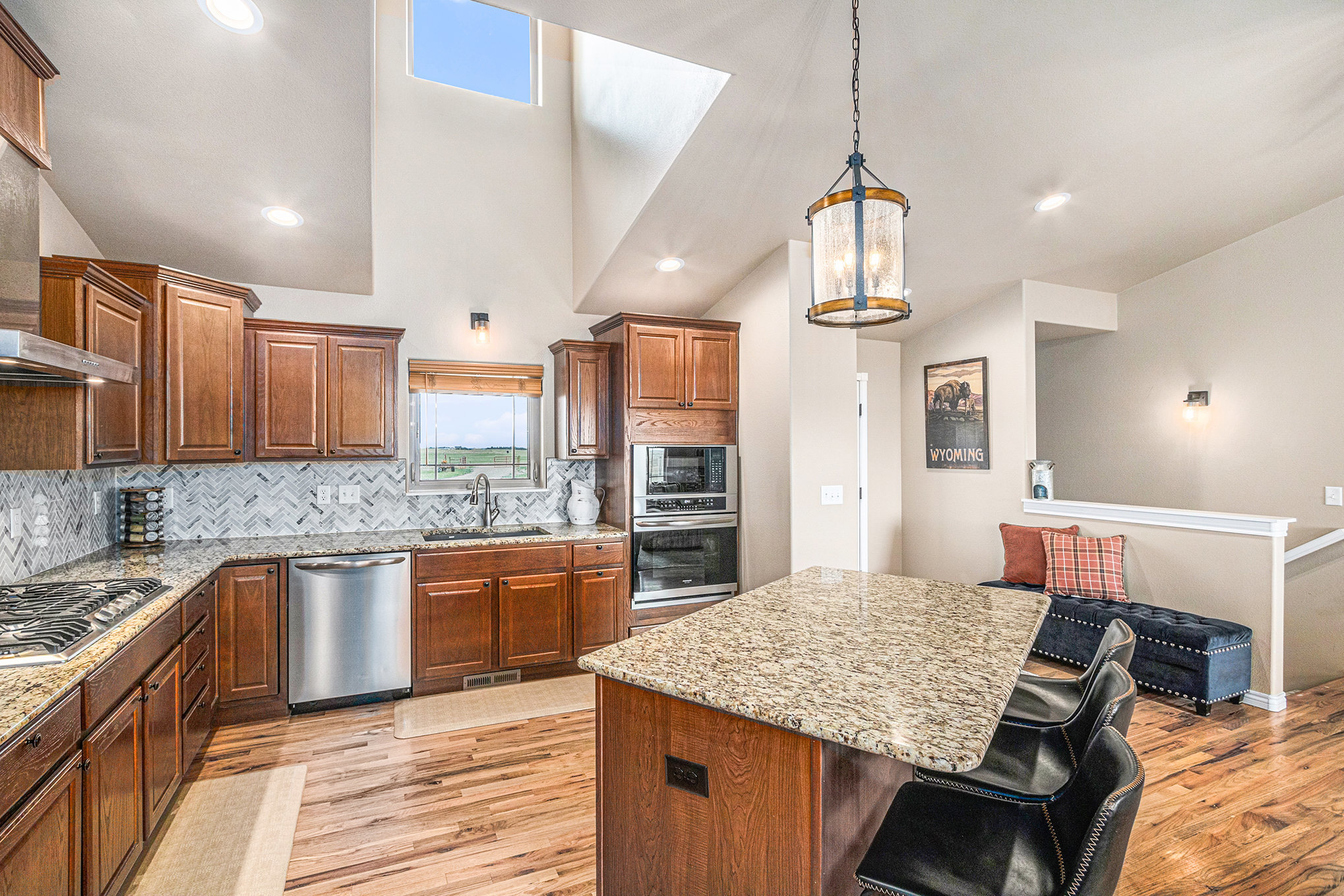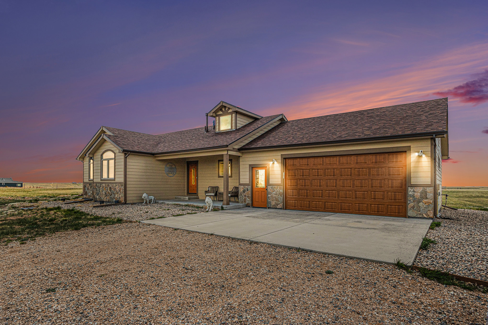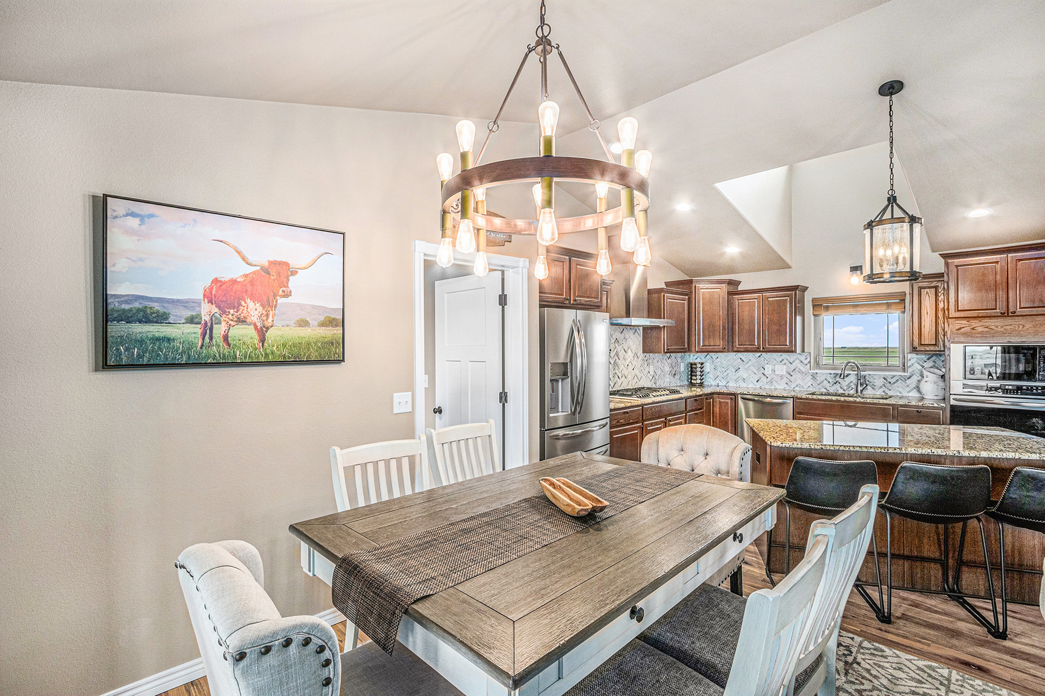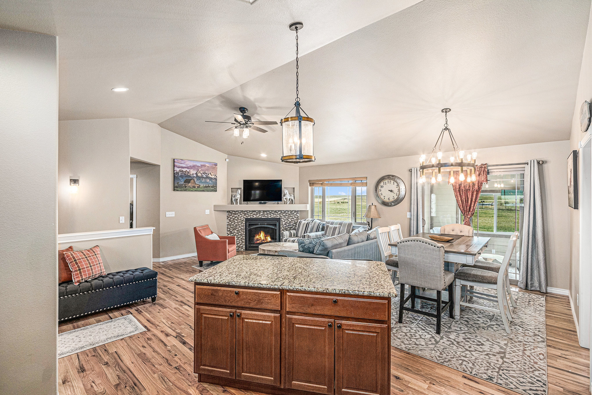 Soft light spills across the Wyoming plains as you settle into the calm of Ayu Ranch, where crisp air and quiet prairie views set the tone for your stay. Inside, warmth rises from the indoor fireplace while the snow-dusted landscape stretches beyond wide windows. Whether you’re gathered in the living room with family or watching the stars from the bubbling hot tub, each moment here invites you to unwind and reconnect.