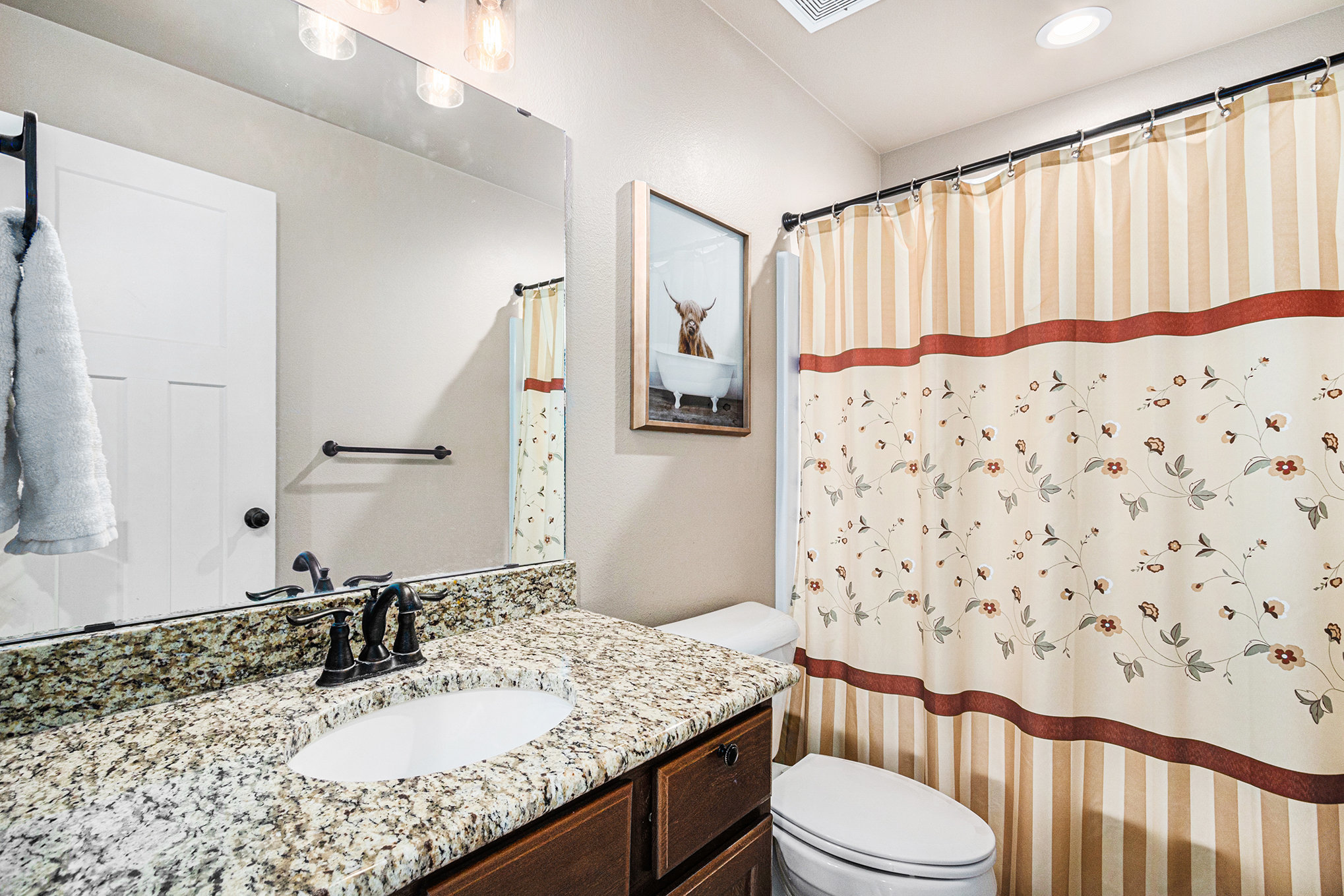 With space for up to 11 guests, Ayu Ranch offers five inviting bedrooms and six beds. The primary suite includes a king bed and private ensuite bath with a tub, while three bedrooms each feature queen beds. The fifth bedroom offers both a full and twin bed, making it ideal for flexible group stays. Three full bathrooms ensure convenience, one ensuite and two with shower/tub combinations, each stocked with bathroom essentials.