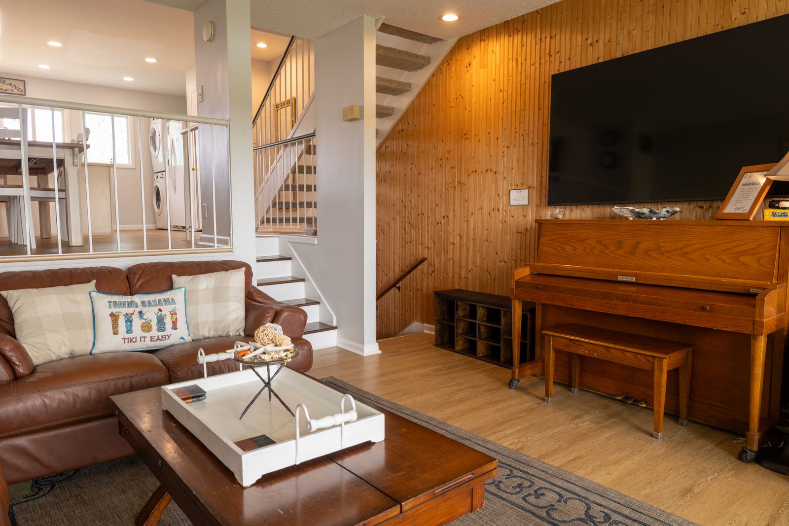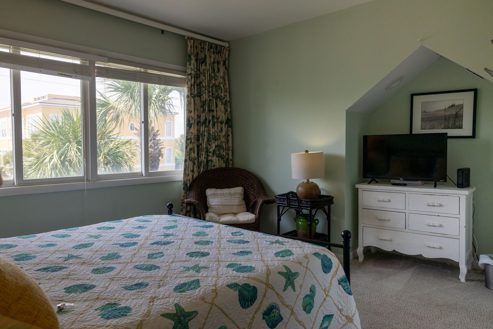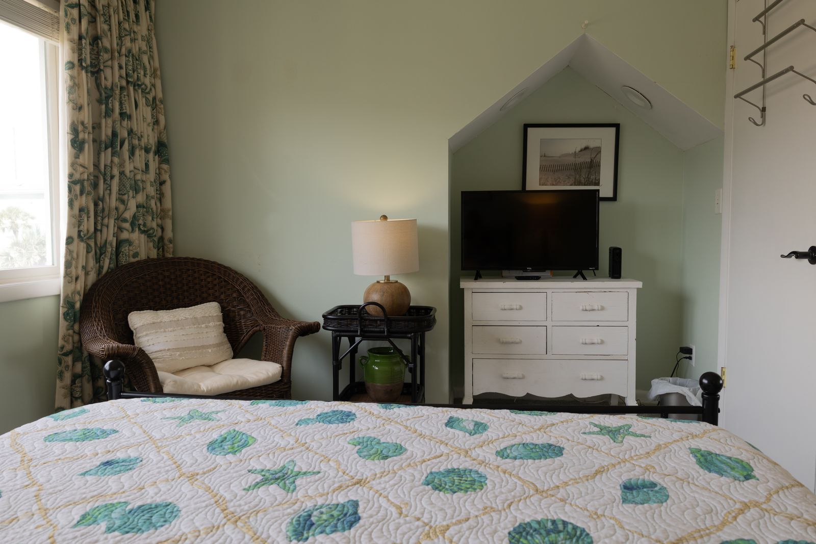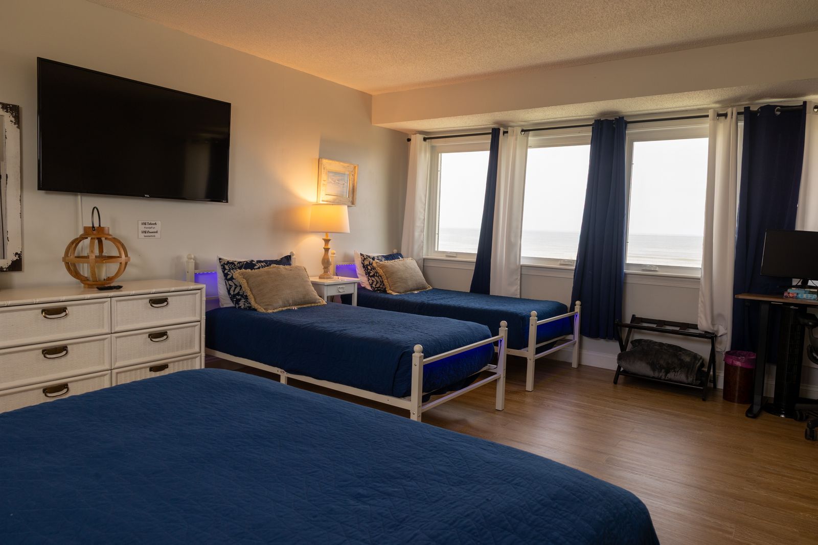 The upstairs bedroom is perfect for kids. There's a large TV for them to watch shows, assuming they have the energy after a long day at the beach. Gorgeous idyllic views of the ocean. For anyone working from home, the top room also has a desk, computer monitor, and printer. A treadmill with a desk and large-mounted screen also available for those looking to fit their steps in!!