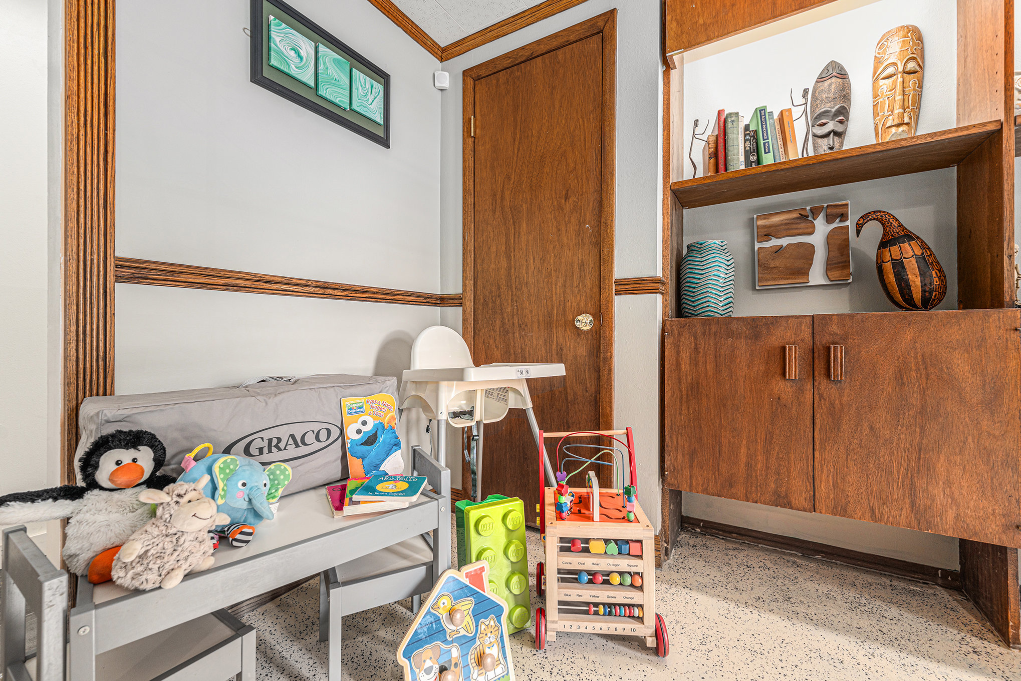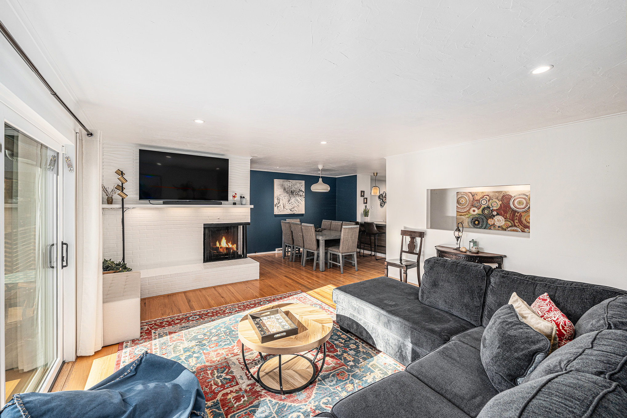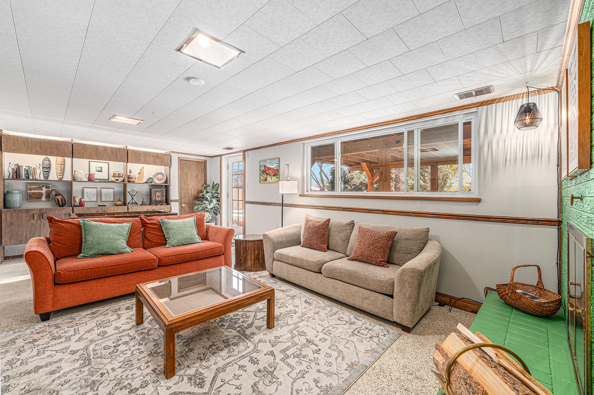 This home features two inviting living rooms, each with its own unique charm. Upstairs, the main living room offers a cozy sectional and a 65” TV, perfect for movie nights or nostalgic game marathons.