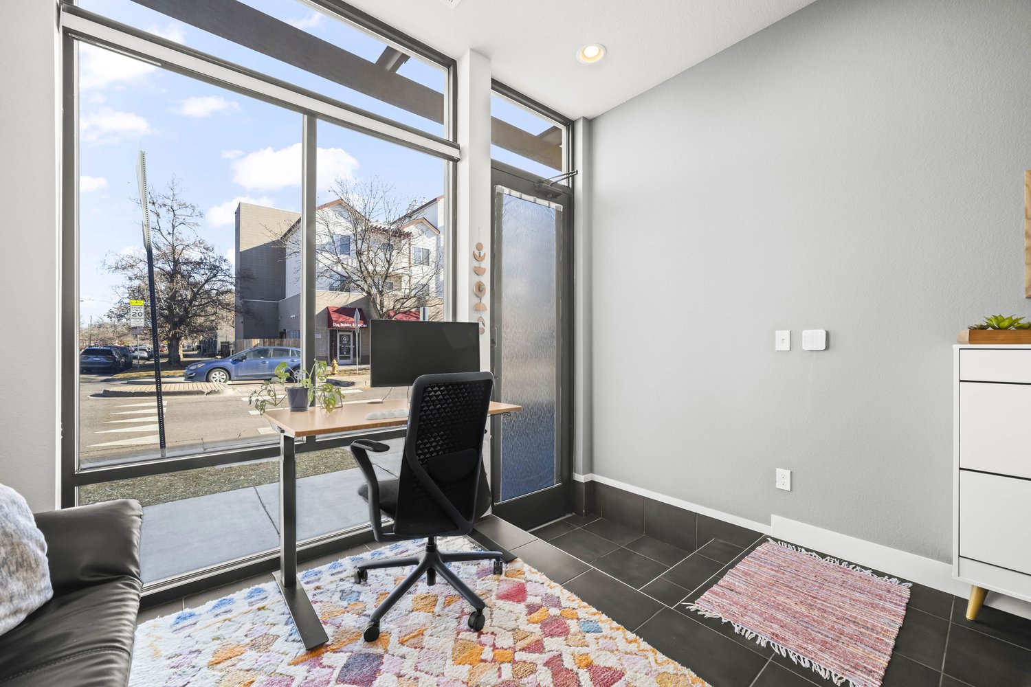 A bright, light-filled flex space space offers a dedicated work area with a desk, monitor, and ergonomic chair. This versatile room also features a futon that converts into an additional sleeping space, making it both functional and flexible for work or rest. A convenient half bathroom is located in the main area, making the space easy and practical for everyday use.