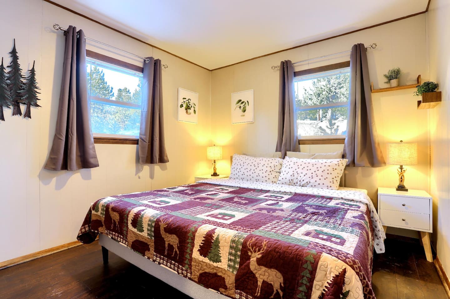 The cabin accommodates up to 12 guests across 6 bedrooms with 6 beds and 4 baths. Each space combines natural textures with mountain-inspired furnishings, offering soft bedding, room-darkening shades, and plenty of warmth. Bedrooms feature comfortable beds and essentials, with extra pillows and blankets to keep you cozy through cool alpine evenings.