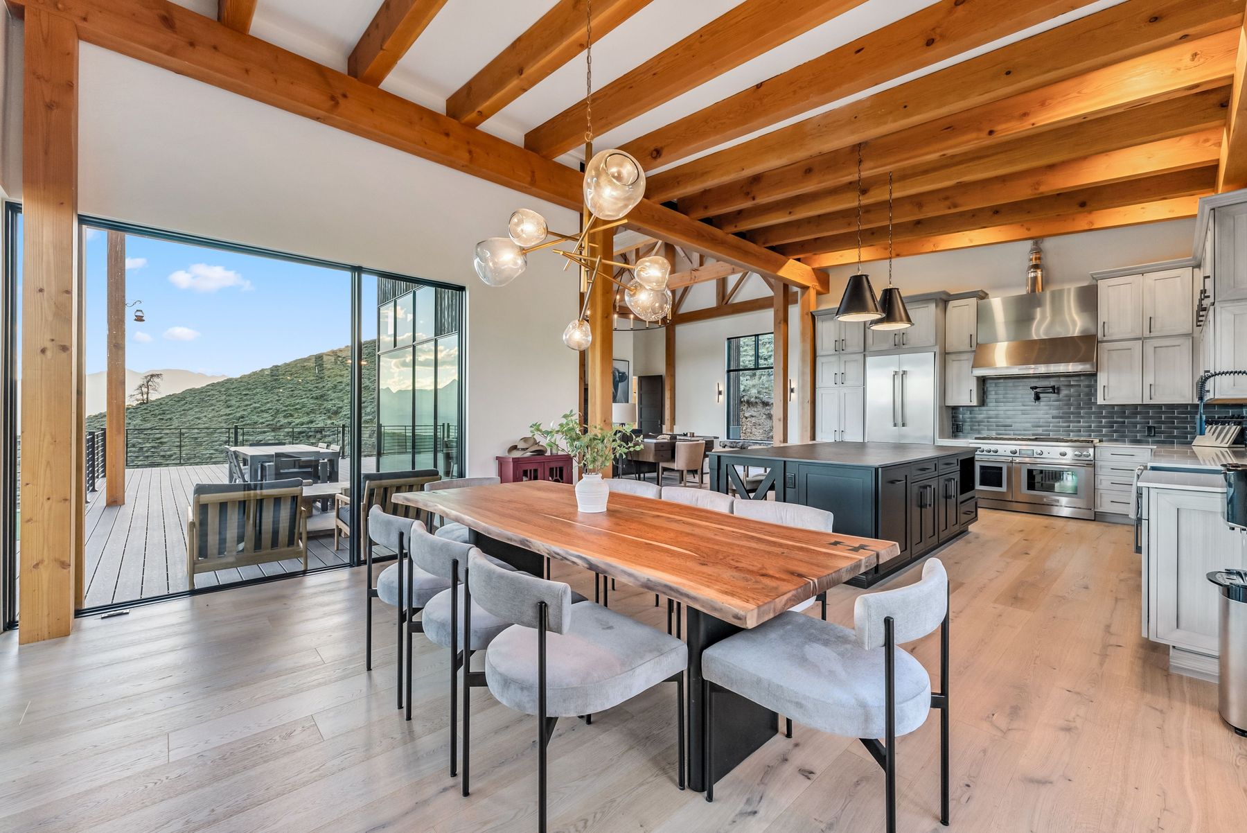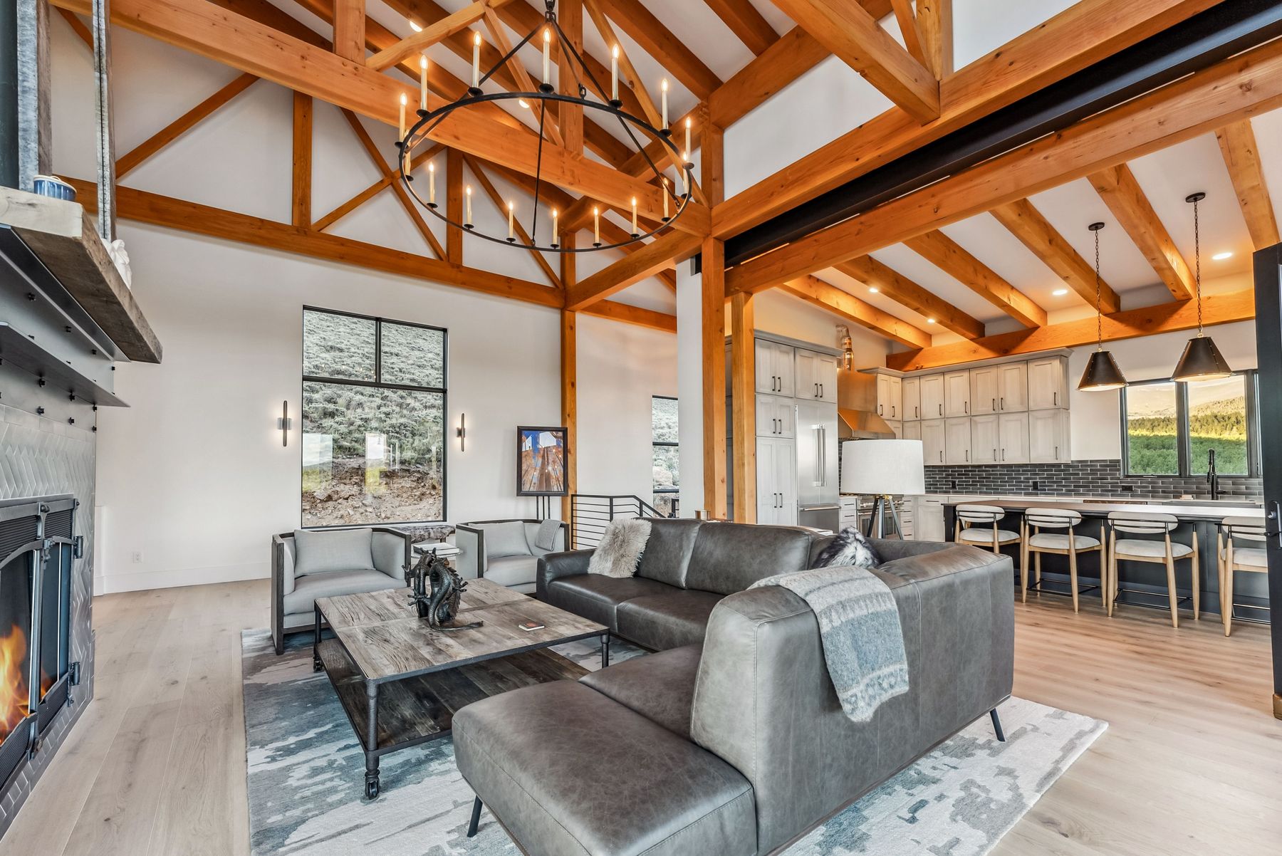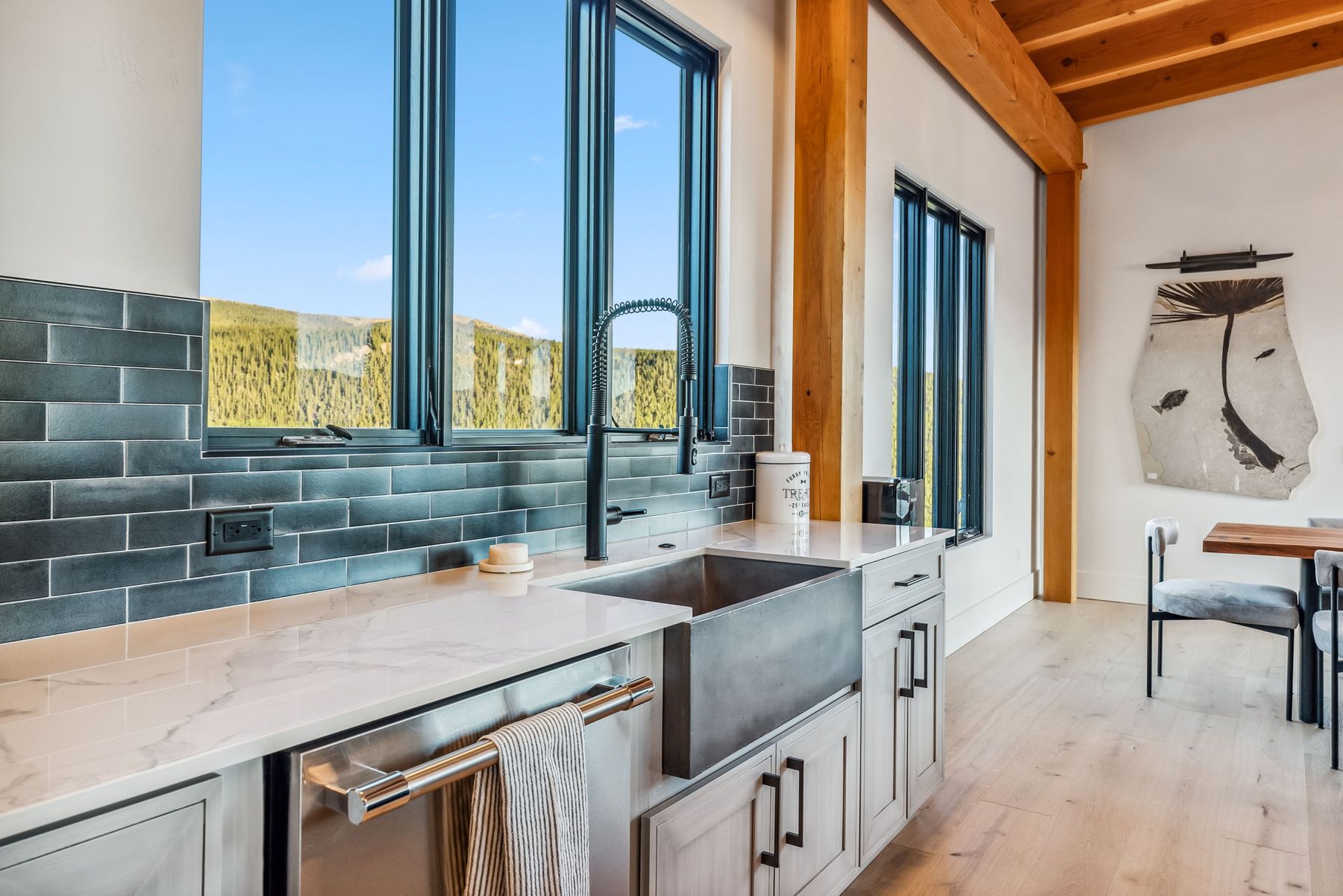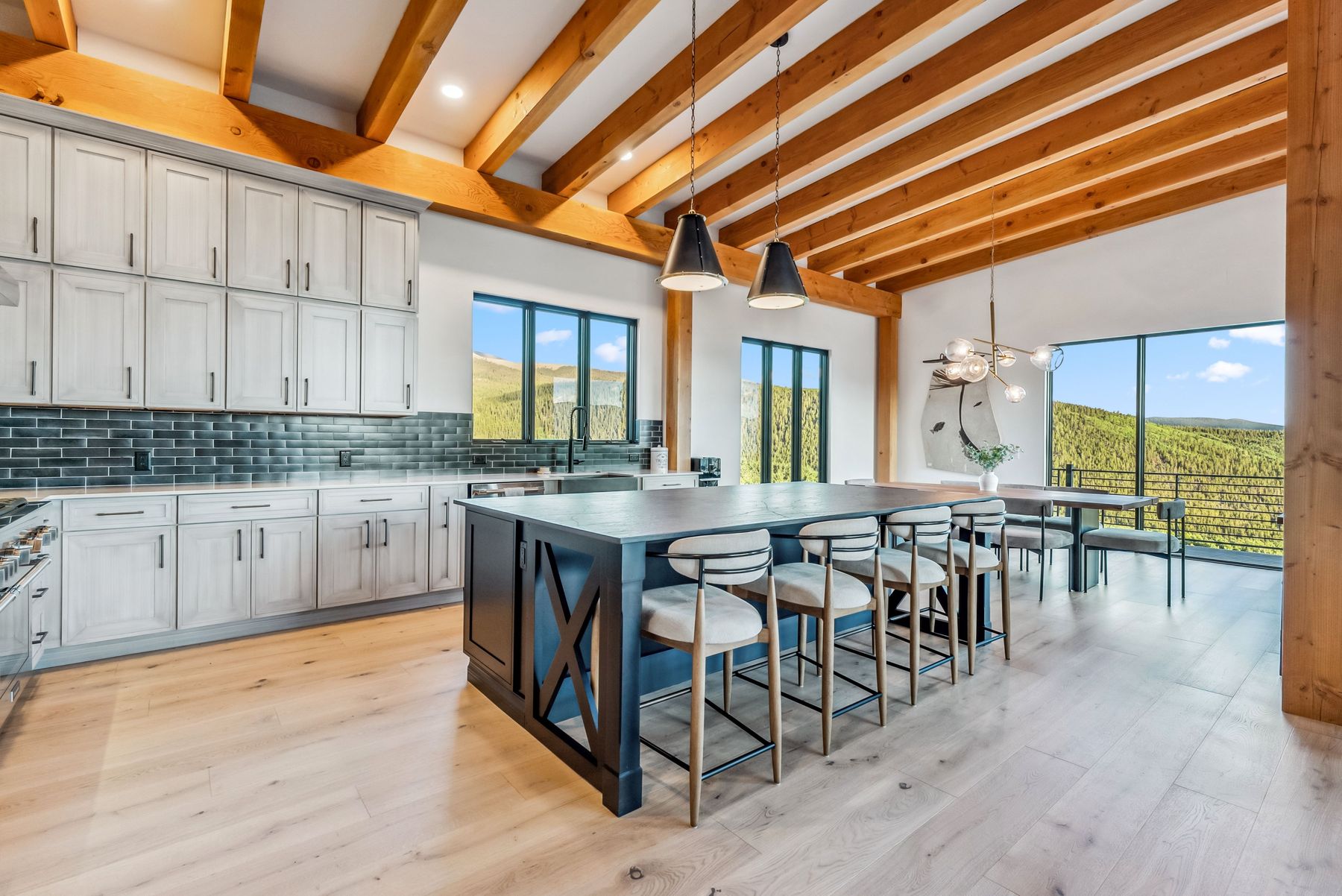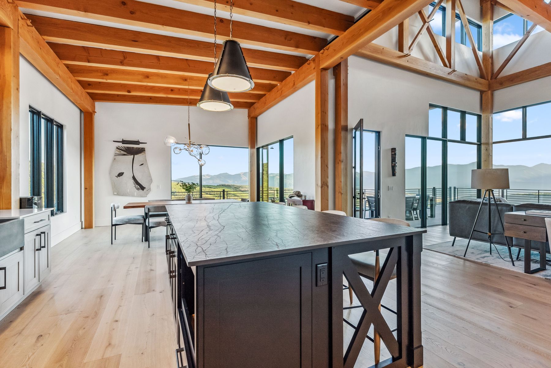 The living room invites you to unwind in style, with large windows that fill the space with natural light and frame serene views of the surrounding nature—proof that no screen can compete with the beauty outside. The chic design and open layout seamlessly connect the living, dining, and kitchen areas, creating an inviting space to relax, gather, or entertain. A striking, oversized fireplace anchors the room, offering the ultimate cozy retreat after a day of mountain adventures.