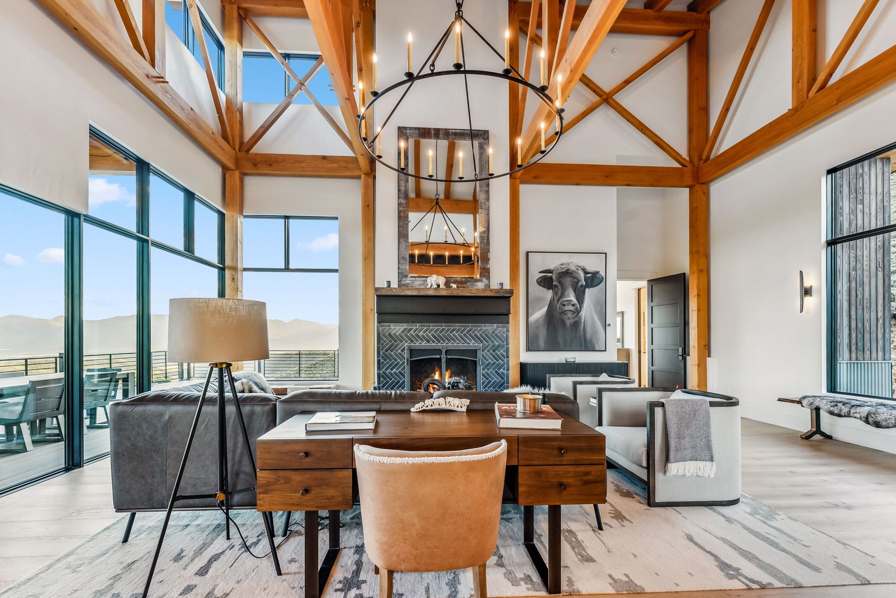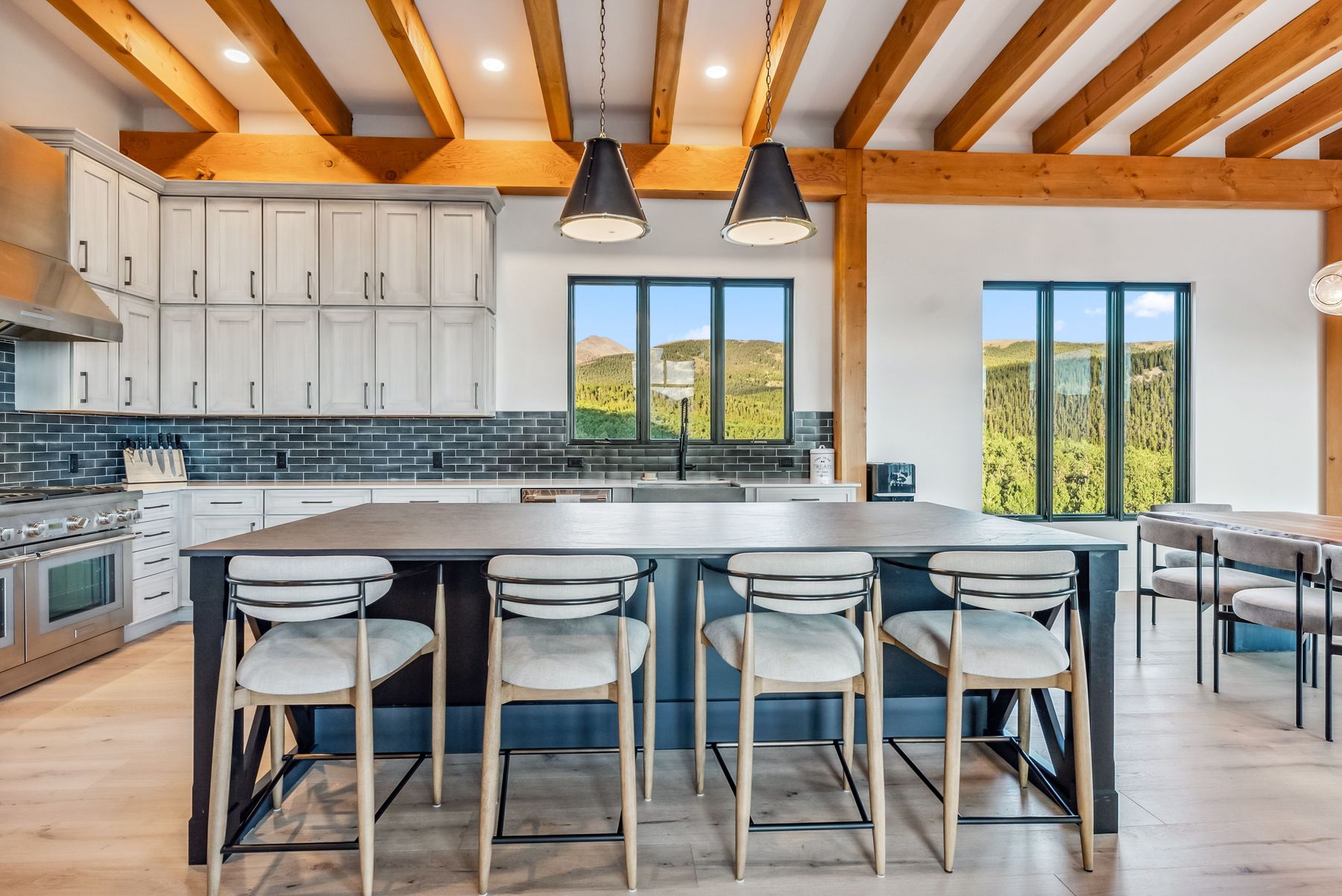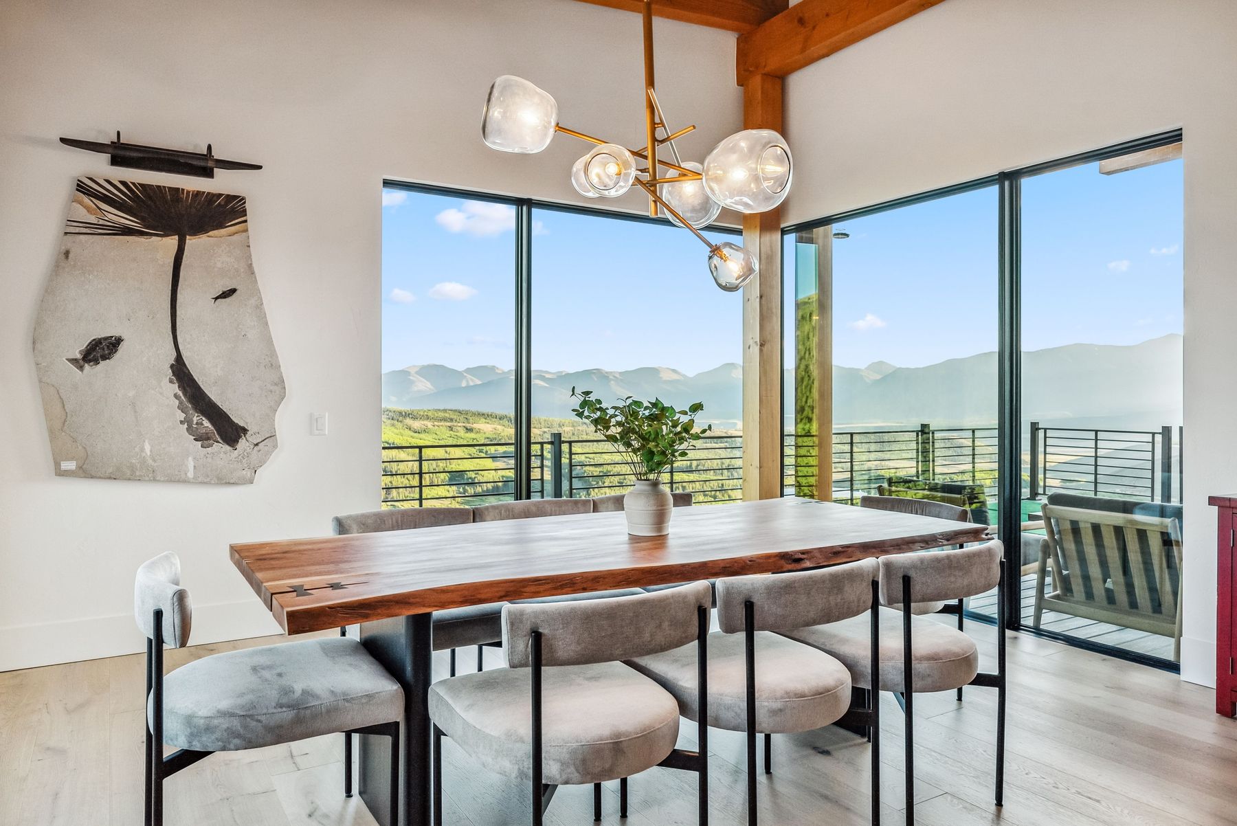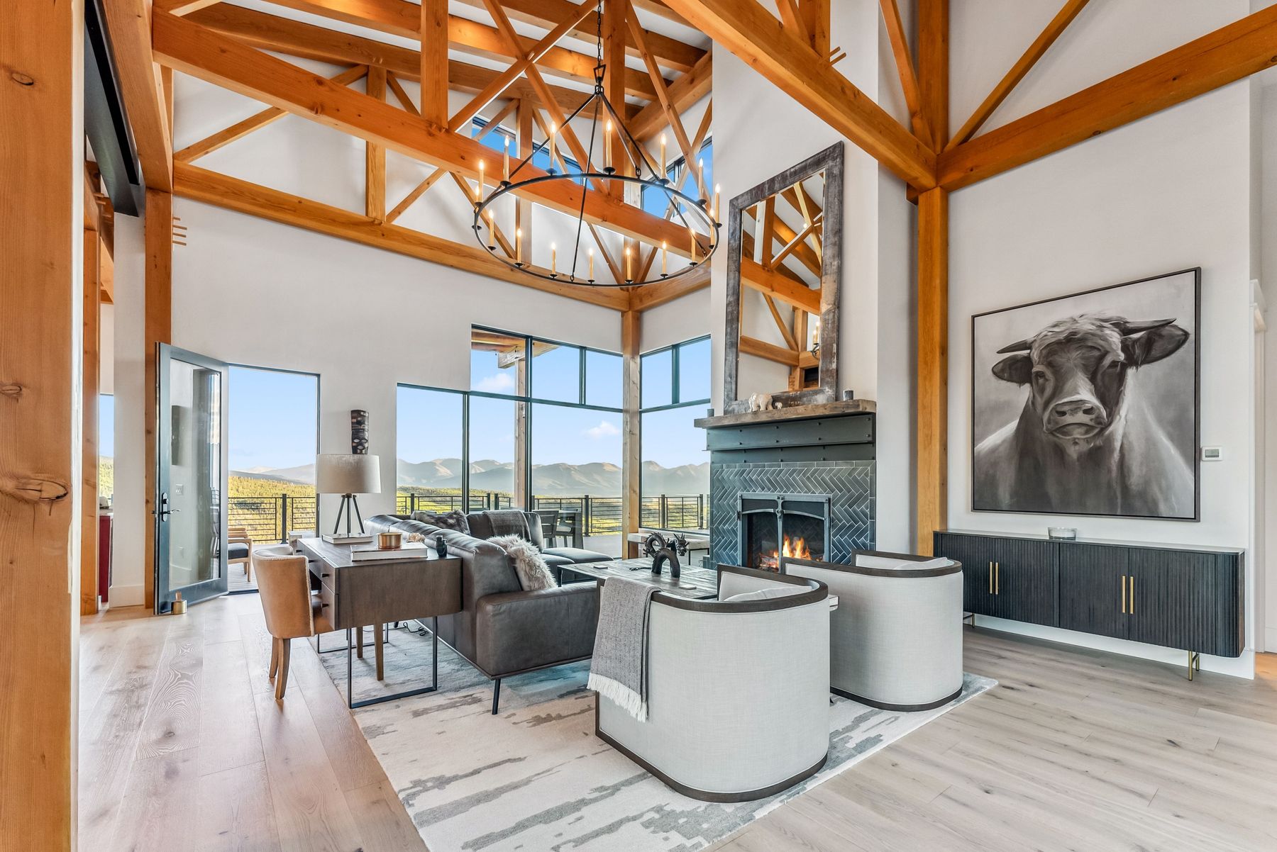 The living room invites you to unwind in style, with large windows that fill the space with natural light and frame serene views of the surrounding nature—proof that no screen can compete with the beauty outside. The chic design and open layout seamlessly connect the living, dining, and kitchen areas, creating an inviting space to relax, gather, or entertain. A striking, oversized fireplace anchors the room, offering the ultimate cozy retreat after a day of mountain adventures.