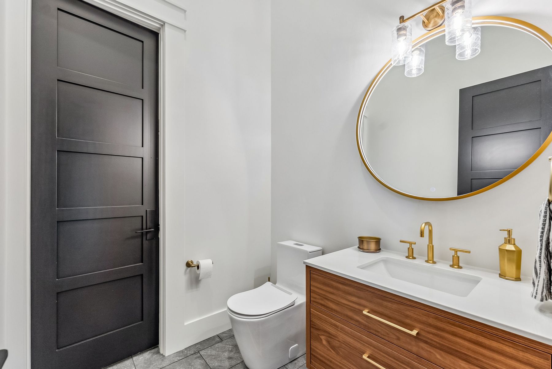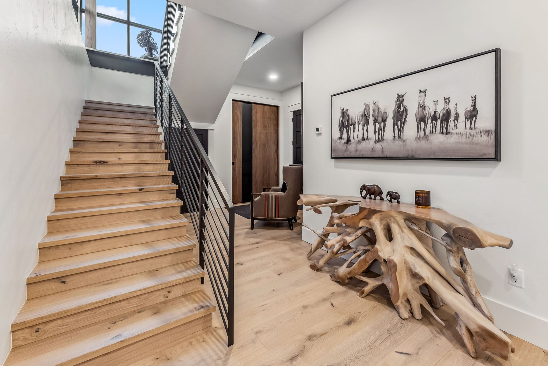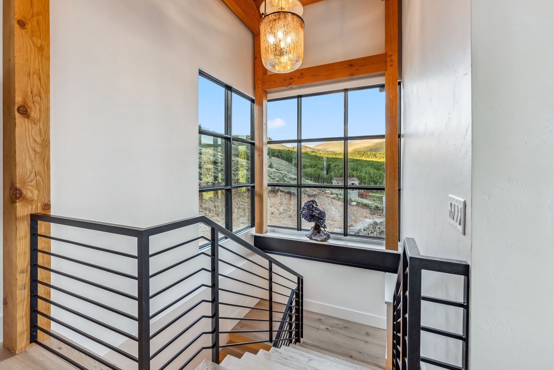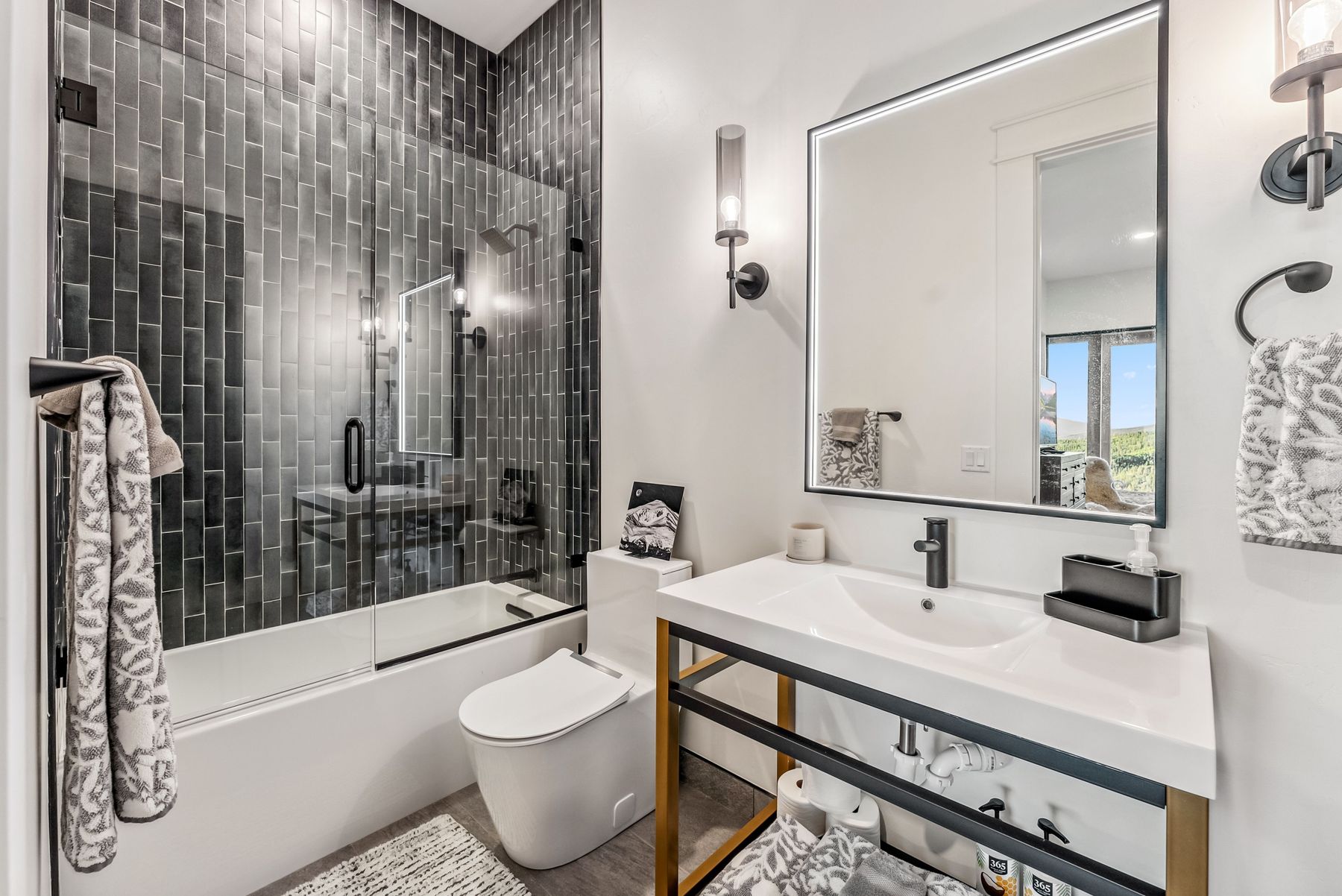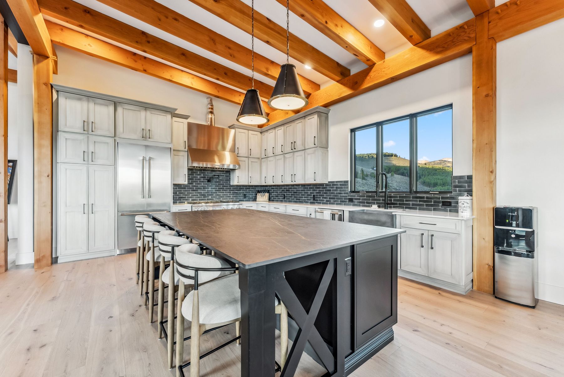 The living room invites you to unwind in style, with large windows that fill the space with natural light and frame serene views of the surrounding nature—proof that no screen can compete with the beauty outside. The chic design and open layout seamlessly connect the living, dining, and kitchen areas, creating an inviting space to relax, gather, or entertain. A striking, oversized fireplace anchors the room, offering the ultimate cozy retreat after a day of mountain adventures.