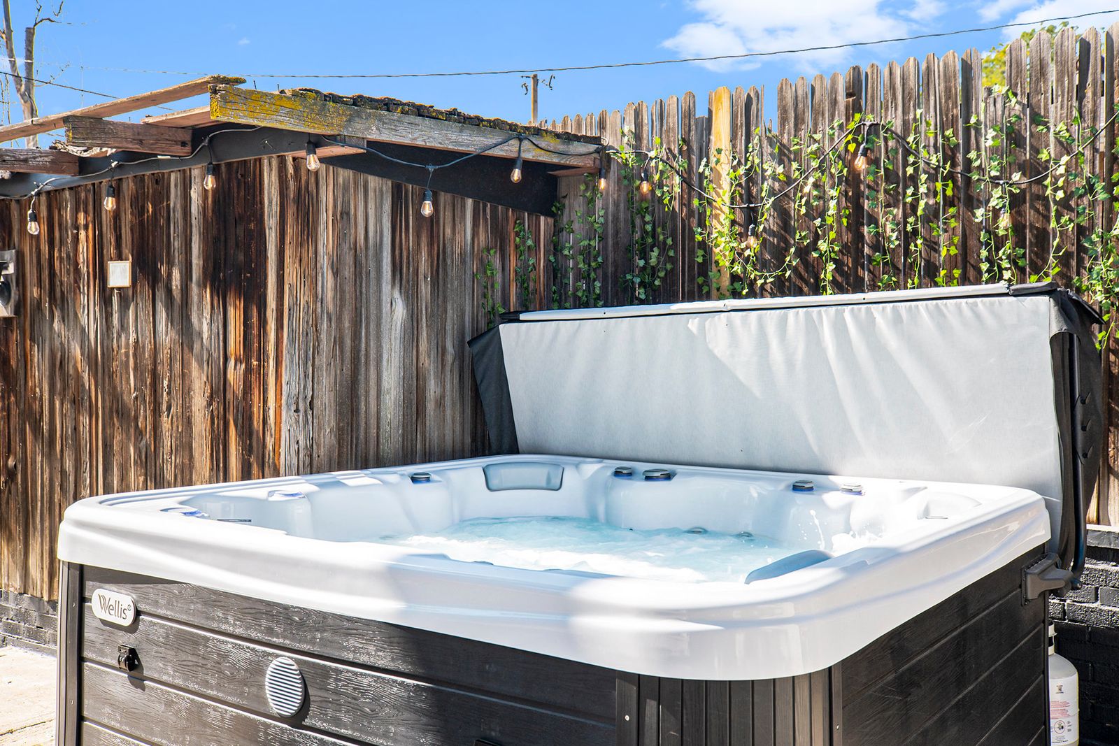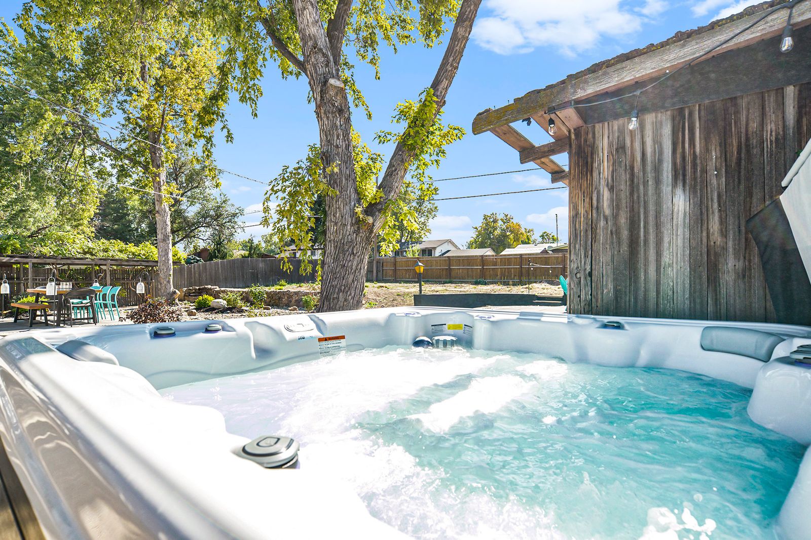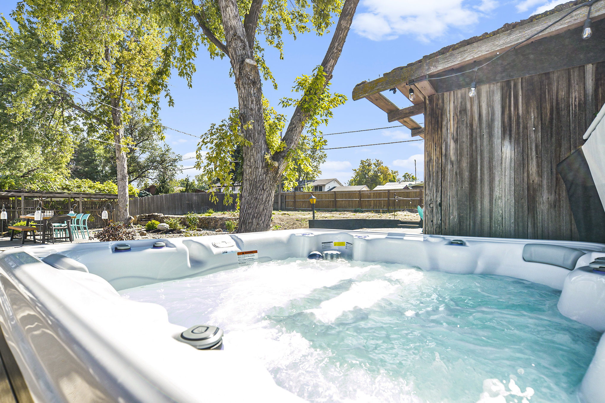 The backyard is an enchanting and lively space, perfect for both relaxation and fun. Enjoy outdoor meals at the dining table, under the glow of charming bistro lights unwind in the hot tub, or gather around the firepit for cozy evenings under the stars. While much of the yard is beautifully set up for your enjoyment, please note that as seen in the photos, a portion of the backyard is currently unfinished.