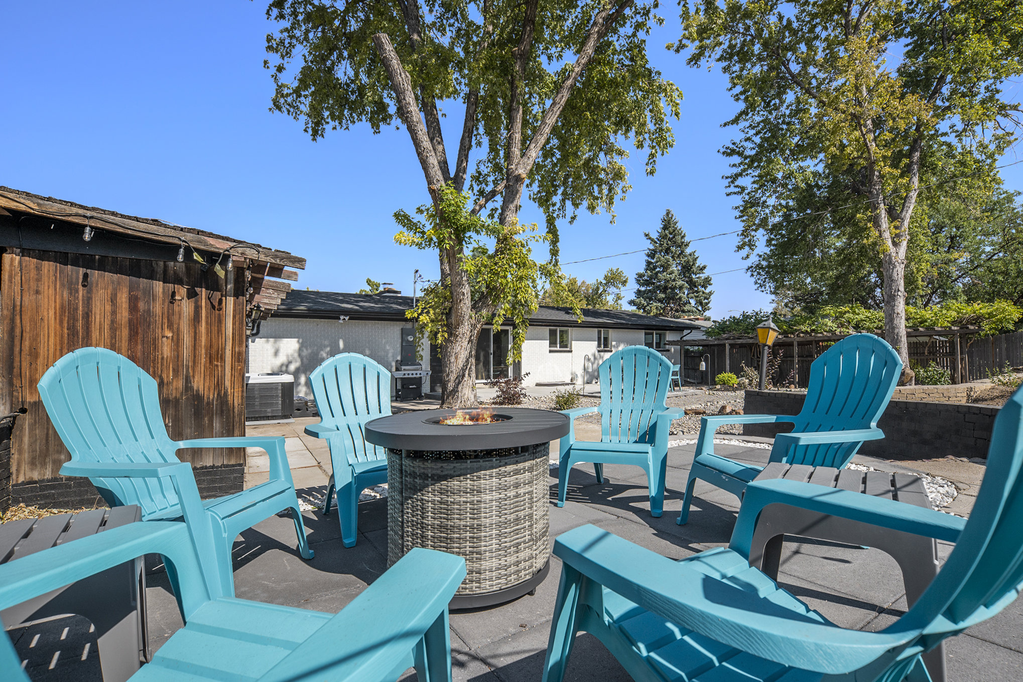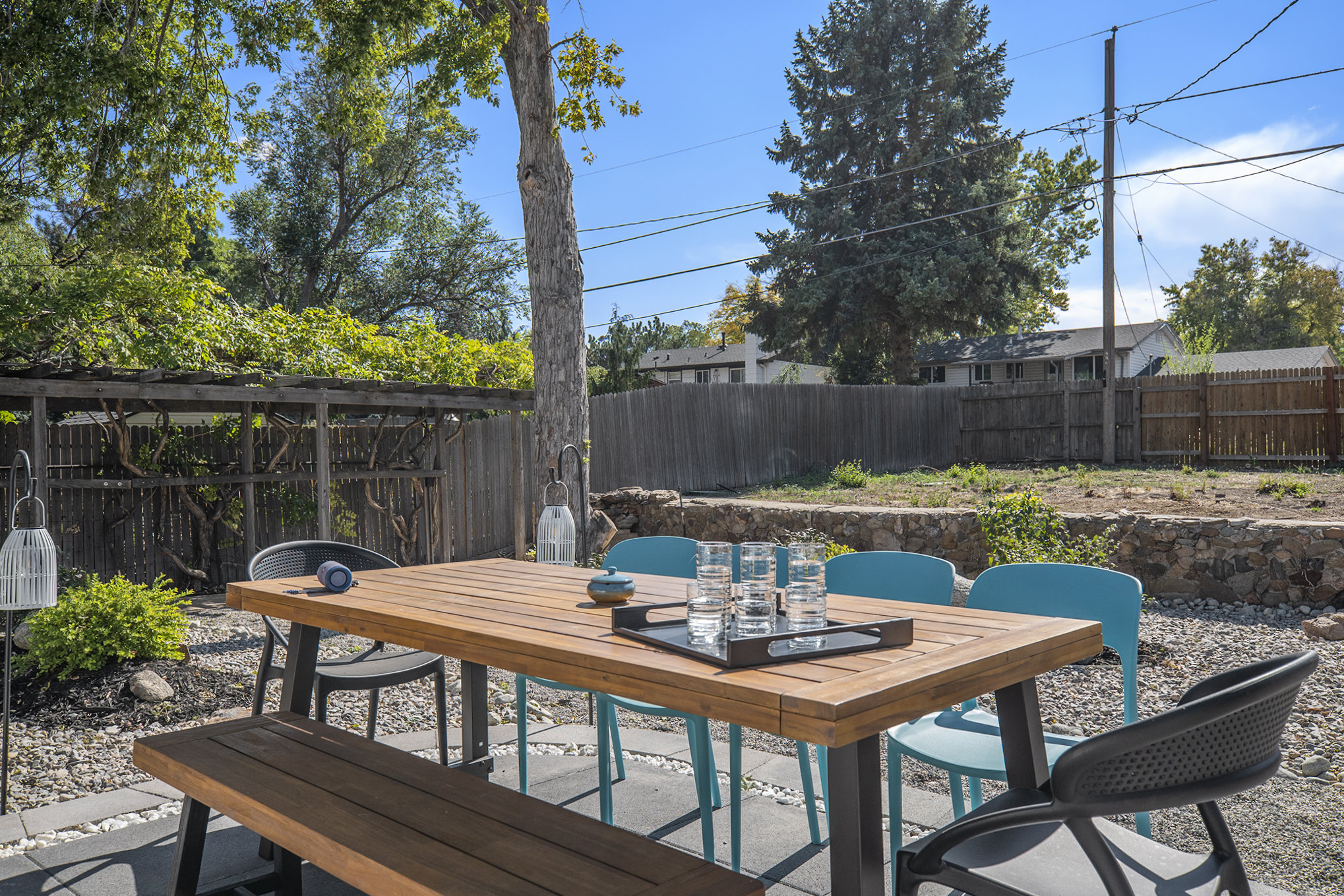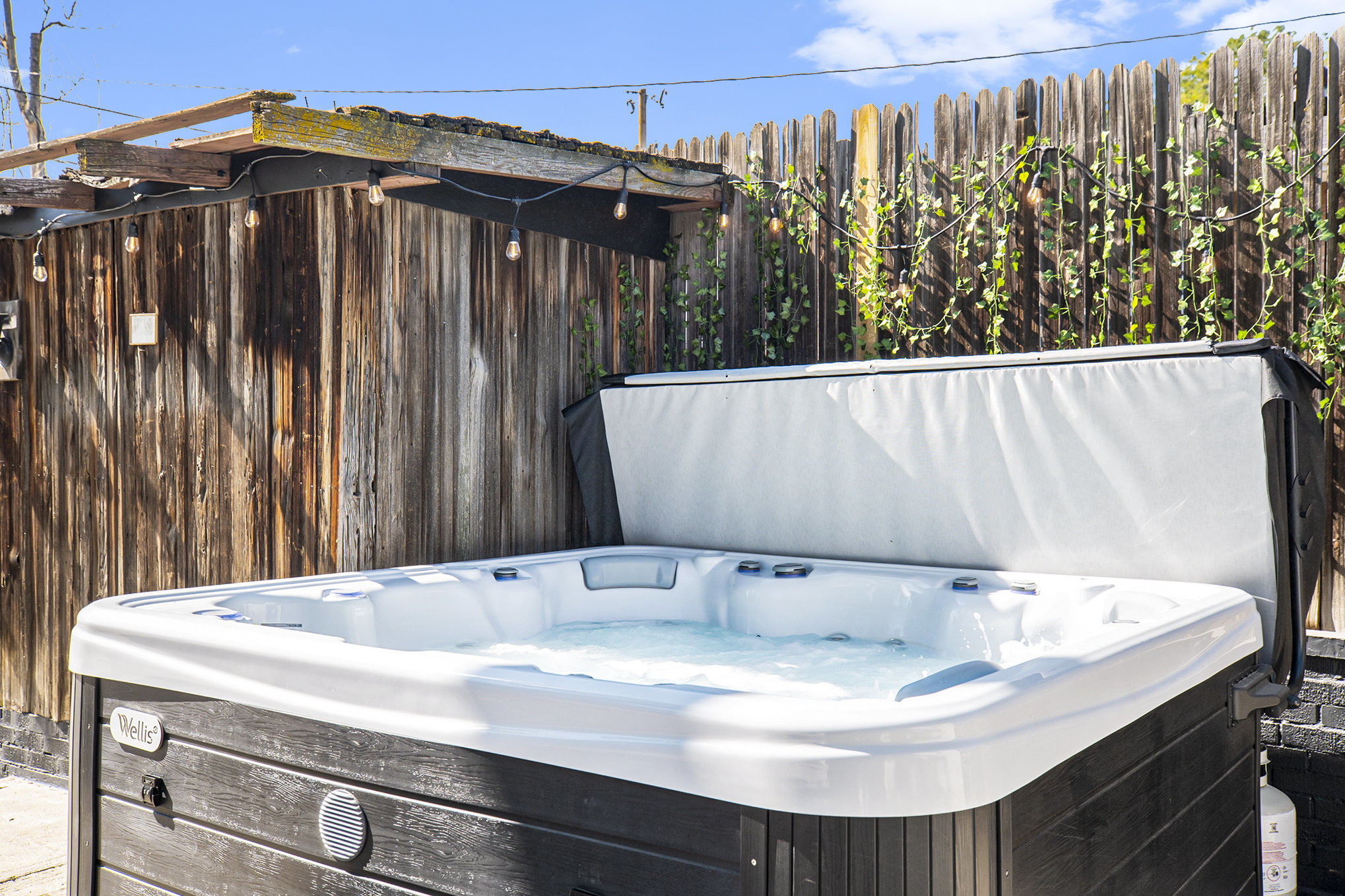 The backyard is an enchanting and lively space, perfect for both relaxation and fun. Enjoy outdoor meals at the dining table, under the glow of charming bistro lights unwind in the hot tub, or gather around the firepit for cozy evenings under the stars. While much of the yard is beautifully set up for your enjoyment, please note that as seen in the photos, a portion of the backyard is currently unfinished.