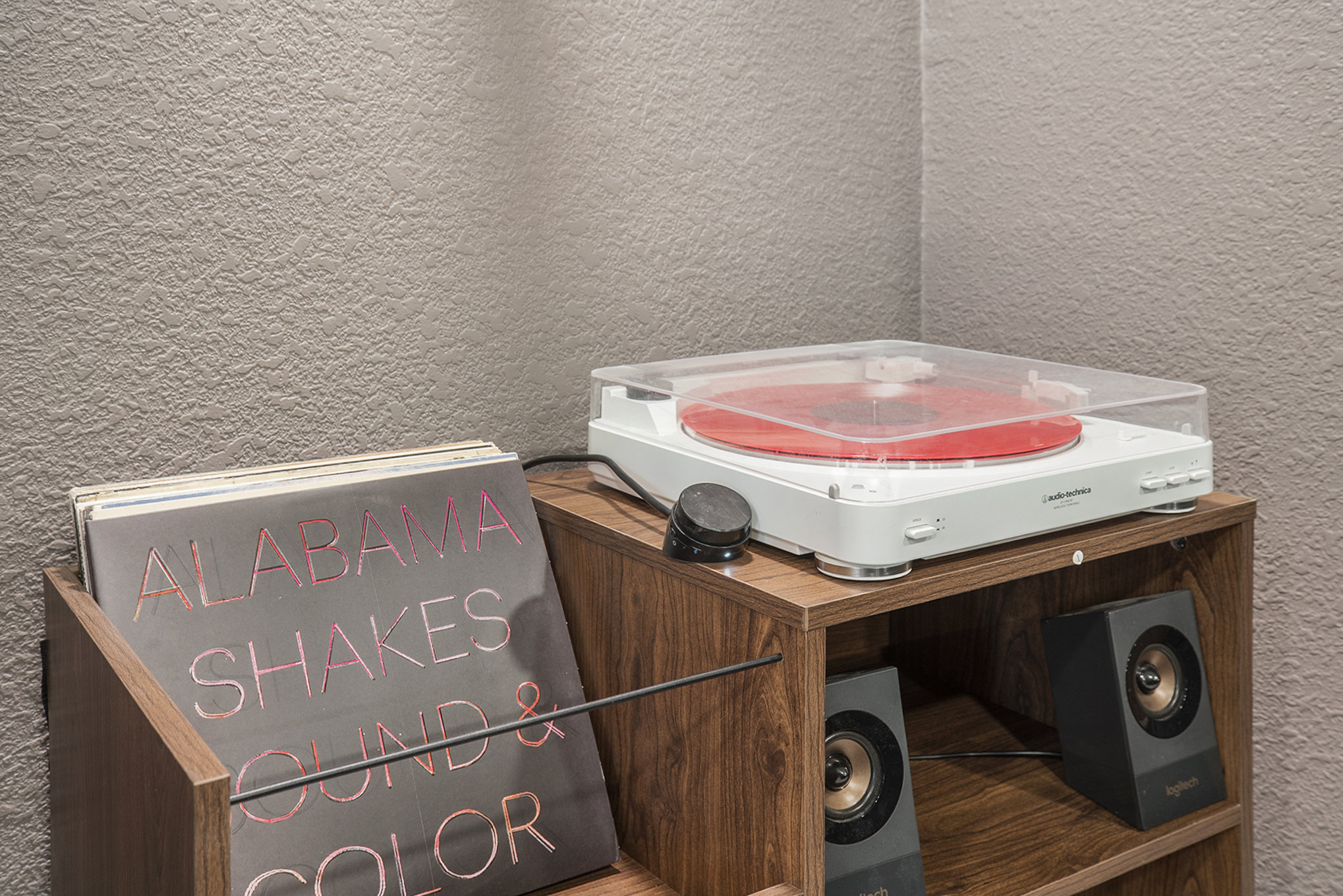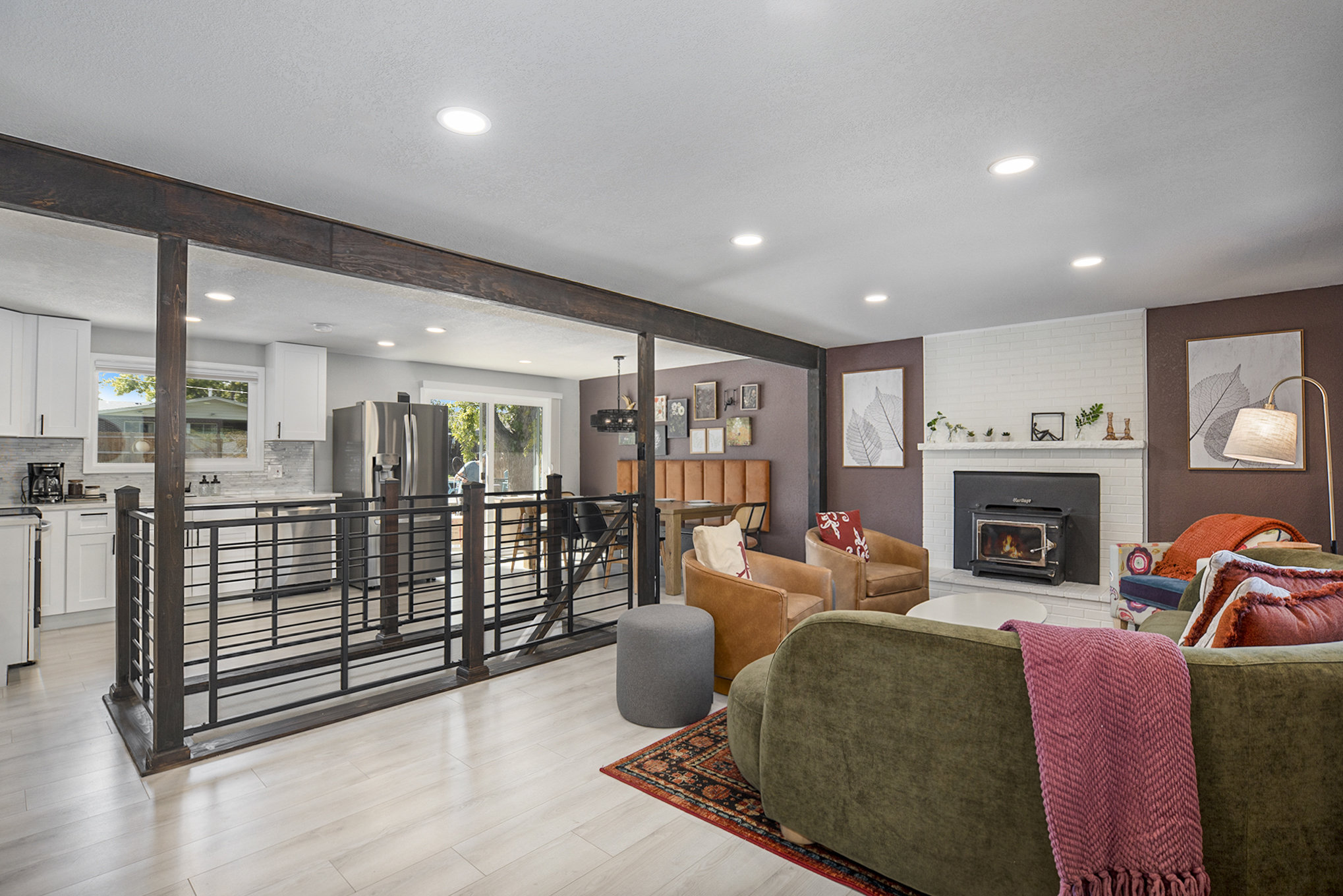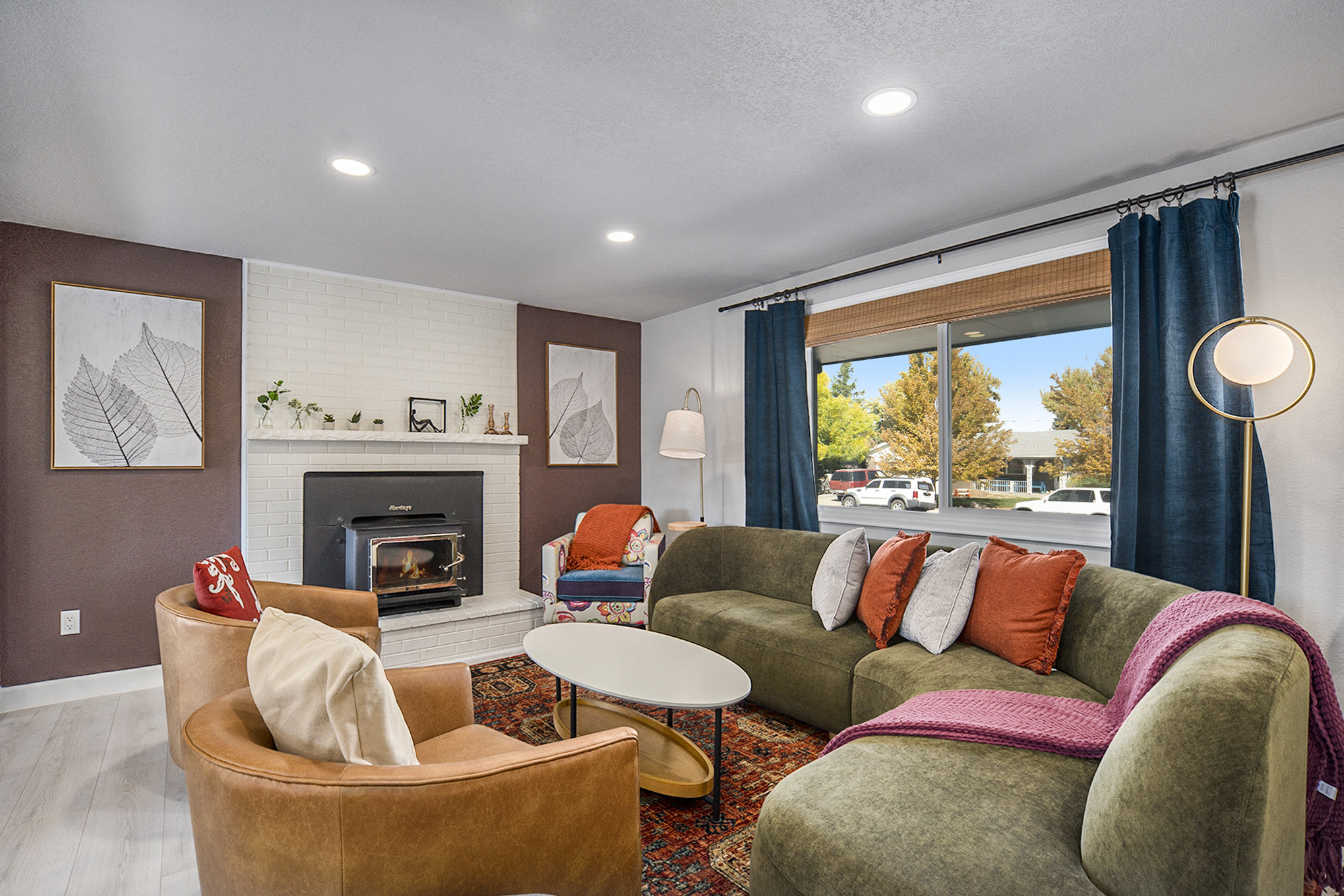 Our home features two living rooms, one upstairs and one downstairs. The upstairs space is a more formal, colorful sitting area, perfect for conversation, with a decorative fireplace that is not in use, and a TV. The downstairs living room offers a cozier atmosphere with a large, comfortable couch, a big-screen TV, a record player, and a game table stocked with board games.
