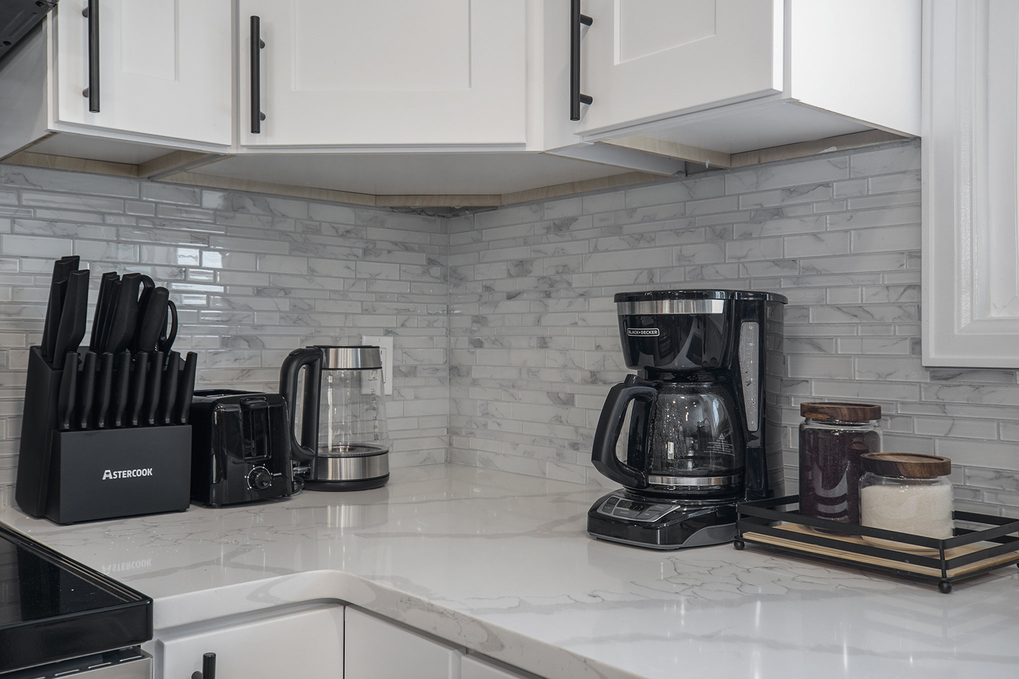 This compact kitchen is fully equipped with everything you need to prepare meals, including premium cookware, bakeware, and complete sets of plates and drinkware. Enjoy the convenience of a drip coffee maker, with plenty of complimentary coffee provided to start your mornings right!
