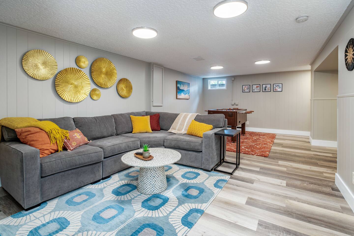 Two cozy family rooms invite relaxation, each with comfortable seating and Smart TVs. A separate game room offers a foosball table and board games for all ages, while a reading nook beside the fireplace provides the perfect spot to unwind with a book. The open layout makes it easy for everyone to gather while still finding a quiet corner when needed.