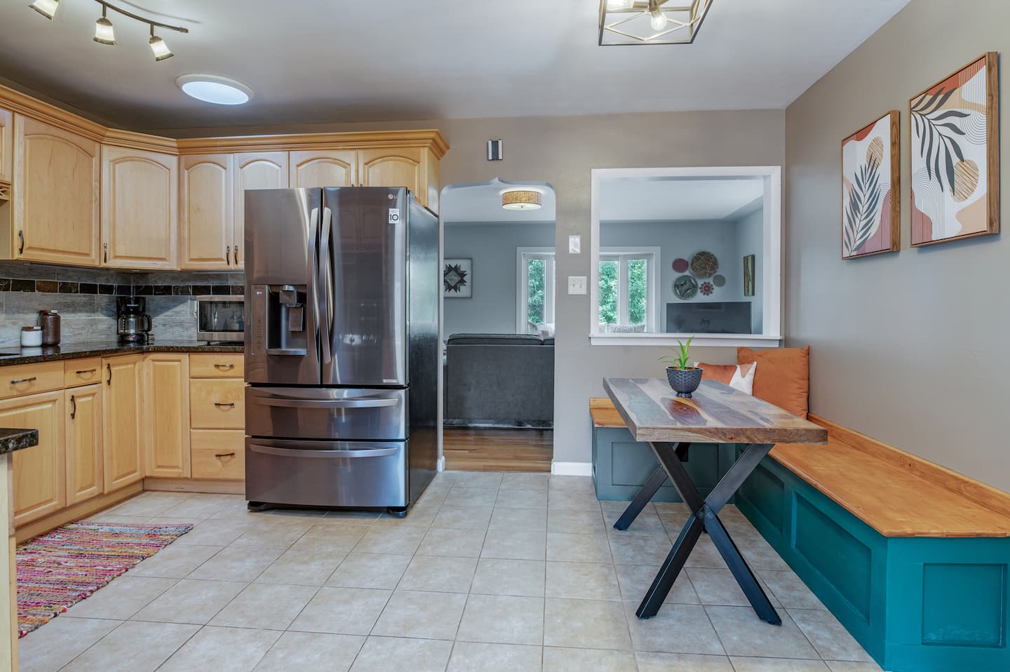 The open-concept kitchen comes fully equipped with modern appliances, cooking basics, and a dining table that seats 12. Brew your morning coffee with the coffee maker or French press, and enjoy it as sunlight filters through the windows. The nearby workspace nook offers an outlet and a comfortable setup for remote work or study sessions.