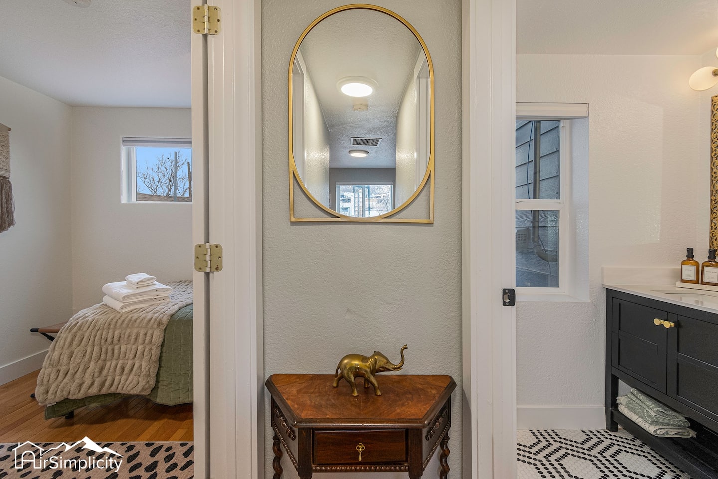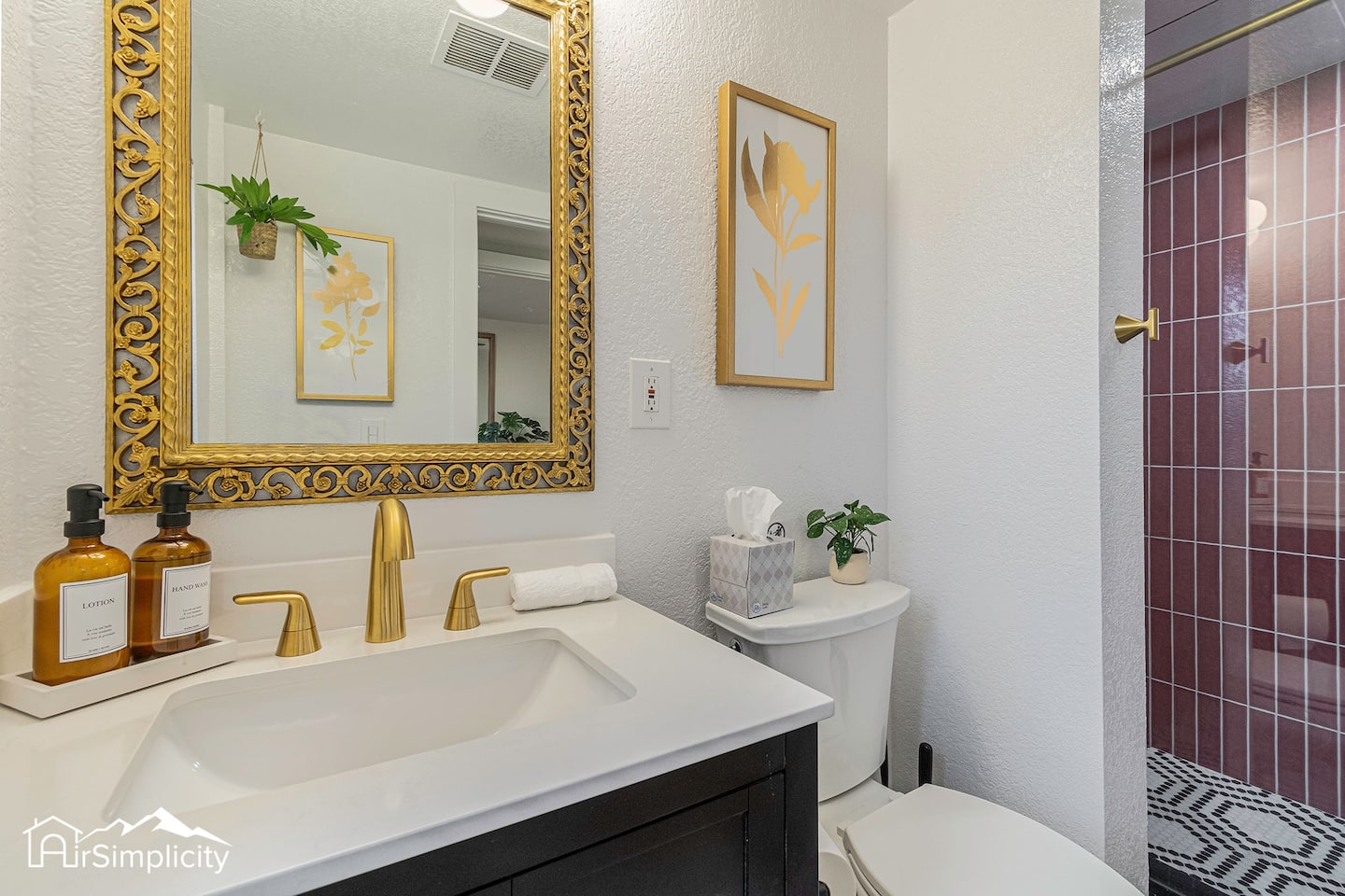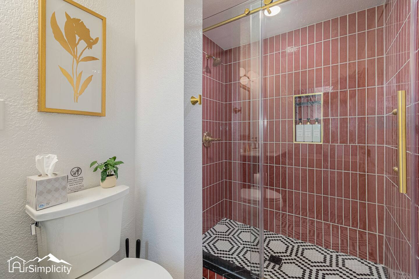 A single, beautifully remodeled bathroom features ornate tile, a walk-in glass shower, and brass accents. Stocked with bathroom essentials, it’s a serene space to refresh after exploring local shops, cafés, and parks.