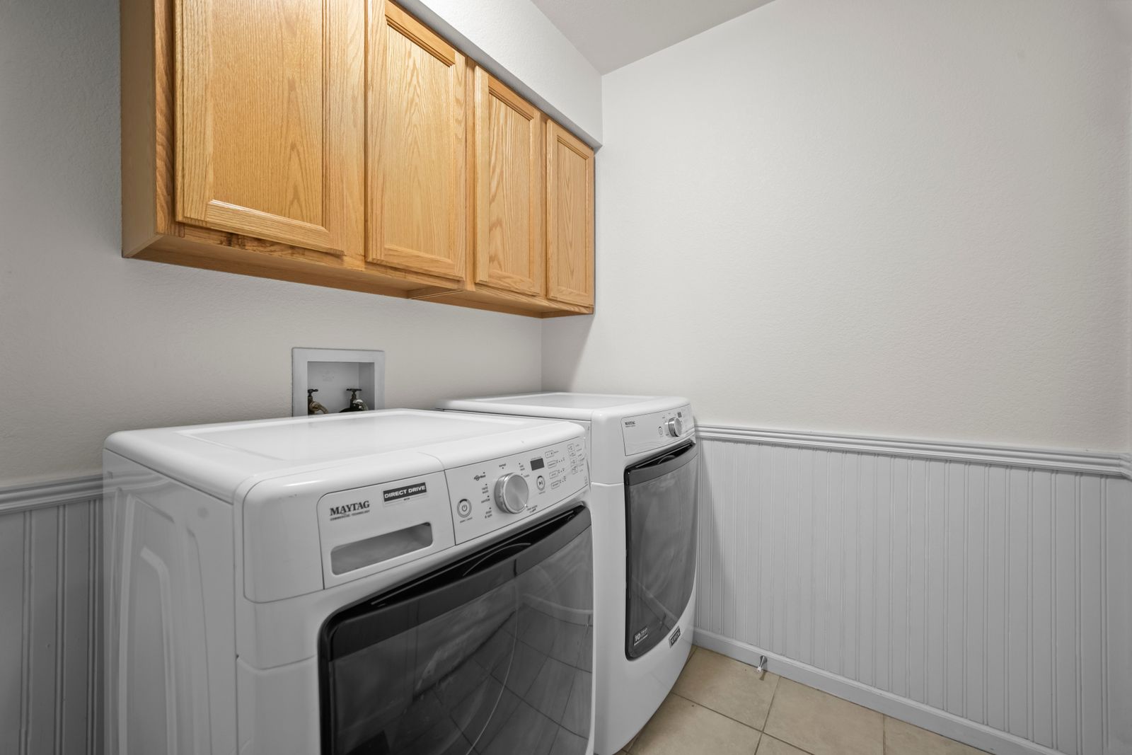 The living room invites you to kick back in style, featuring a comfortable sectional and a large TV for entertainment. Gather at the dining table, perfect for shared meals, board games, or catching up after a day of adventure. A washer and dryer are conveniently located for your use.