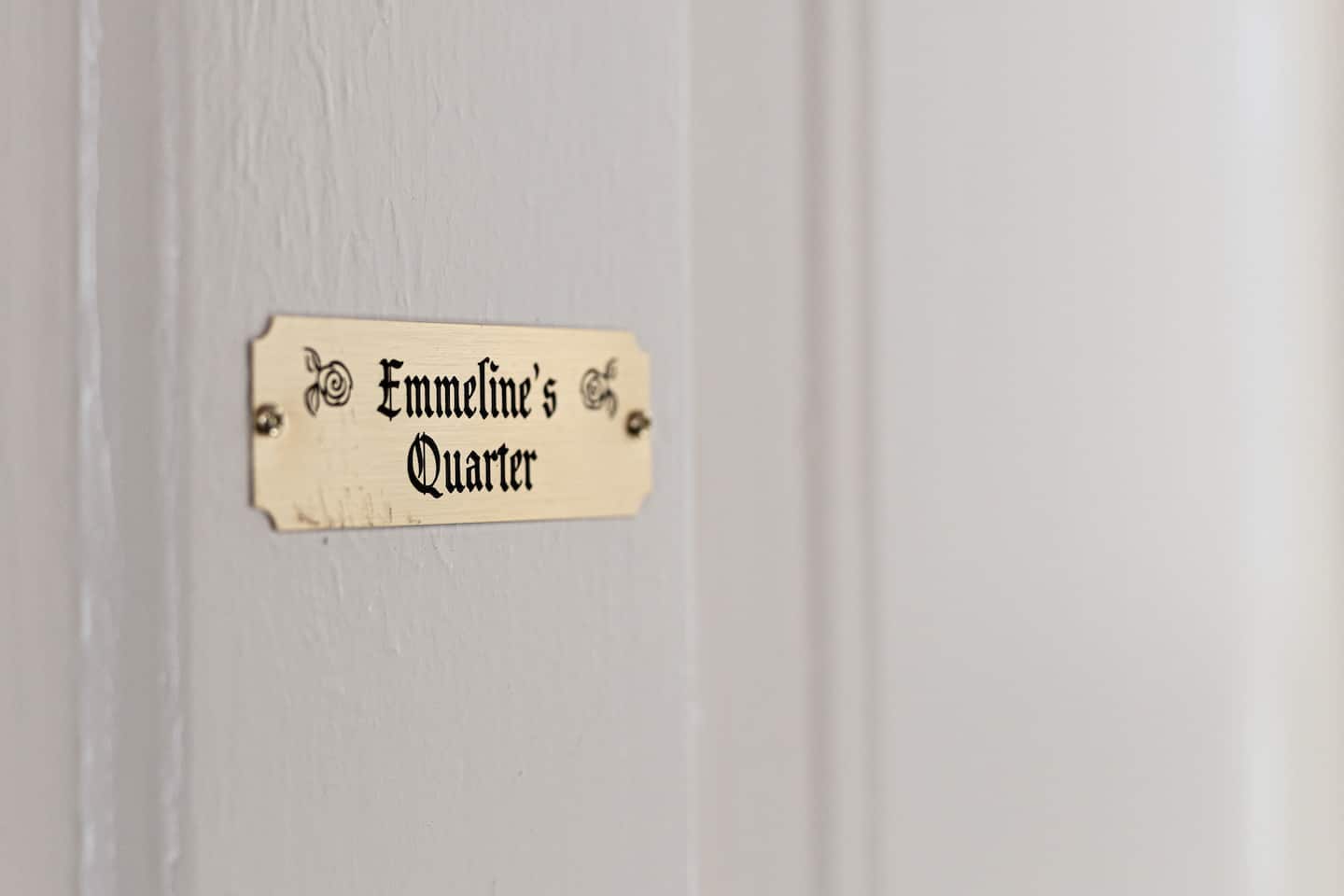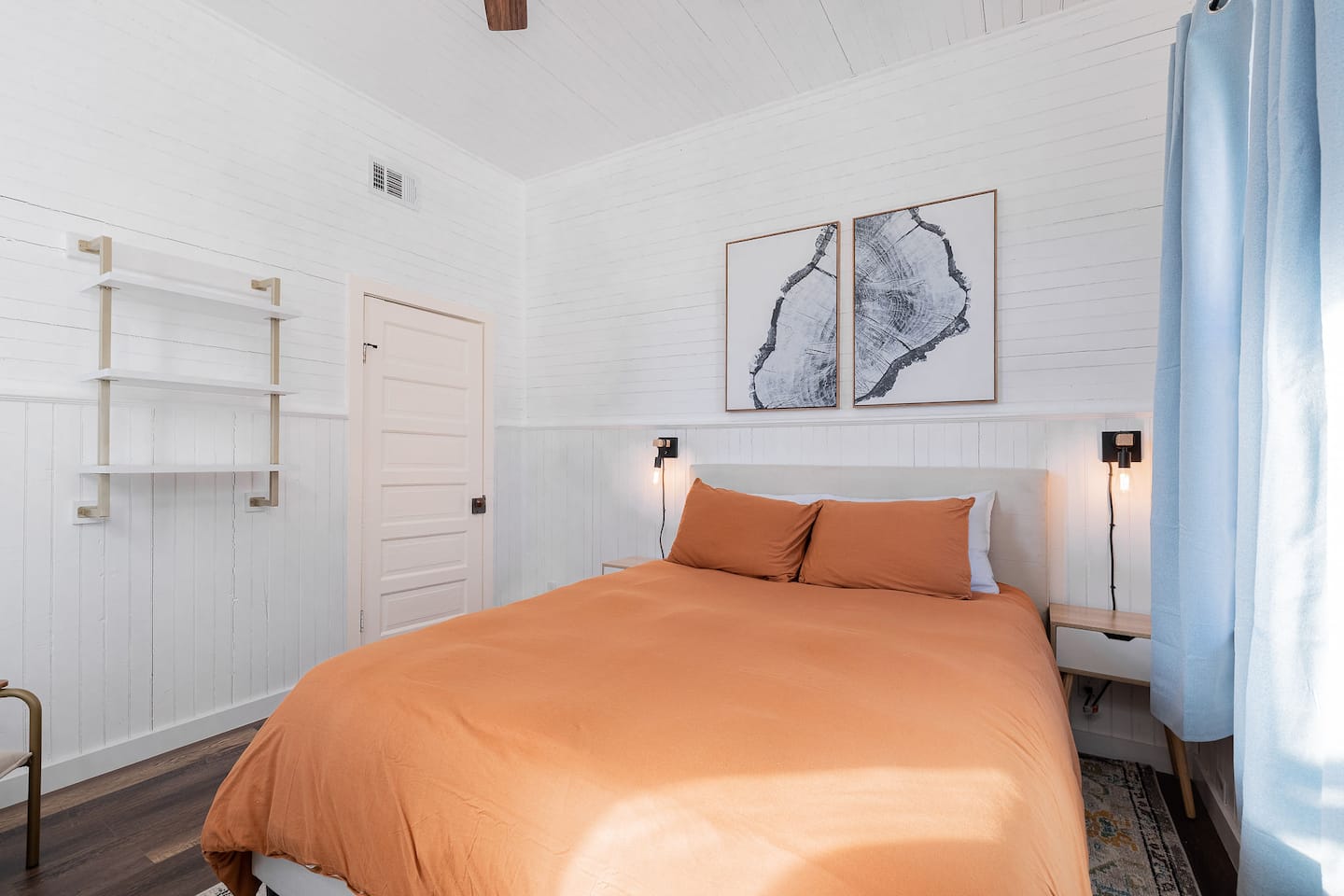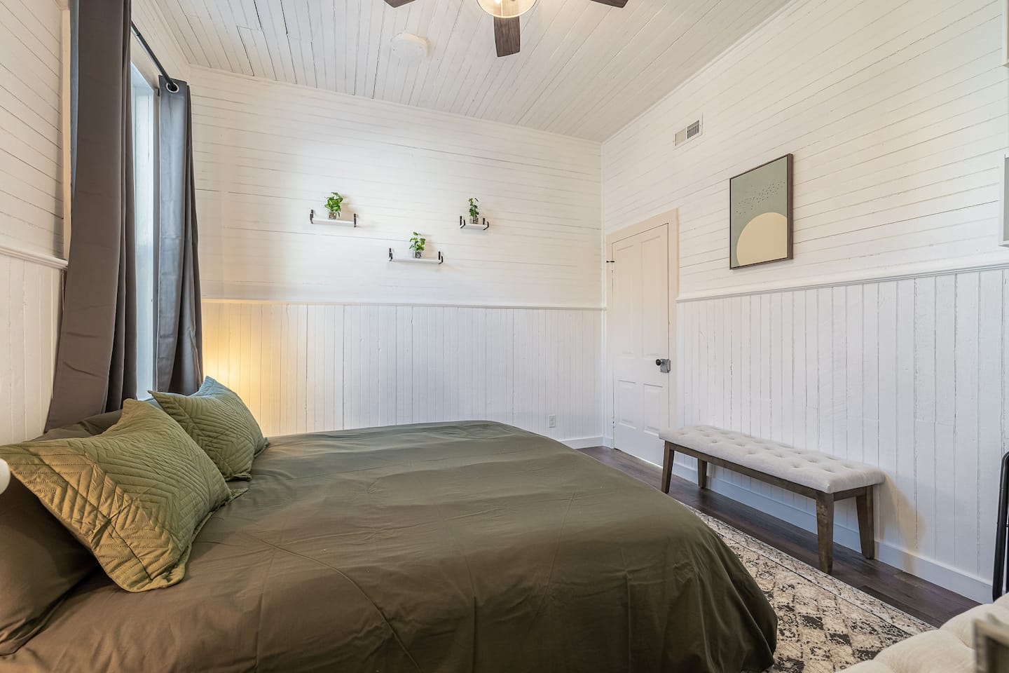 The second bedroom "Emmeline's Chamber" features a large king sized bed, wooden nightstands, large windows with black out curtains, and a bench. The gorgeous white shiplap walls continue throughout the two bedrooms.