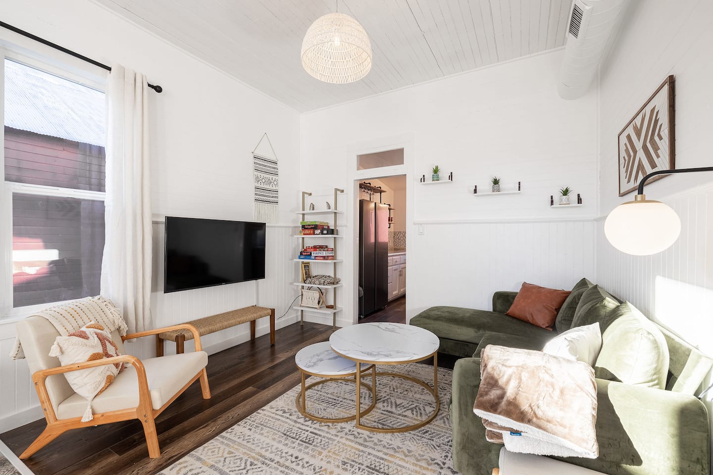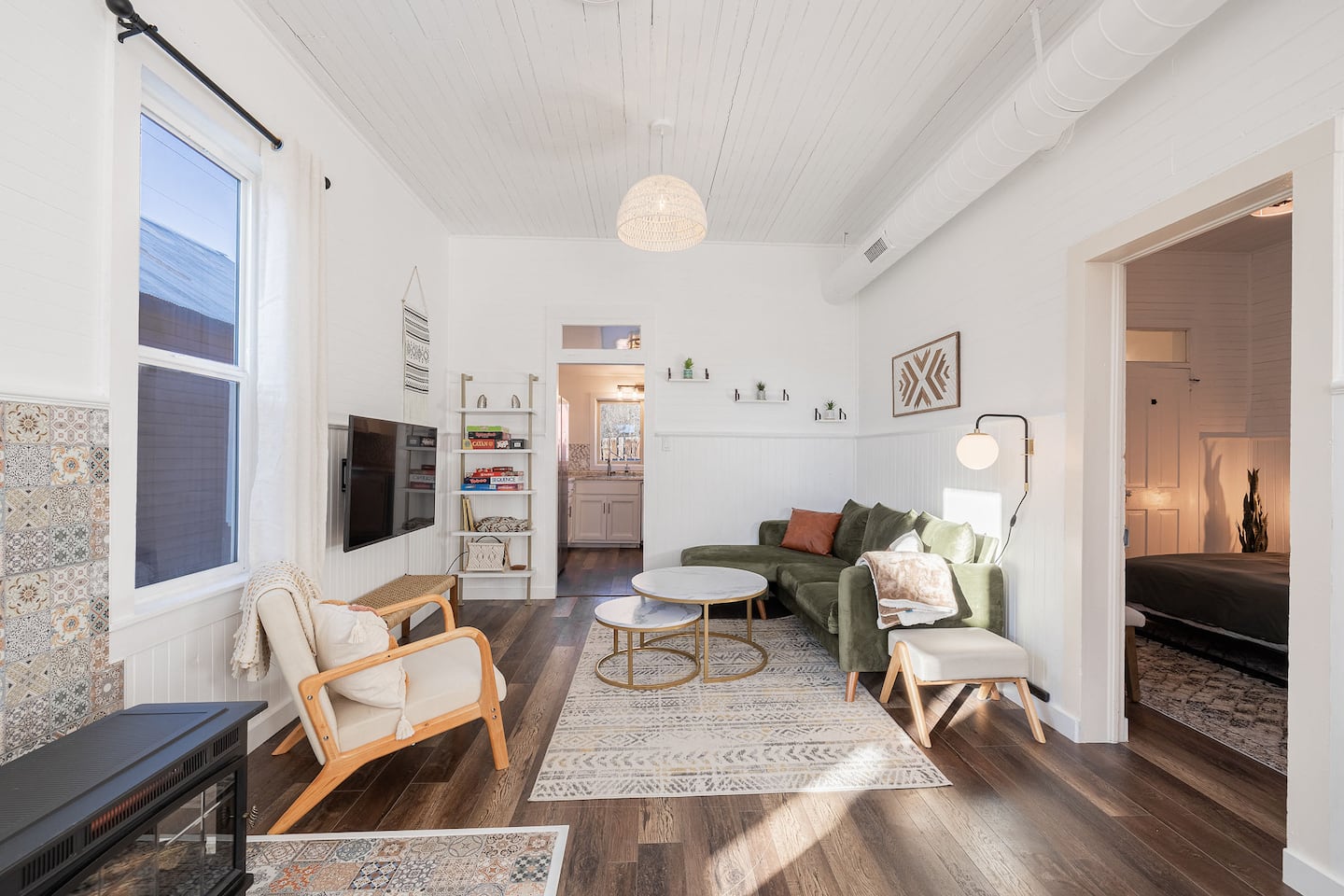As you walk in the front door of this historic home, you will immediately feel the light and airy energy. A dining table, coat hooks, a bench, and tall windows that let in tons of light are just past the front door. The open concept space flows into the living area; a freestanding electric fireplace sits atop the eclectic mosaic tiles in the main living space. sits atop gorgeous eclectic mosaic tiles. White shiplap walls, a large velvet couch, coffee tables, and a mounted 42'' TV complete the living space and make this the perfect room for enjoying your group or relaxing and watching a movie.