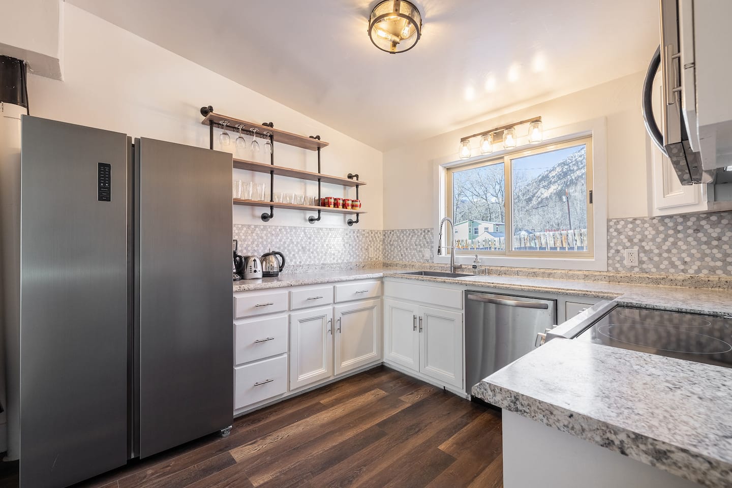 A large industrial farmhouse kitchen with stainless steal appliances and plenty of granite countertop space make this the perfect kitchen for cooking on your trip to the mountains. All cooking essentials, kettle, coffee maker, microwave, electric stove/oven, and a huge fridge provide everything you need for whipping up fantastic meals.