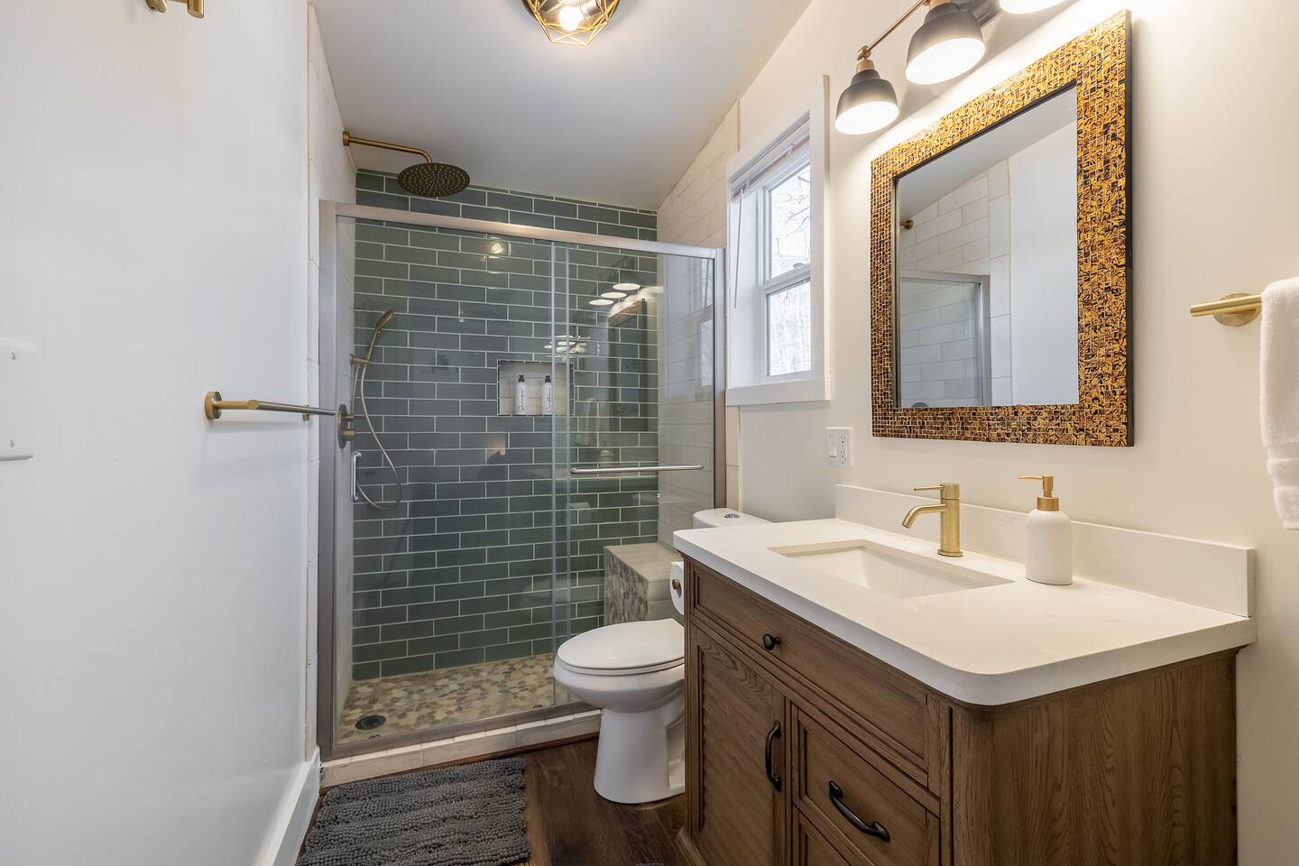 The bathroom includes a walk-in shower with soap, shampoo and conditioner, a toilet and a large vanity provide enough space for your small group to get ready for the day's adventures.