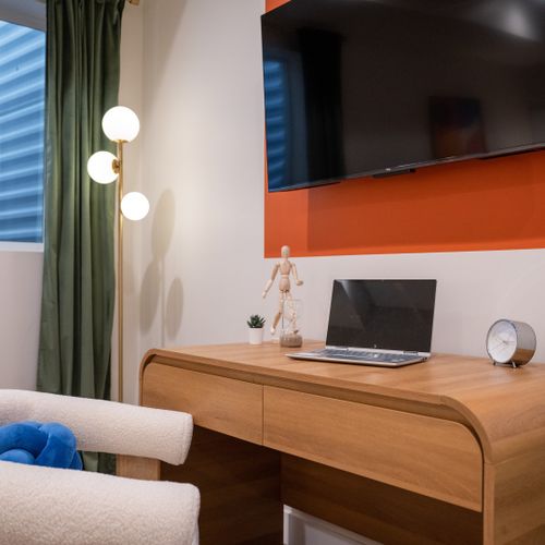 Two comfortable bedrooms offer space to spread out. The primary bedroom has a king bed, a 55" TV, and a desk with chair for focused work. The second bedroom features a queen bed. Soft linens, extra pillows and blankets, hangers, and clothing storage help you settle in.