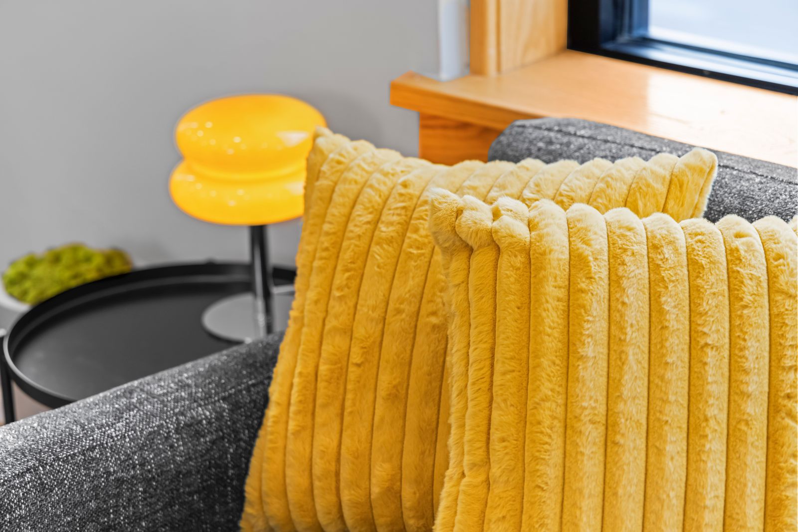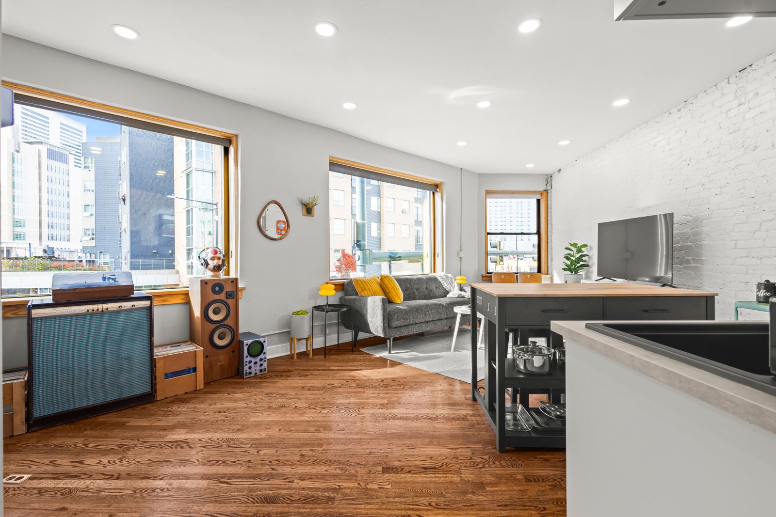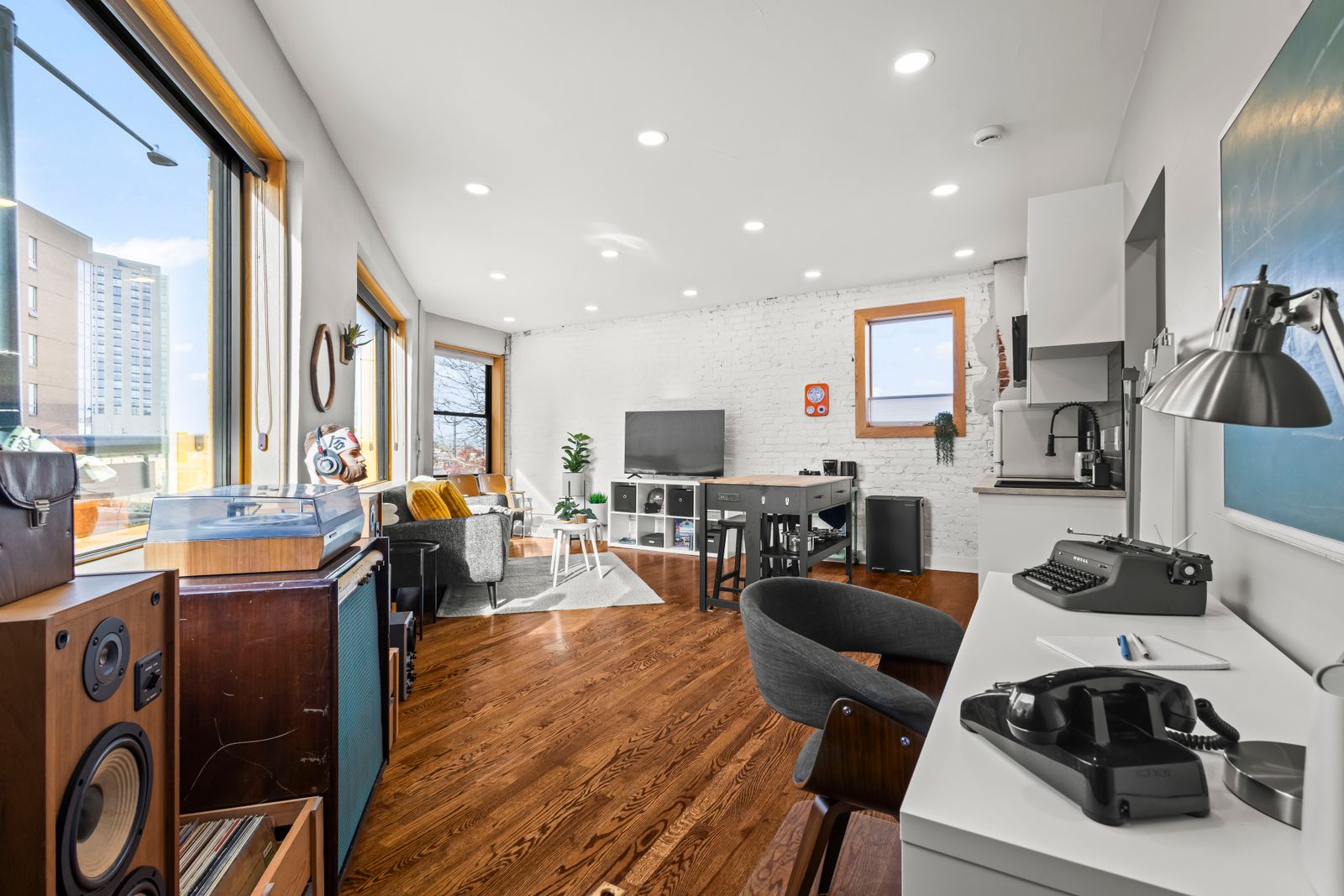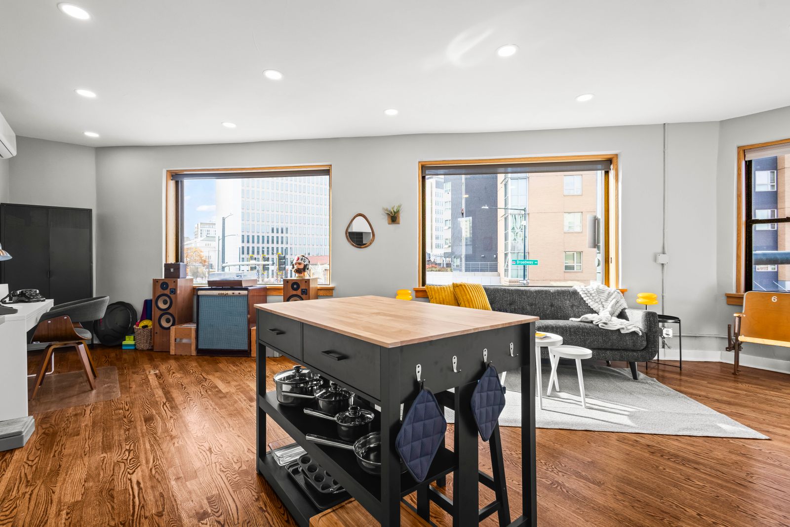 The living room invites you to relax in style, featuring a cozy couch, a large TV, and a dedicated desk with city-line views from every window. Enjoy board games or unwind after a day of exploring Denver. An in-unit washer and dryer combo is conveniently included, making longer stays easy and comfortable.