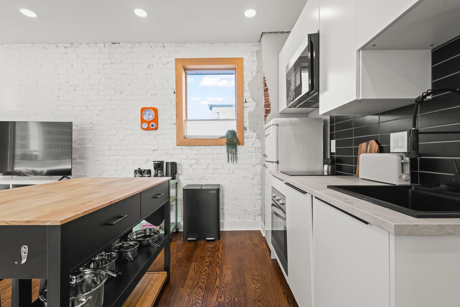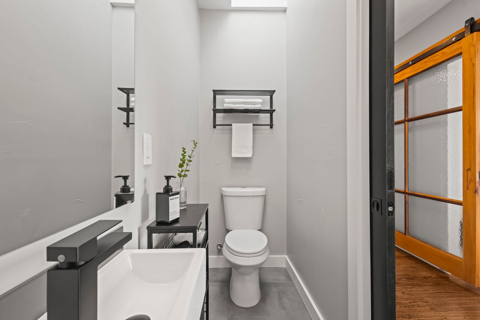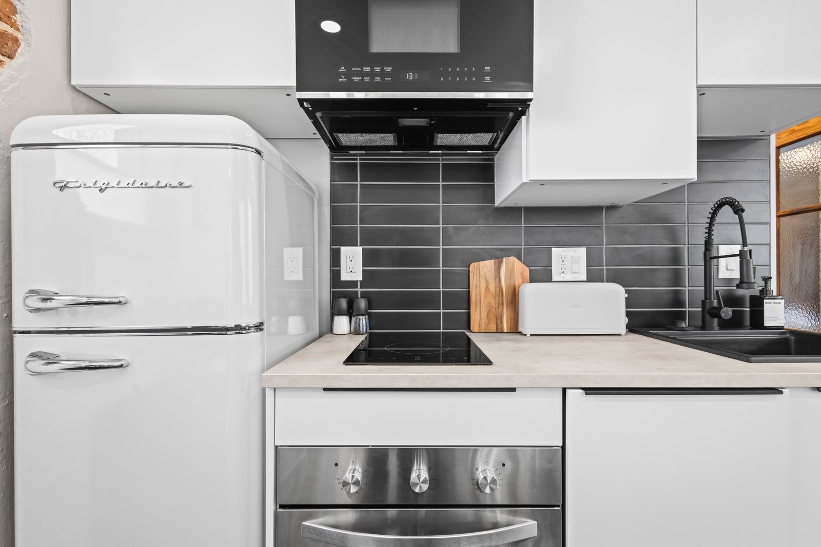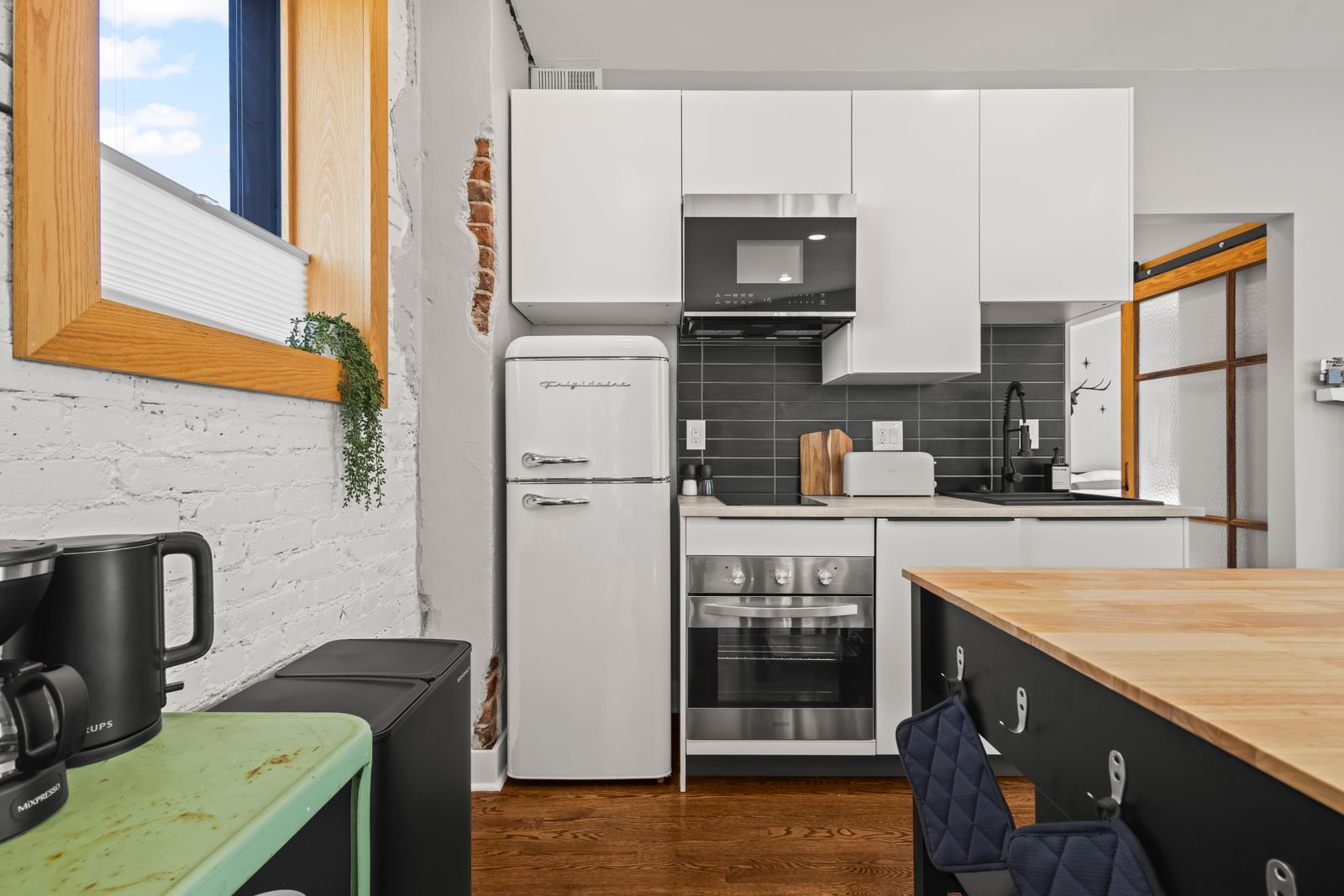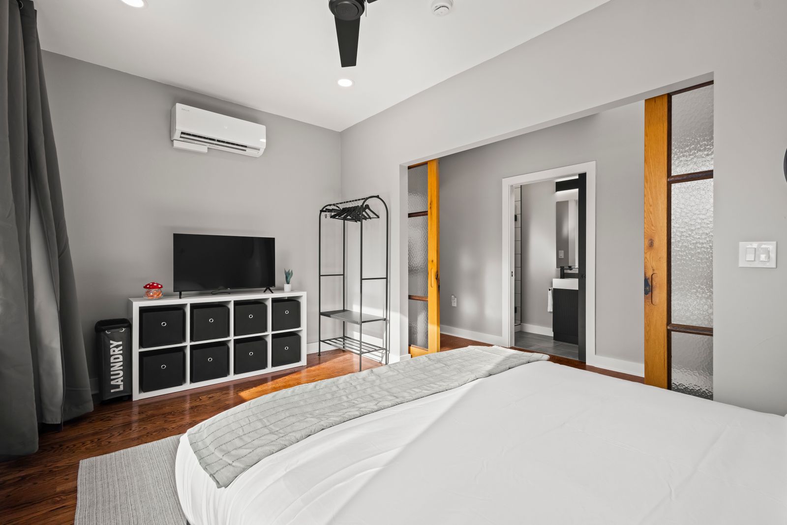The bedroom is thoughtfully designed for both comfort and character, featuring a plush queen bed, soft linens, and blackout curtains for a peaceful night’s rest. Enjoy your favorite shows on the 40” TV and wake up refreshed for another day in the city.