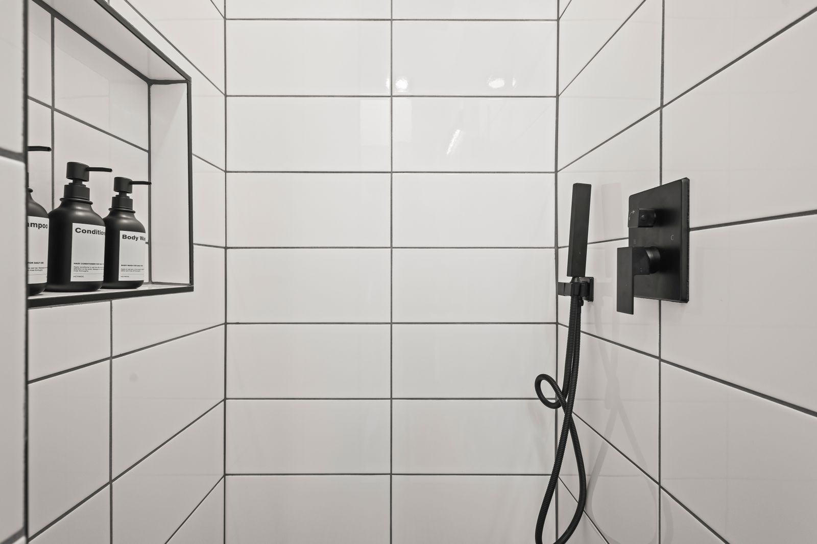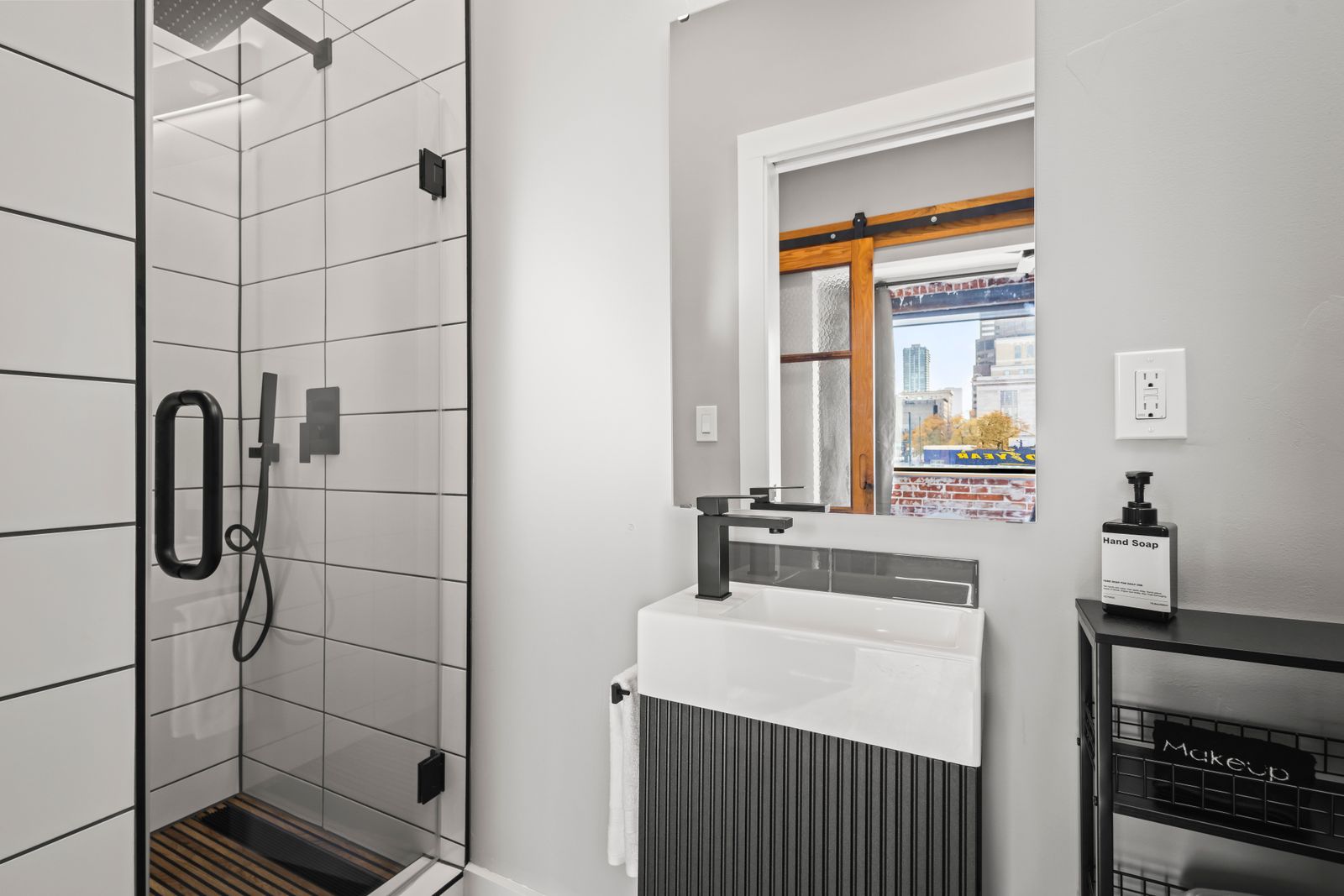 The bathroom features a modern small walk-in shower, premium shampoo, conditioner, body wash, a hair dryer, and plush towels to add a touch of luxury.