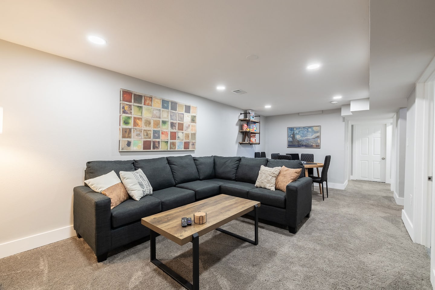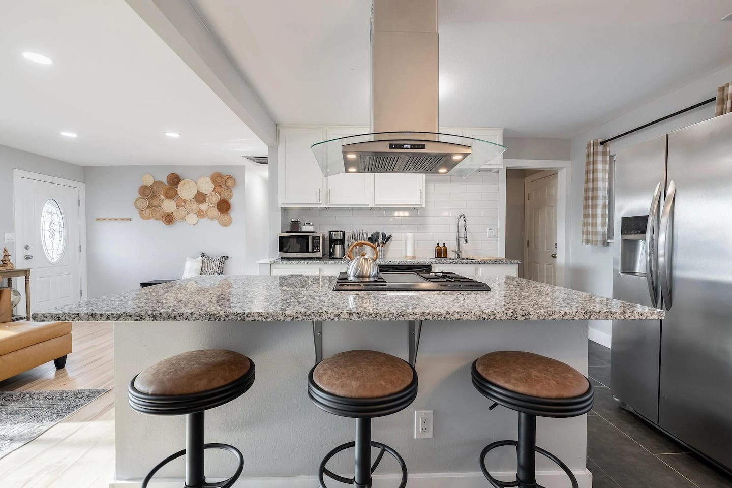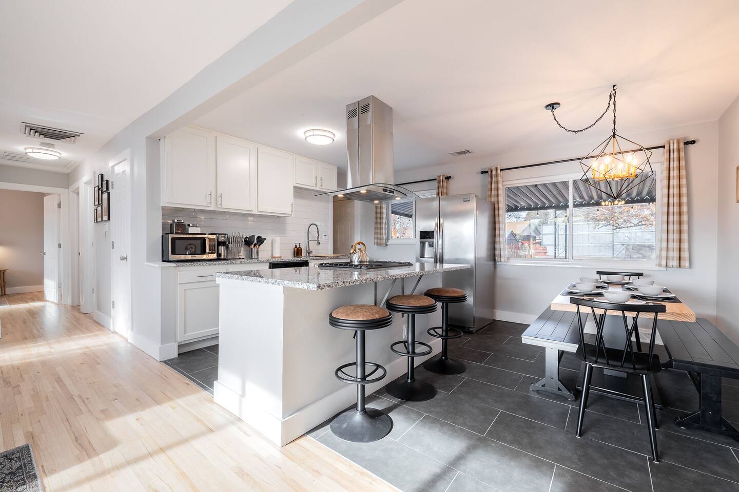The fully equipped kitchen includes stainless steel appliances, a coffee maker, and all the basics you need to prepare your favorite meals. Gather around the spacious dining table for shared breakfasts before exploring Denver or evenings filled with laughter and comfort food.
