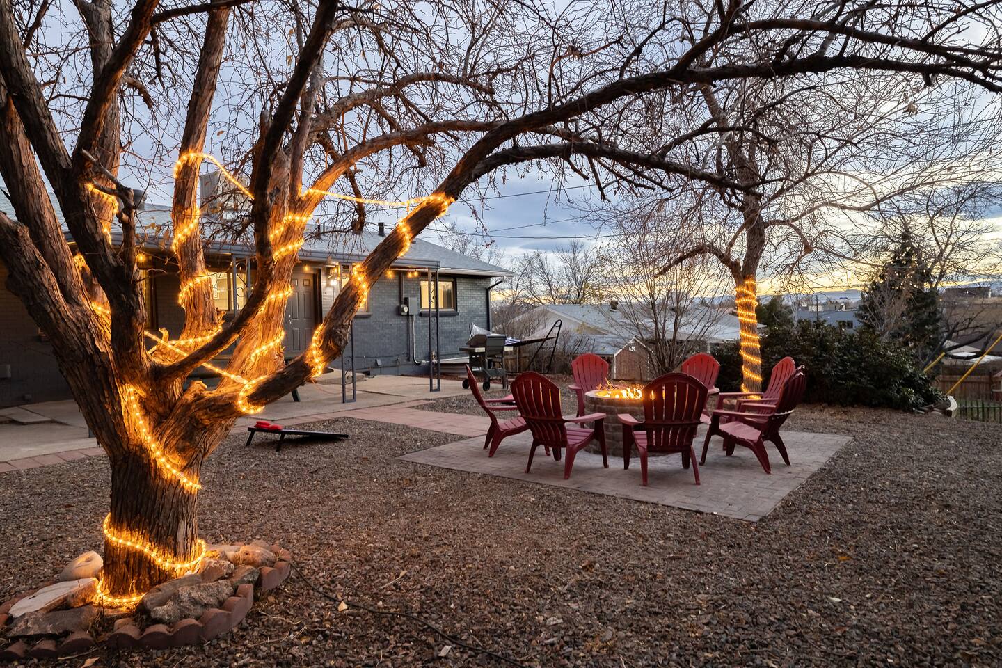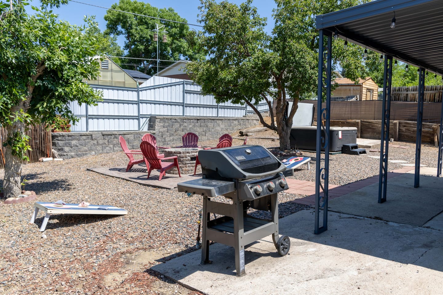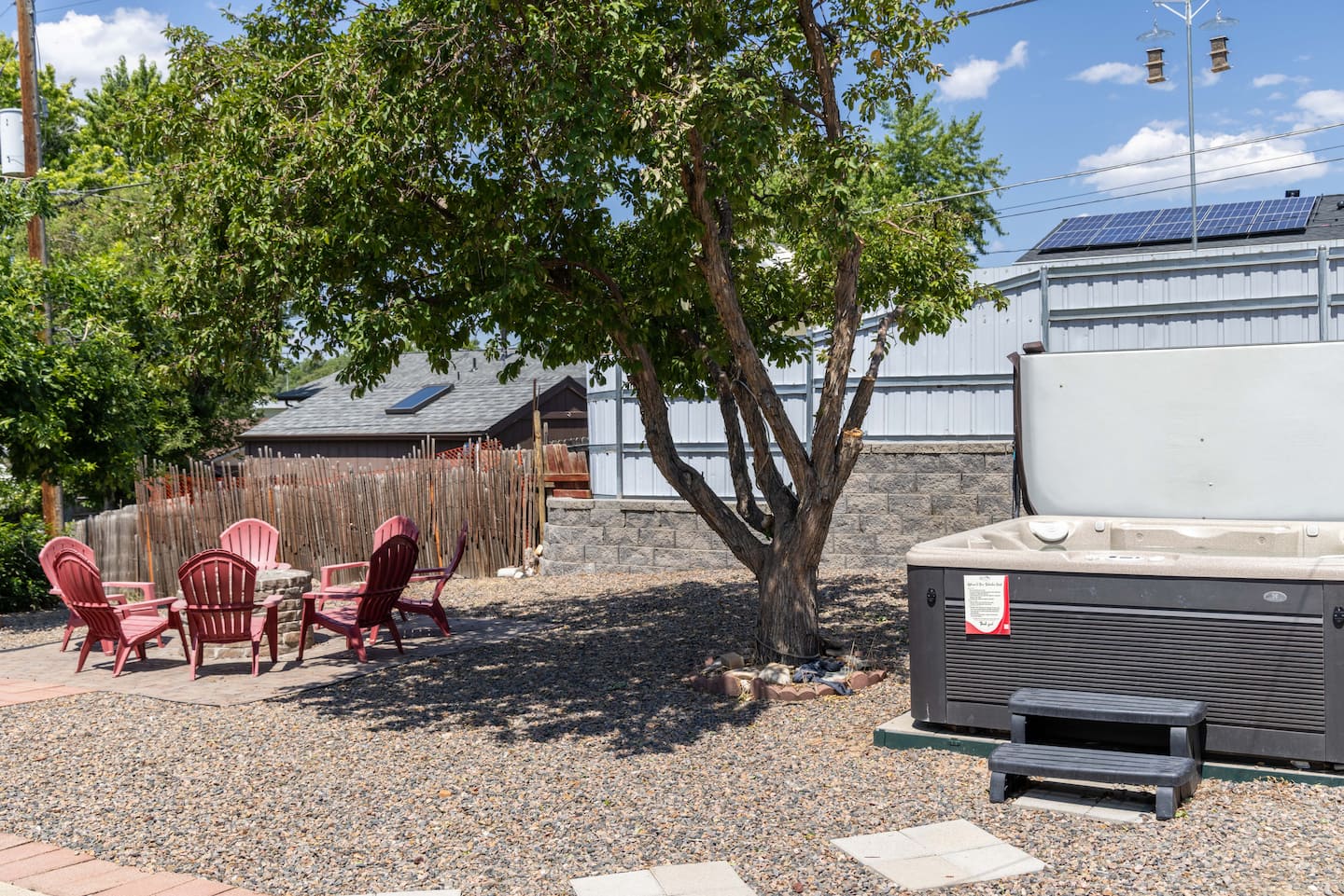 Step outside to a private backyard designed for relaxation and gatherings. In the cool Colorado air, enjoy the warmth of the fire pit or soak in the hot tub under the night sky. A BBQ grill, patio seating, and outdoor games offer options for fresh-air fun year-round. The hammock is available in warmer months, creating the perfect summer lounge spot.