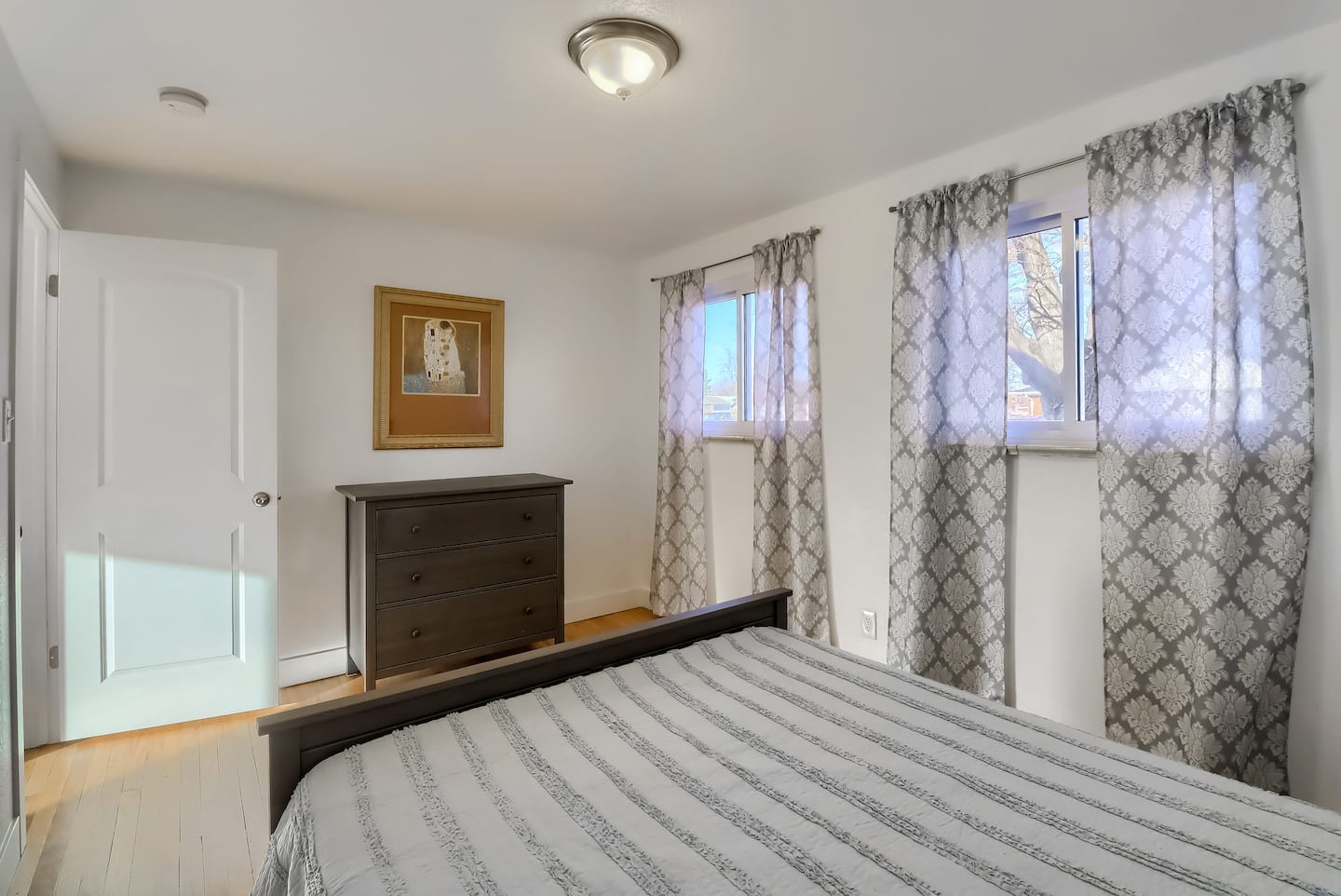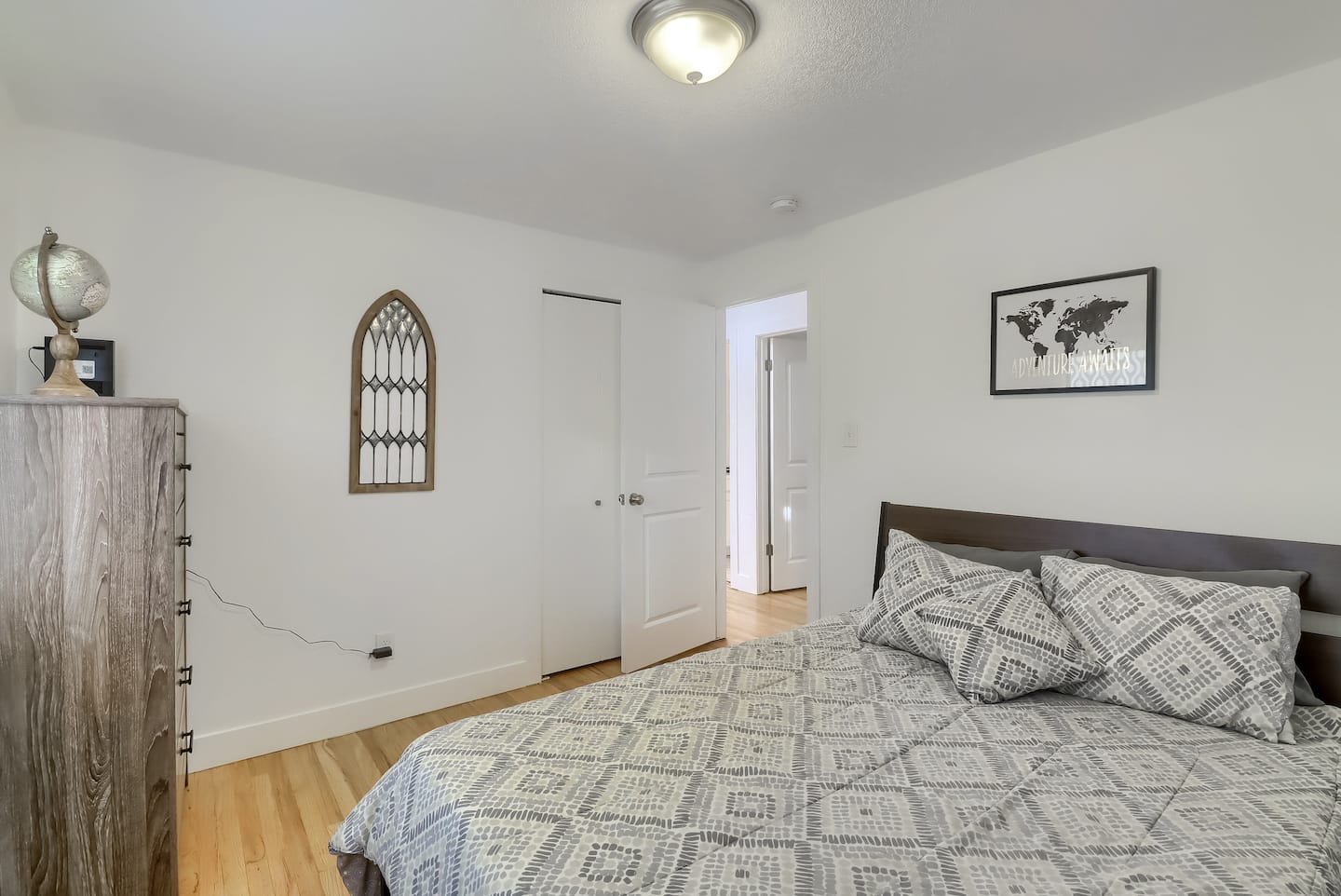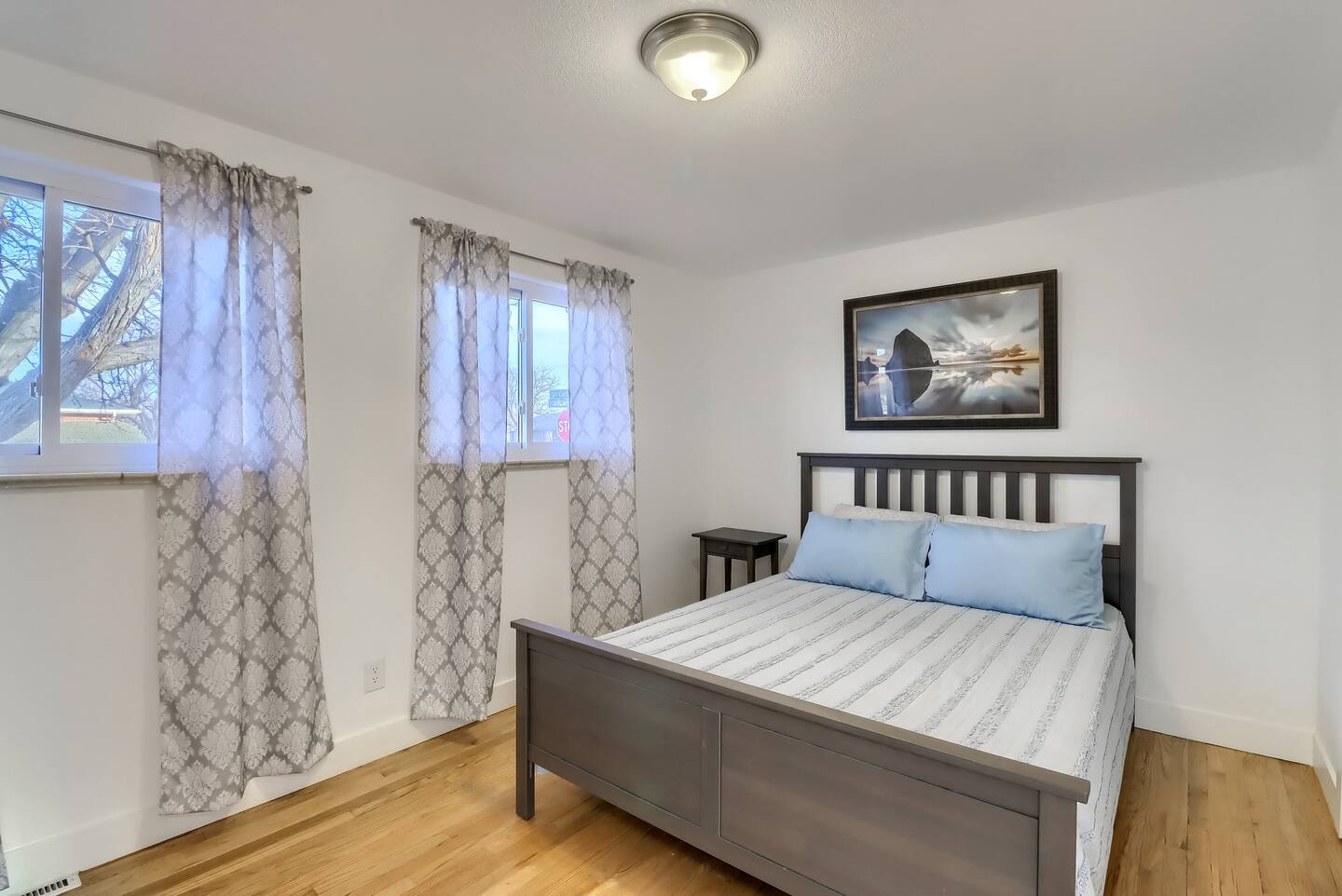 This lovely Centennial home boasts four well-sized, inviting bedrooms. The three bedrooms upstairs are furnished with queen-sized beds, providing a cozy and comfortable sleeping experience. Each bed is dressed with soft linens to ensure a restful night's sleep for every guest. The basement bedroom boasts a king size bed, with an expansive ensuite bathroom.