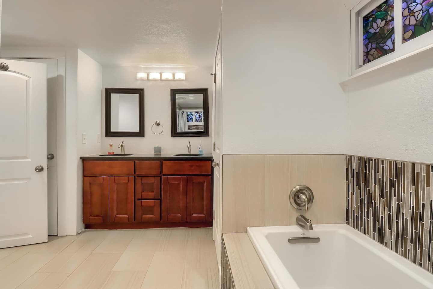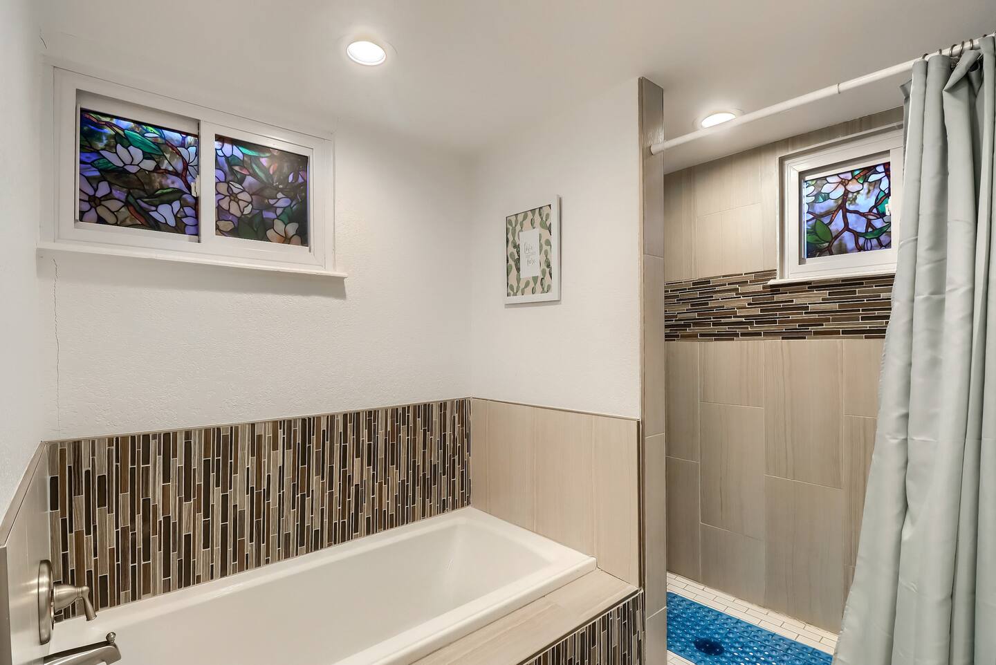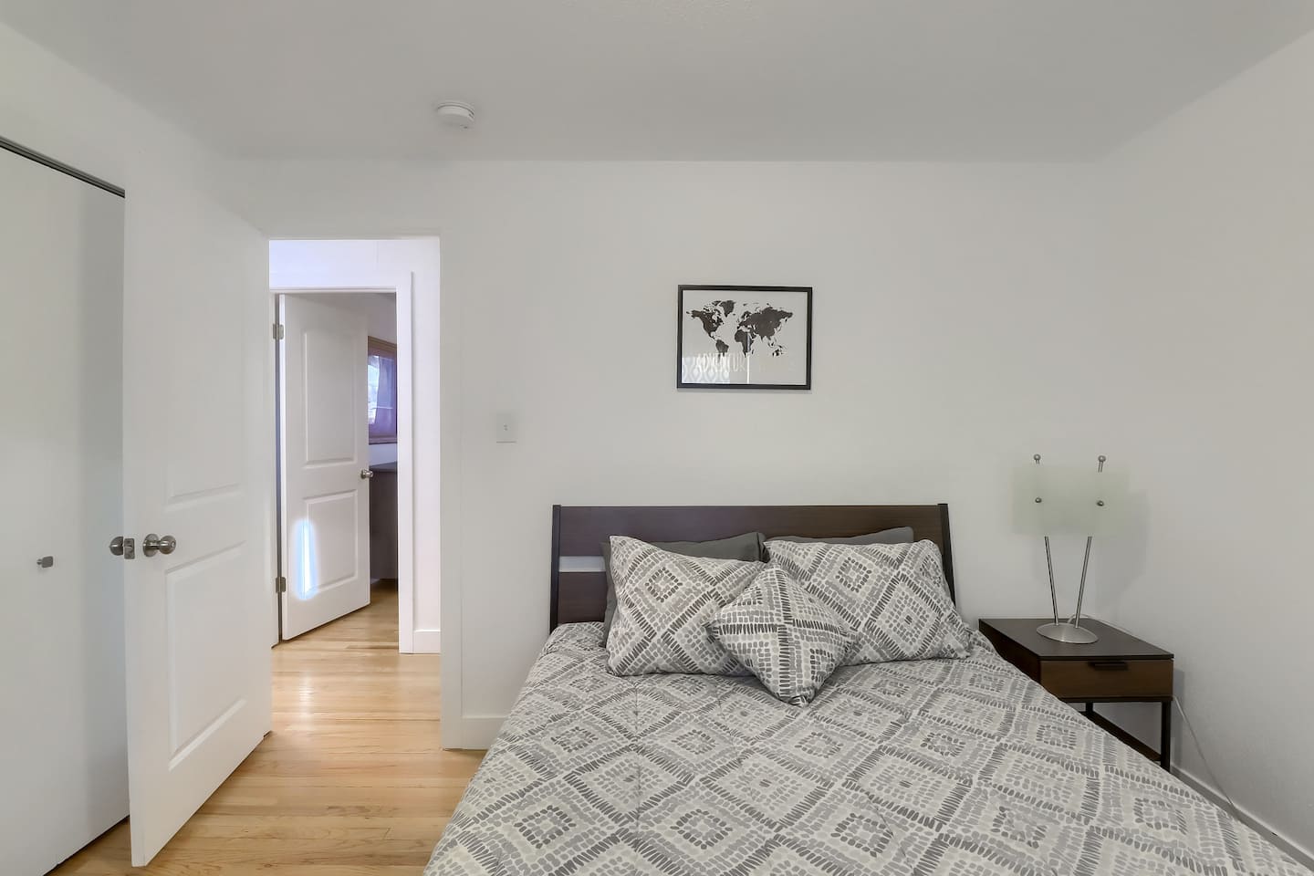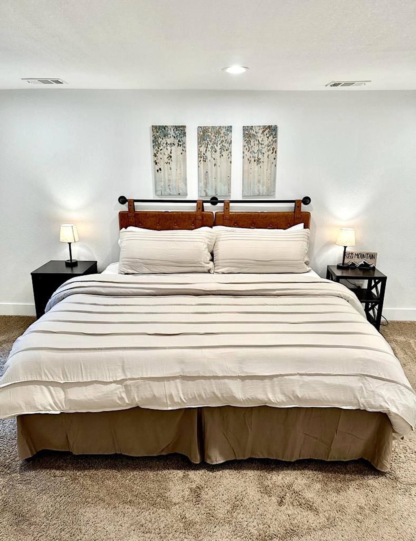 This lovely Centennial home boasts four well-sized, inviting bedrooms. The three bedrooms upstairs are furnished with queen-sized beds, providing a cozy and comfortable sleeping experience. Each bed is dressed with soft linens to ensure a restful night's sleep for every guest. The basement bedroom boasts a king size bed, with an expansive ensuite bathroom.