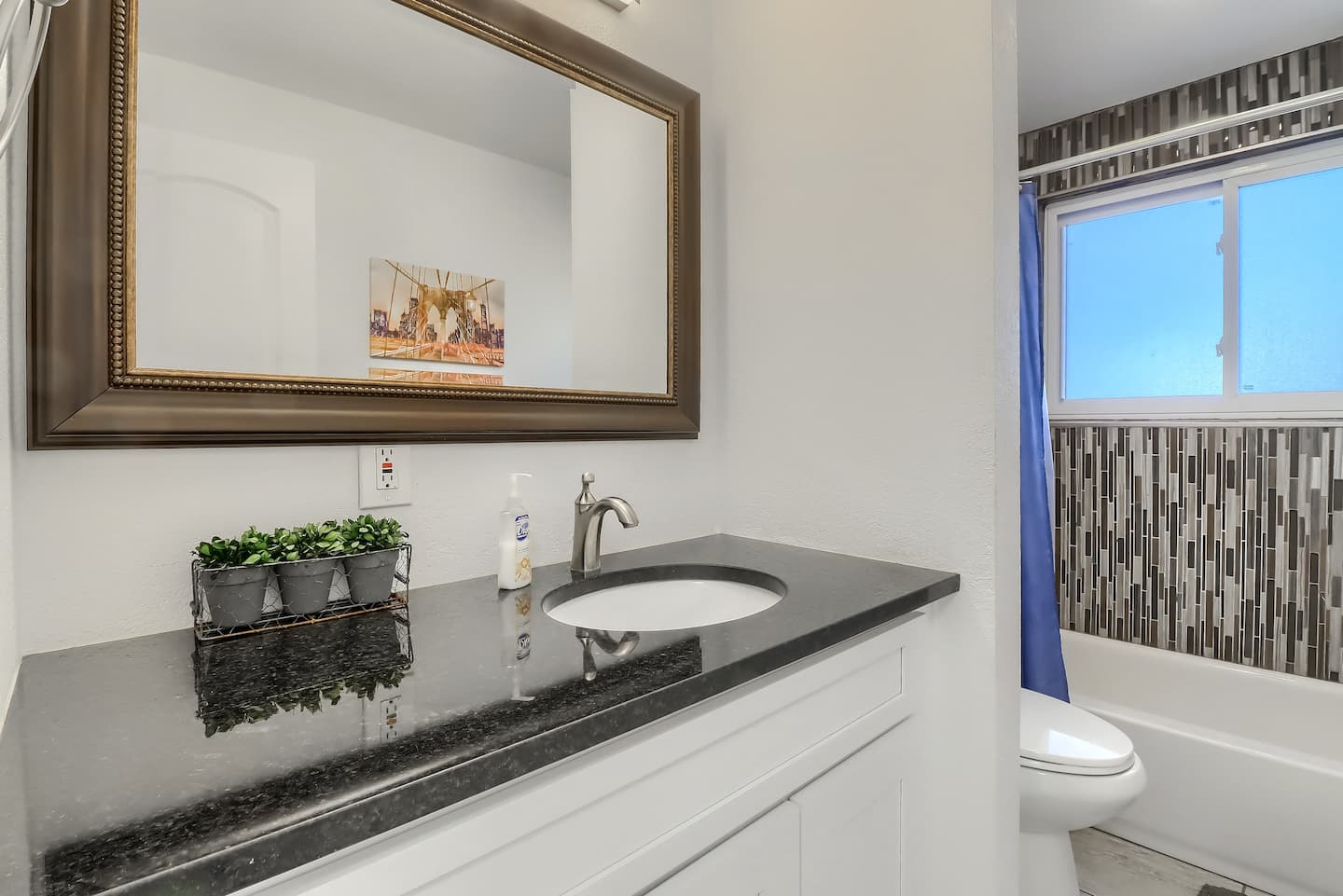 This spacious home features 3 bathrooms, providing ample space for everyone in your group to freshen up. The upstairs shared hallway bathroom offers a beautifully tiled shower/tub combo and an extended stone vanity. The second bathroom is downstairs and holds a floor to ceiling tiled walk-in shower. Additionally, the lower level master bedroom has a large ensuite bathroom with a soaking tub and walk-in shower. All bathrooms are stocked with toiletry essentials ensuring your comfort during your stay.