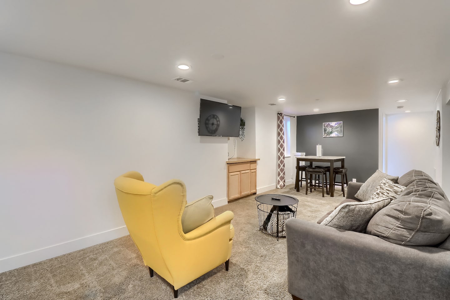 The two inviting living areas in the home offer comfortable and elegant spaces for your entire group to gather and relax. Both spaces are equipped with wide flat screens, perfect for movie nights or sports games. For additional guests, there is a pullout couch available in the lower level living room. Linens and sheets are conveniently stored nearby for easy access. This living area also includes a mini fridge and microwave, and added lounging and entertaining space. This is the perfect spot for your group to unwind and make lasting memories.