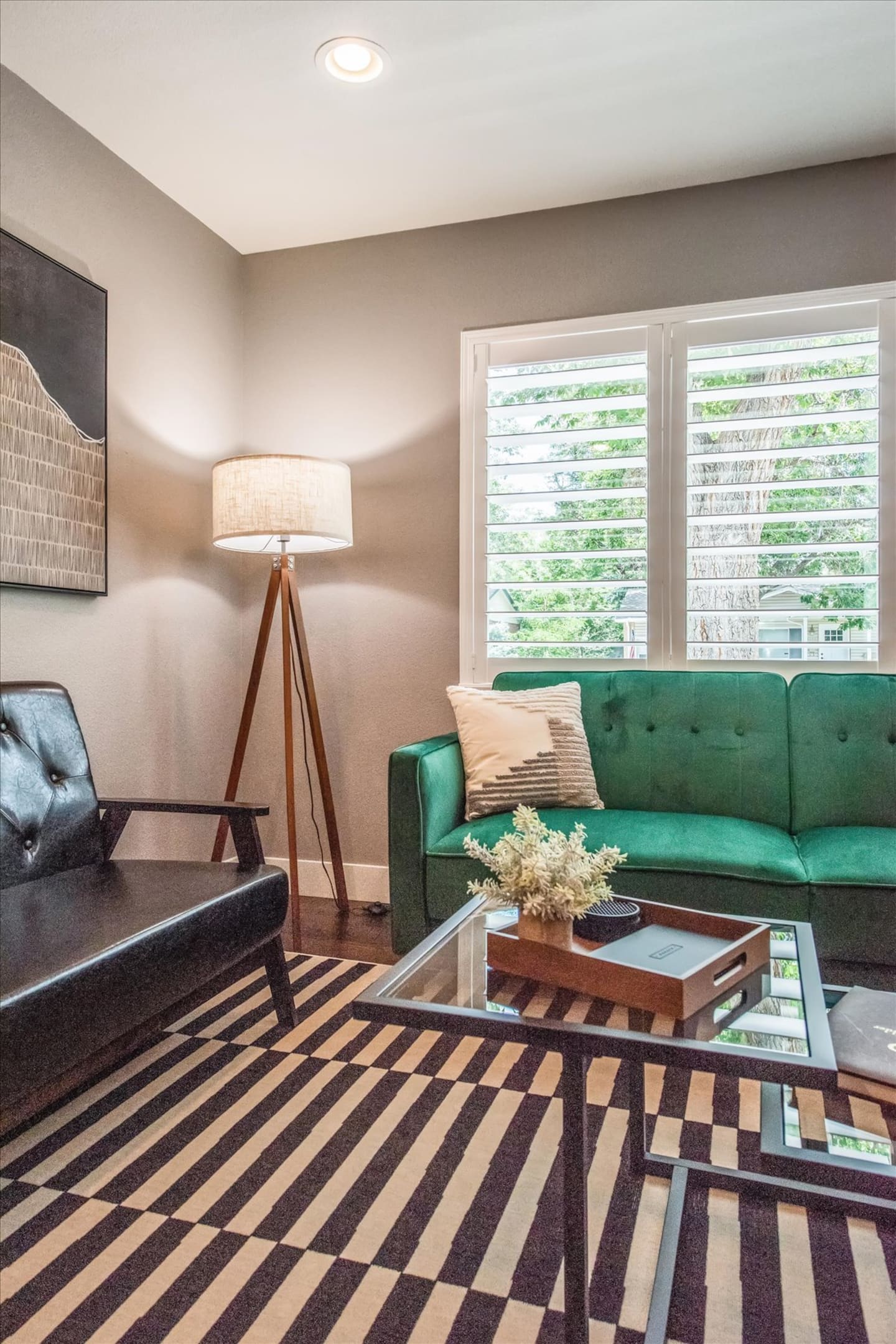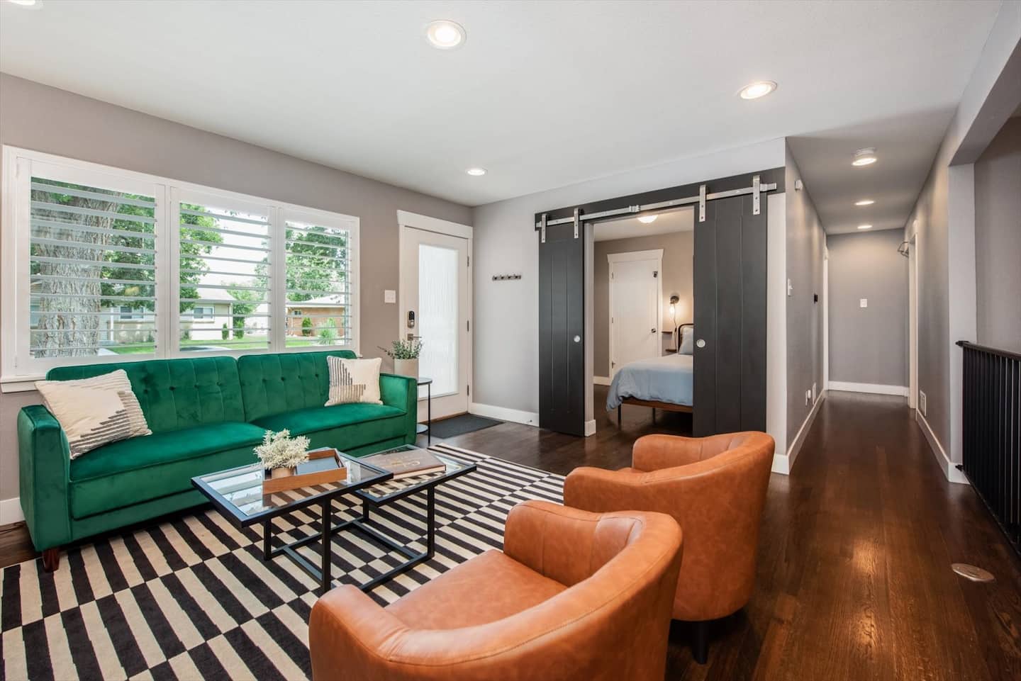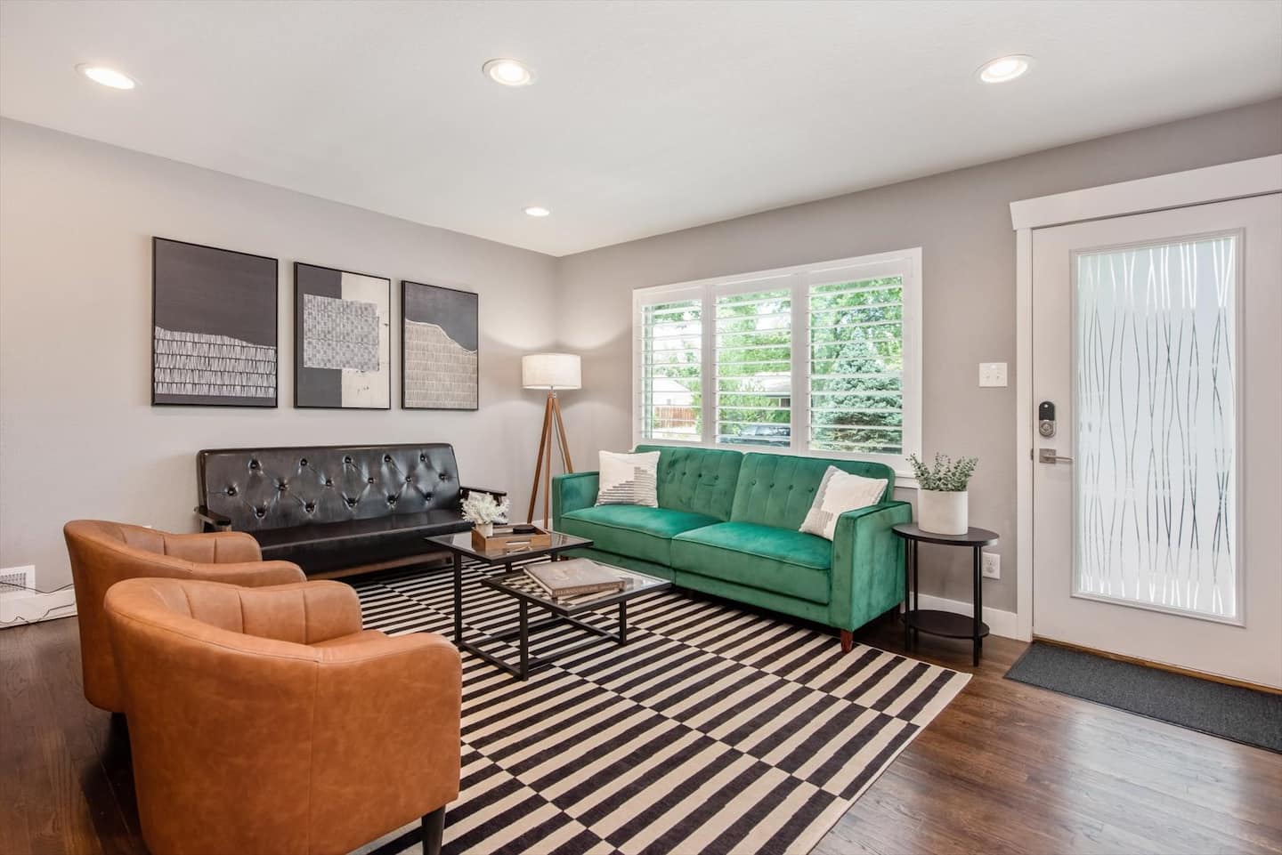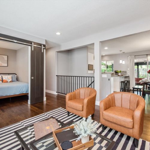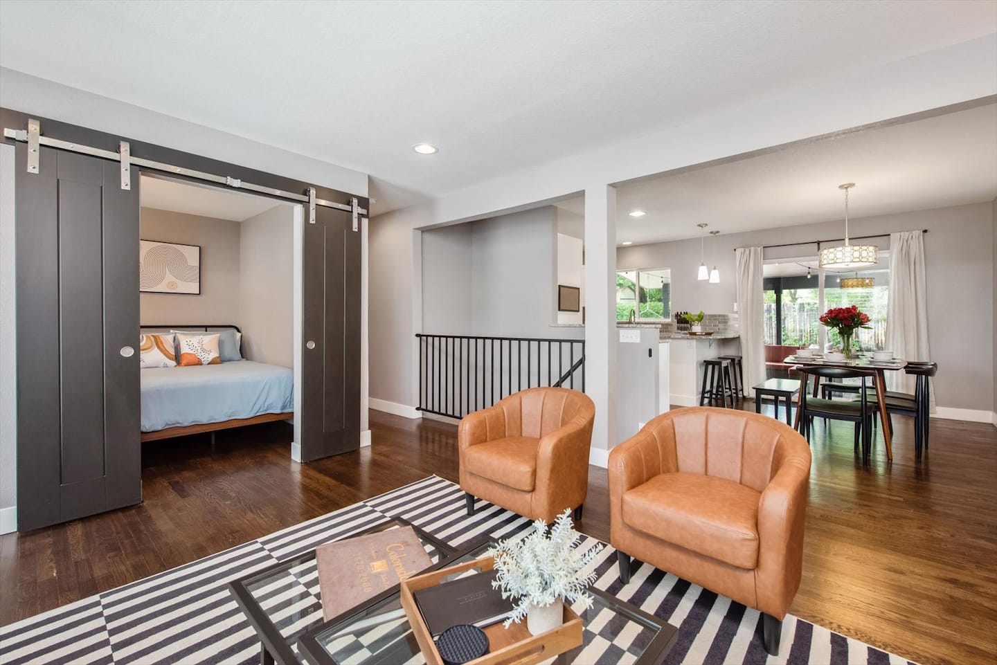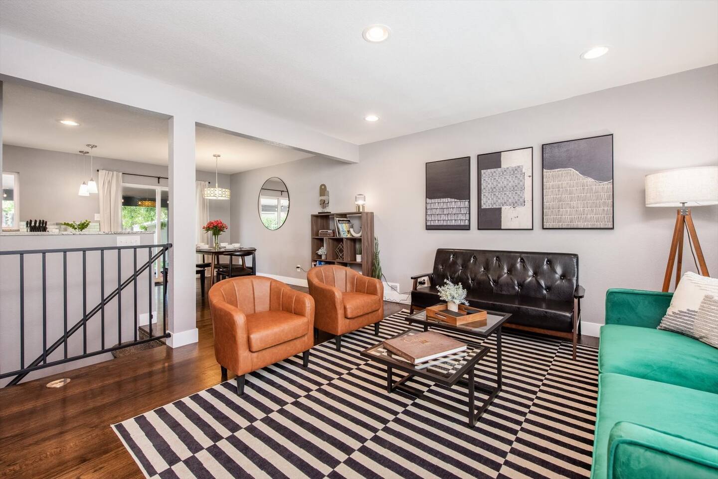 When you step into this newly updated home, you will be greeted by a relaxing, retro-chic living space with a velvet couch and leather accent chairs for gathering. The living area flows right into the dining room and kitchen for an open concept feel.