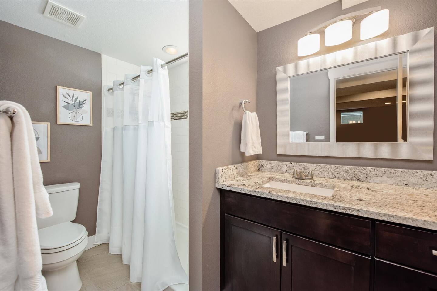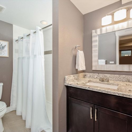 Featuring 3 full bathrooms, there’s plenty of room for groups to get ready. Each bathroom is supplied with hotel-quality towels, complimentary shampoo, conditioner and body wash.