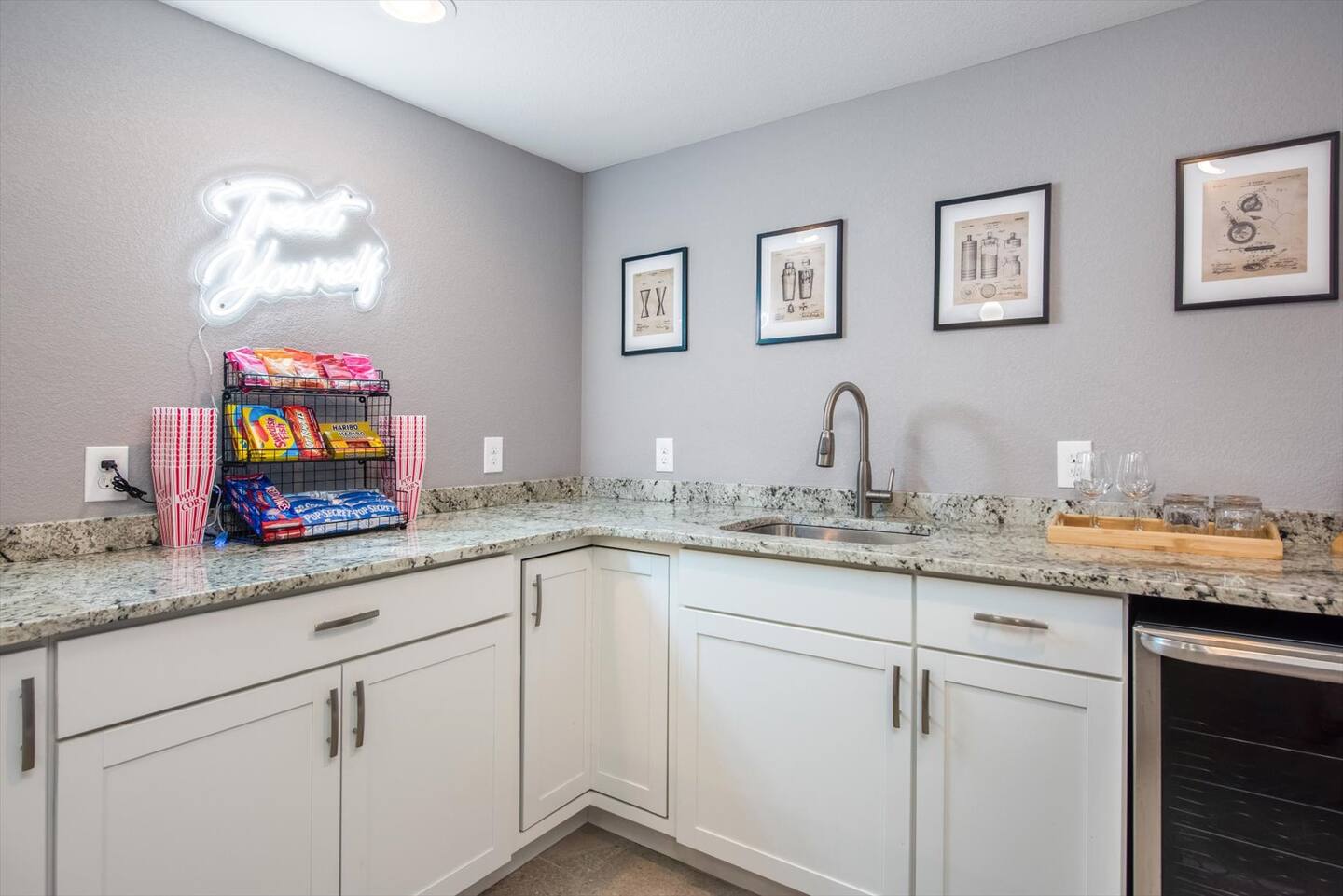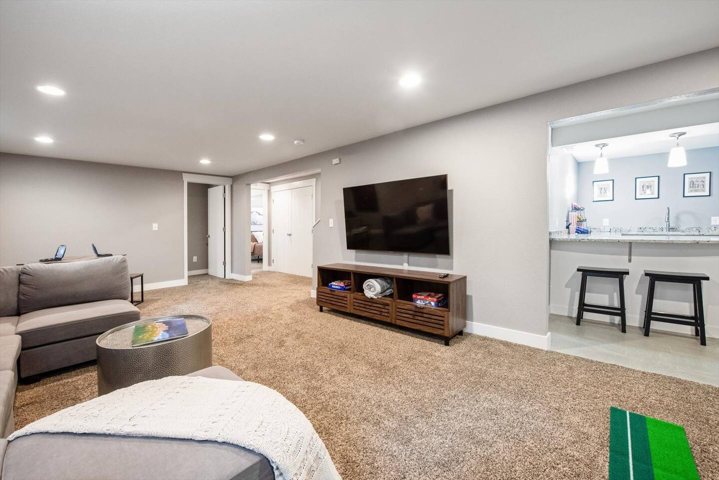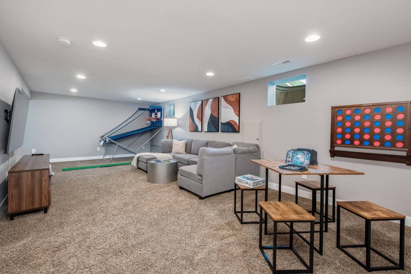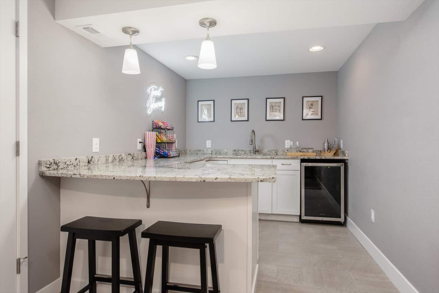 The lower level is where all the fun is. As you head downstairs, you will be greeted by the second living space and game area, featuring a cozy sectional couch with a 65” Smart TV to watch your favorite shows or movie. Say goodbye to boredom with a high-top table for card or board games, giant connect4, putt-putt golf and pop-a-shot basketball. The wet bar provides additional counter space, seating, a sink, complimentary snacks, a mini-fridge, glassware and bar set up with a shaker & strainer to mix your favorite cocktail.