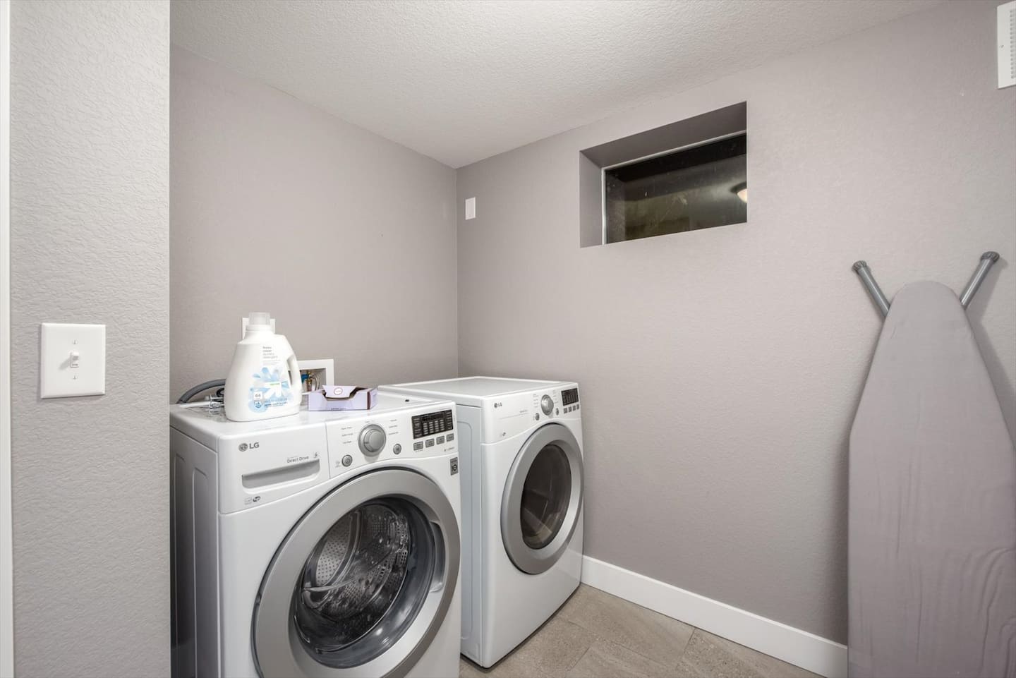 Completing the lower level is the laundry room with detergent and dryer sheets, as well as an ironing board and iron.