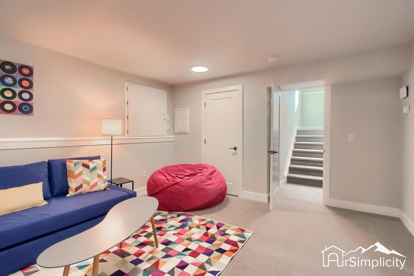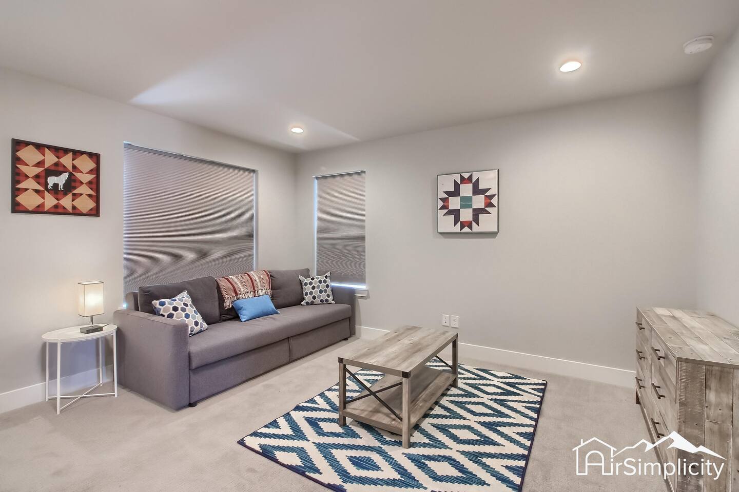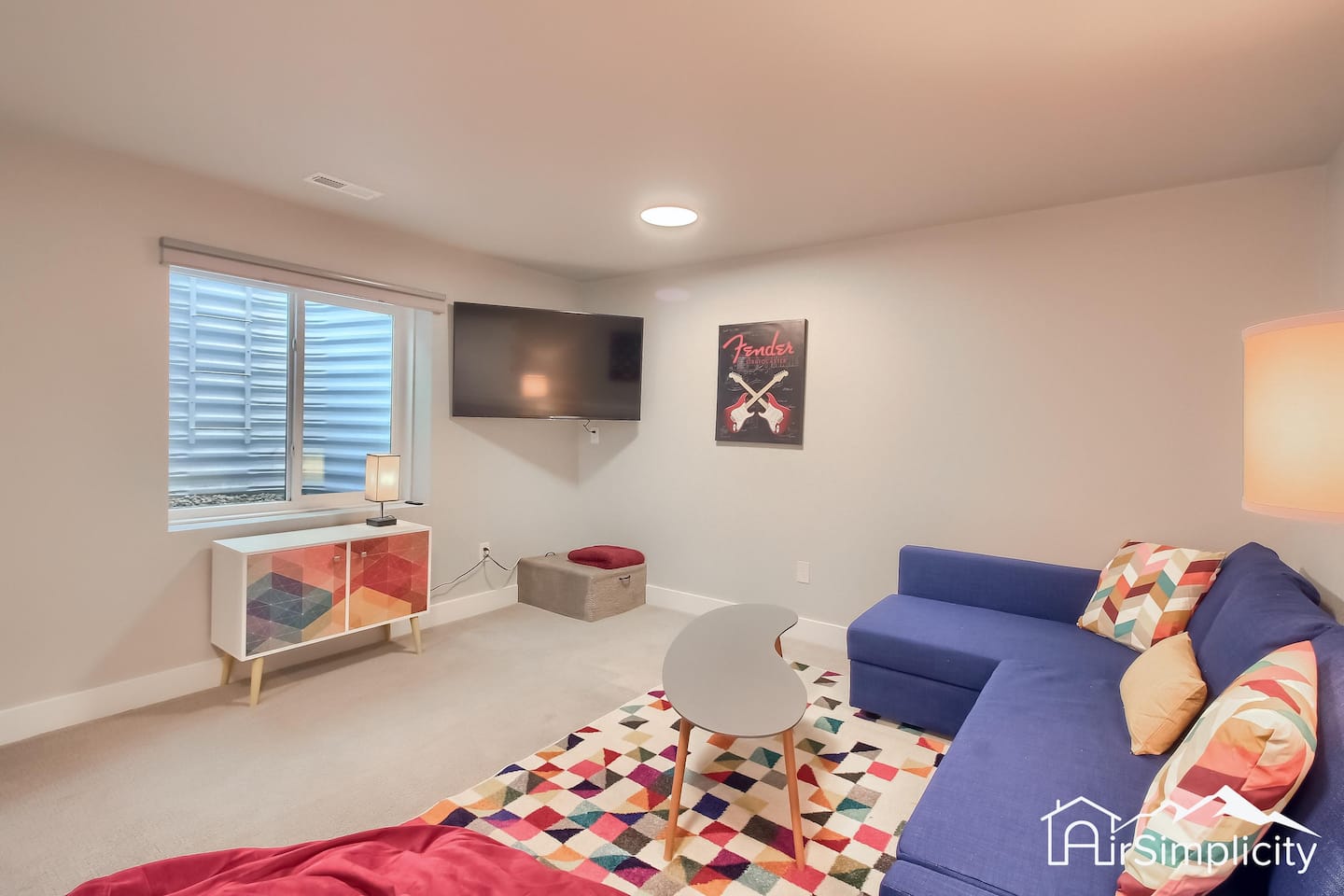 The fourth sleeping area is located in the basement family room. Secluded from the rest of the home, the occupants will have the entire floor to themselves. There is a sofa that transforms into a queen size bed. In this room you’ll also find an oversized bean bag chair and a wall mounted smart TV.