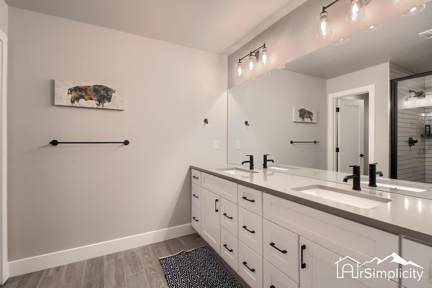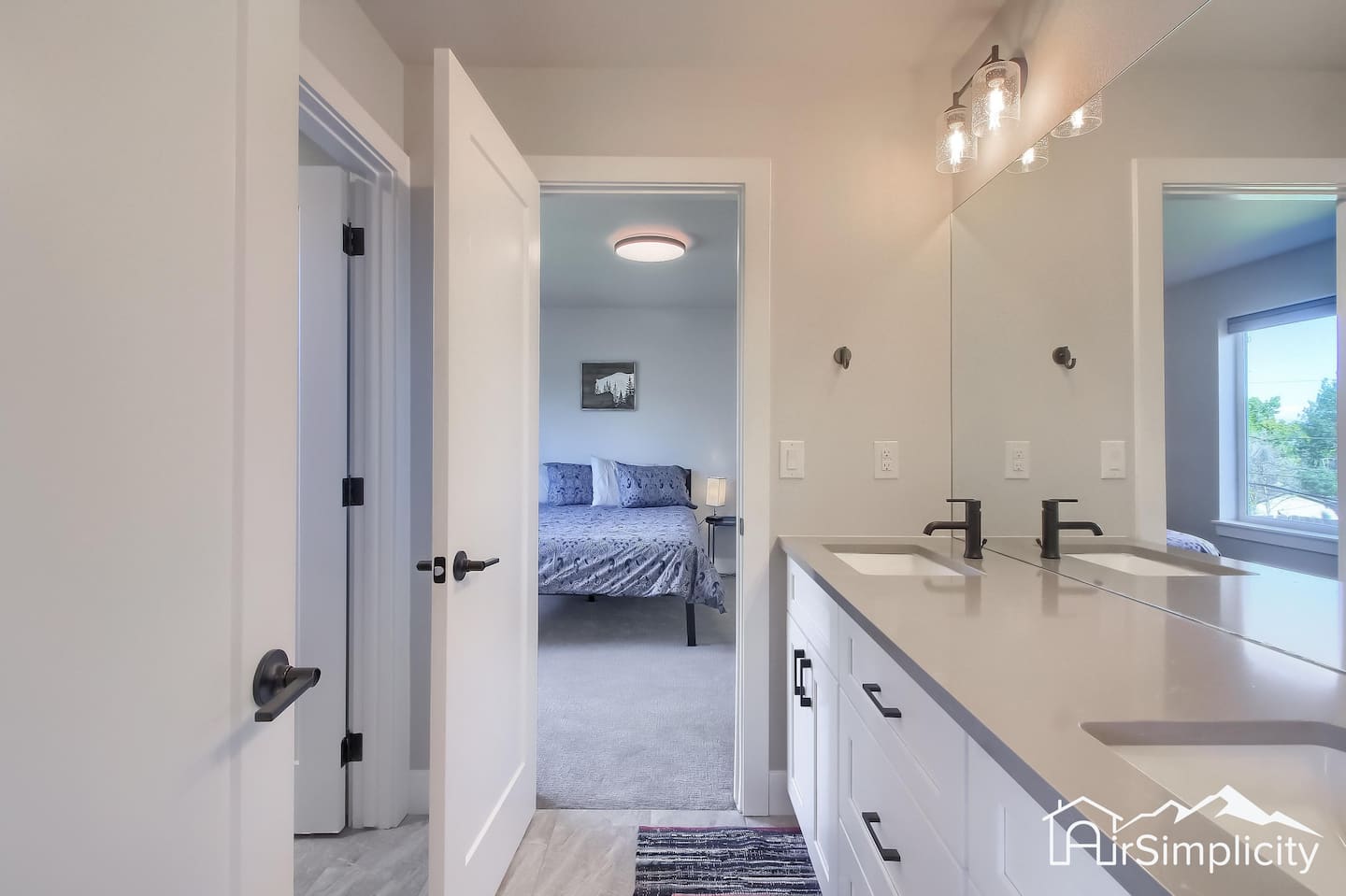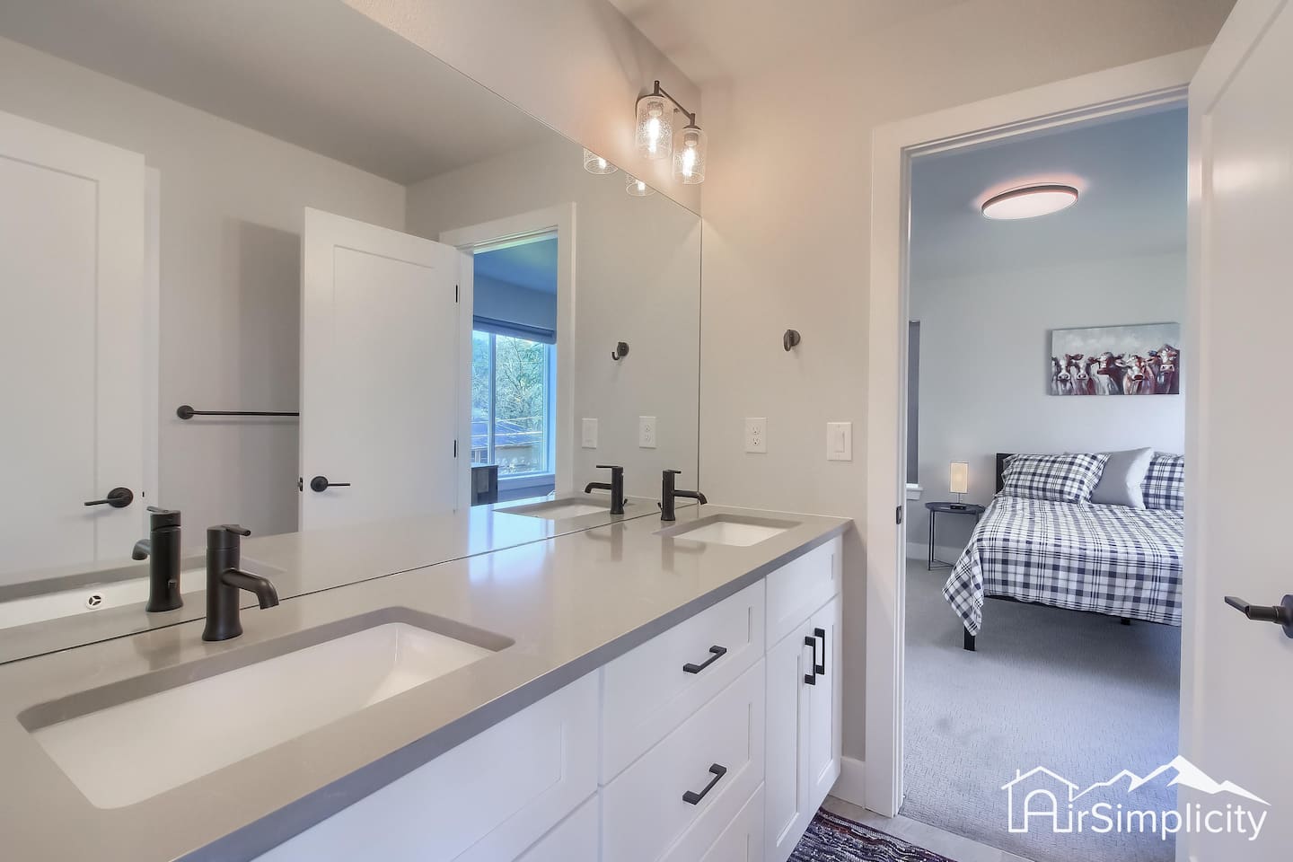 The third upstairs bedroom is bright and cheery. You’ll love the westerly mountain vista views as well as the soft linens, modern furnishings, and decor. This room also connects to the Jack-and-Jill bathroom.