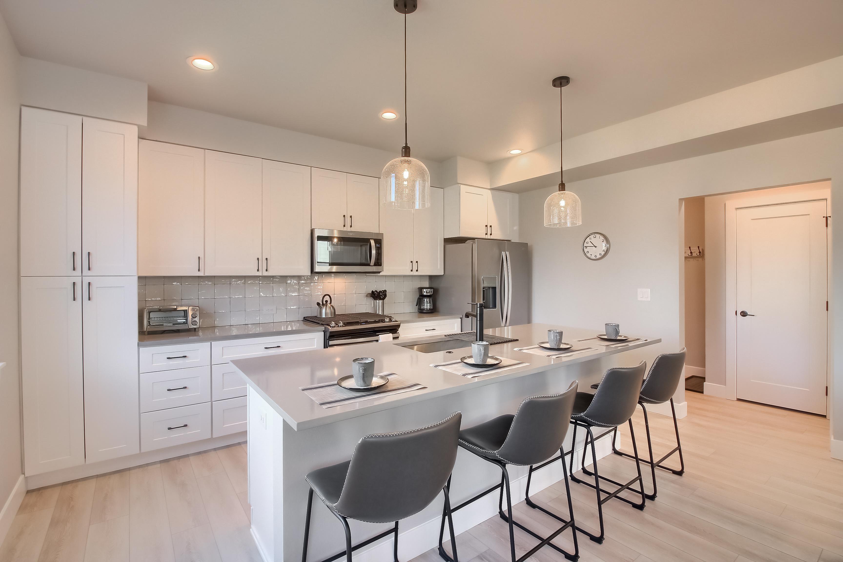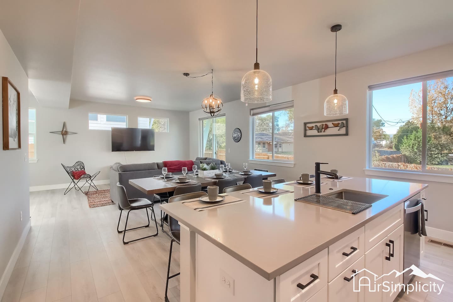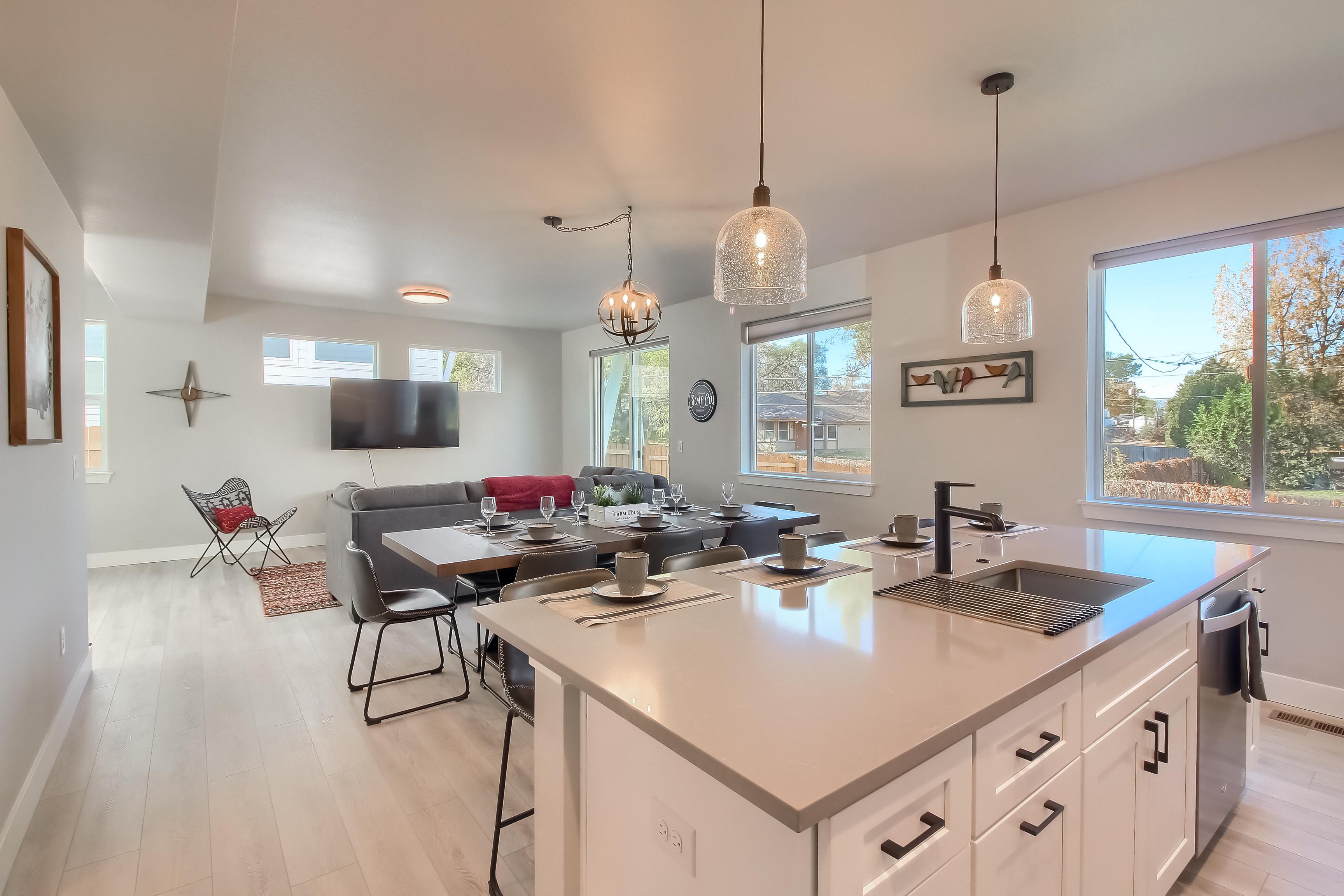 The kitchen transitions seamlessly into the dining and living area, a bright and welcoming common space where everyone can find a favorite spot. The open dining area provides a great space to gather around. The large wood table and the central island provide ample seating in a modern setting for your entire group to enjoy a family mean and discuss your adventures of the day in a social and inviting atmosphere.