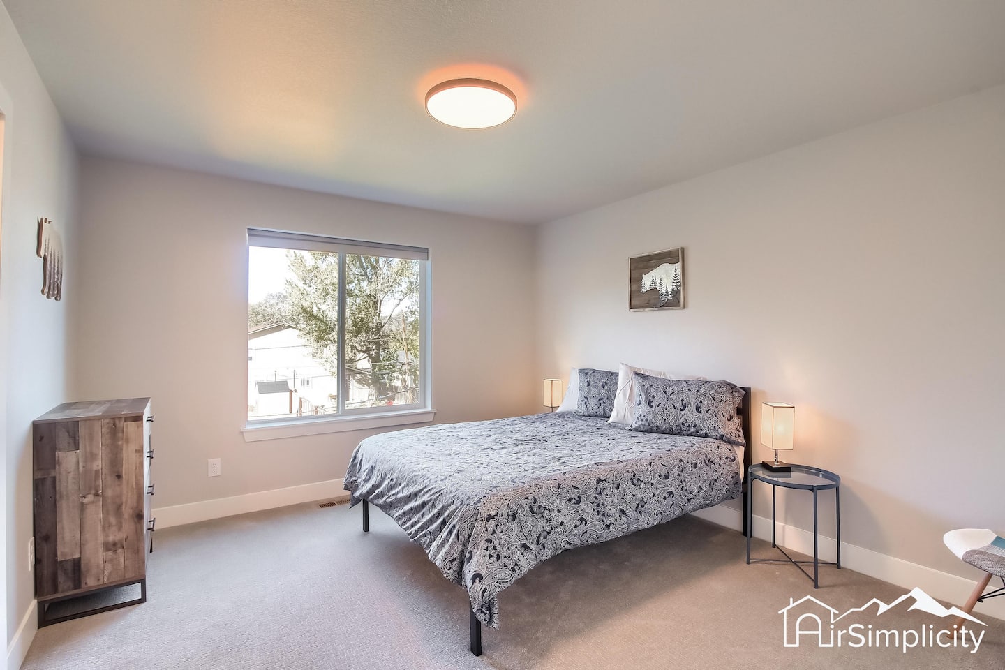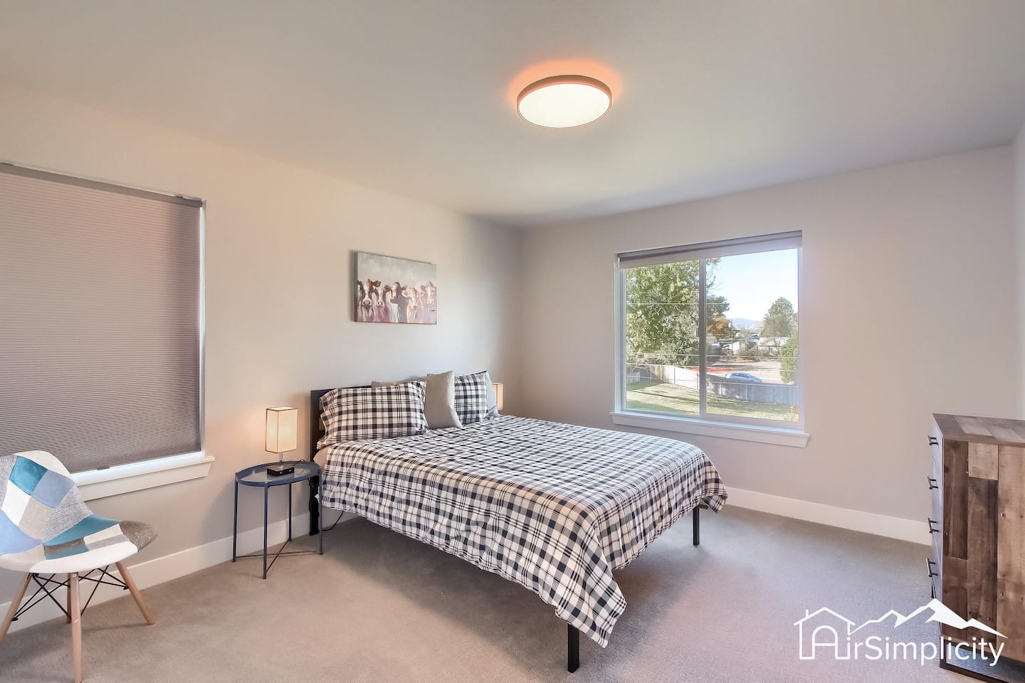 A second upstairs bedroom extremely spacious has a queen size bed, high-end linens, plush carpeting and some fun artwork. Enjoy views over the large backyard and the rocky mountain peaks off in the distance. There is direct access from this bedroom into the Jack-and-Jill-bathroom.