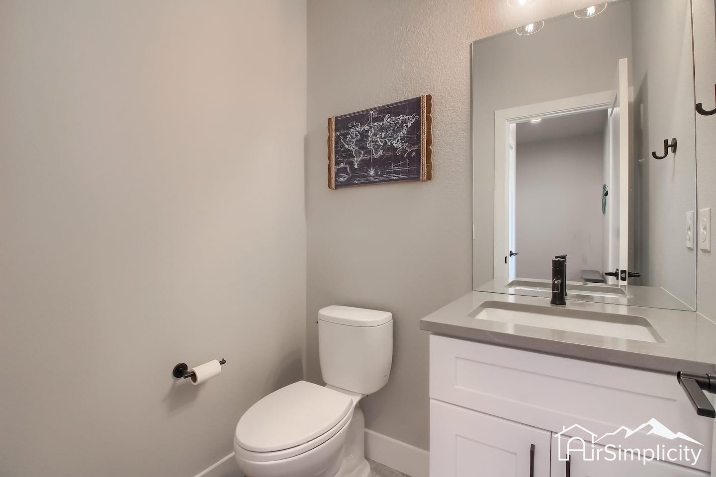 The third bathroom is located right off the kitchen. This bathroom is a half bath without a tub or shower.