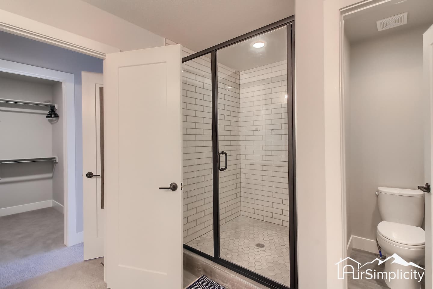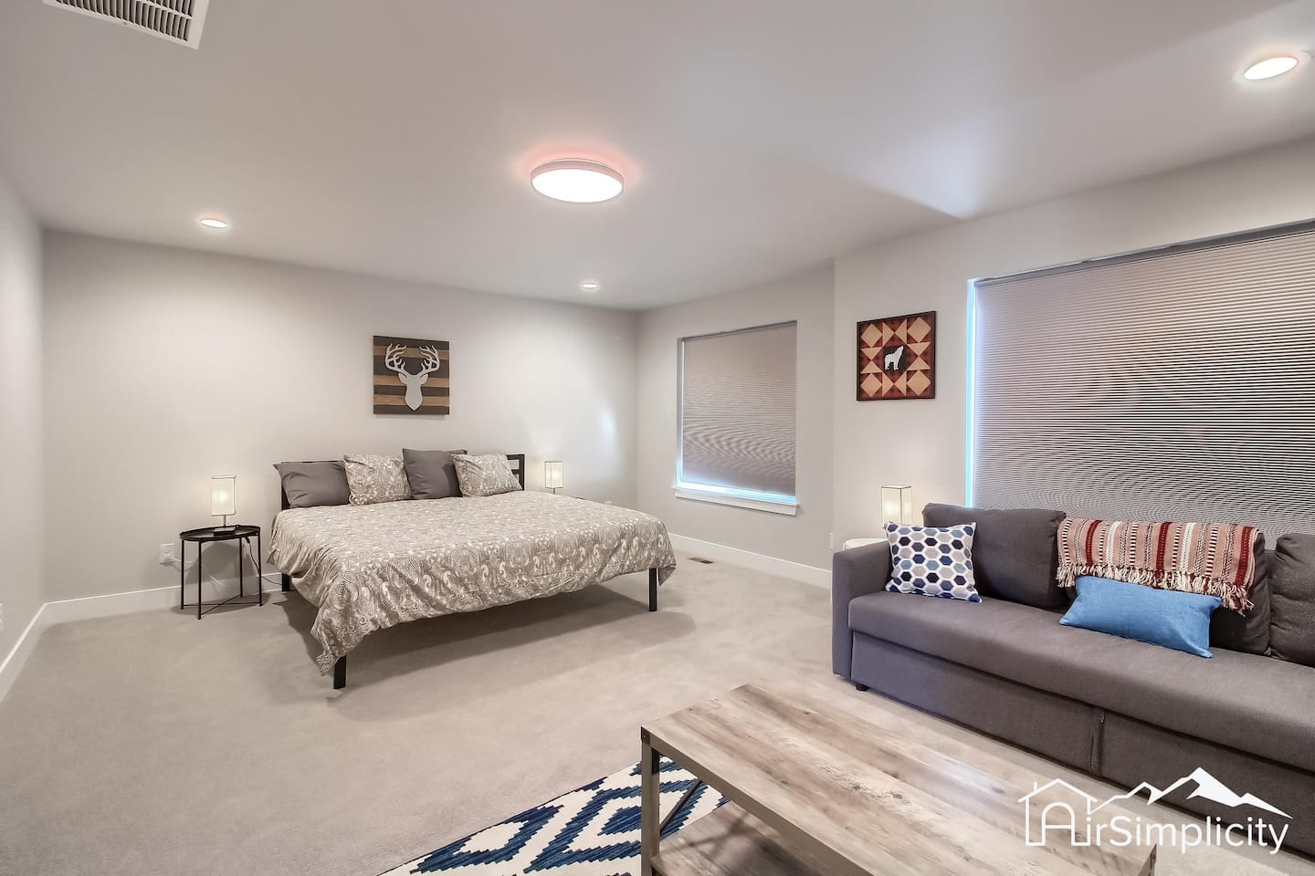 The master bedroom is located upstairs has a king-size bed and boasts large windows that allow for plenty of natural light but with blackout blinds to ensure privacy. There is also a sitting area, with a comfortable sofa. This master bedroom has its own private bathroom with a massive walk in shower. There is also a large, walk-in closet that stores the queen air mattress to sleep 2 guests.