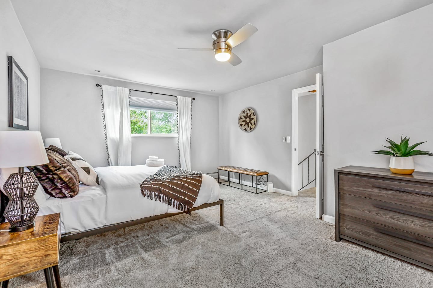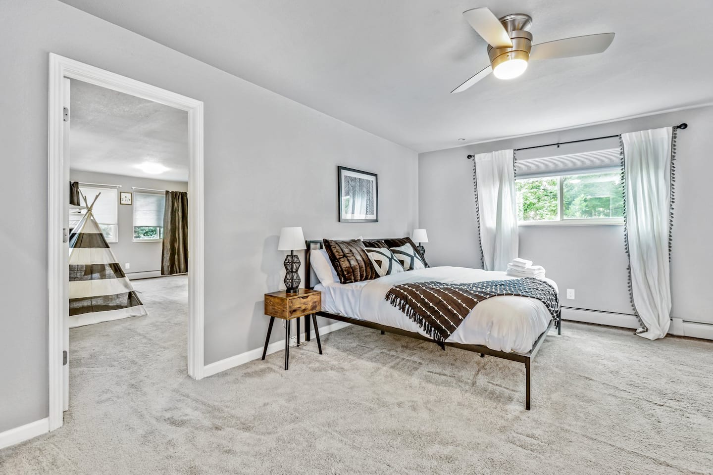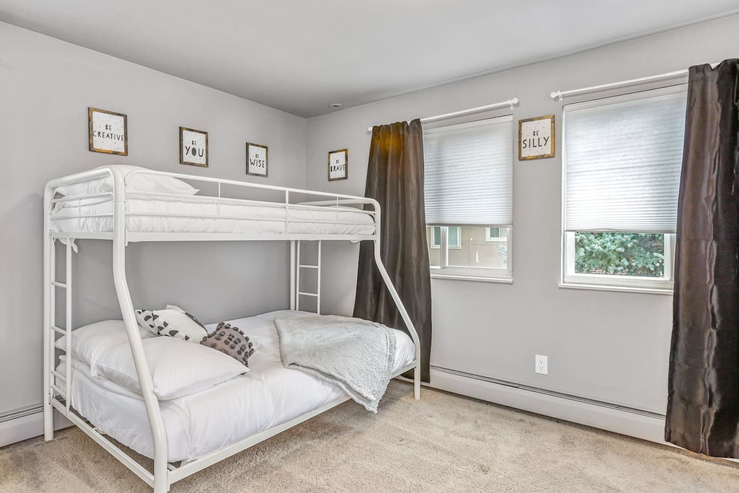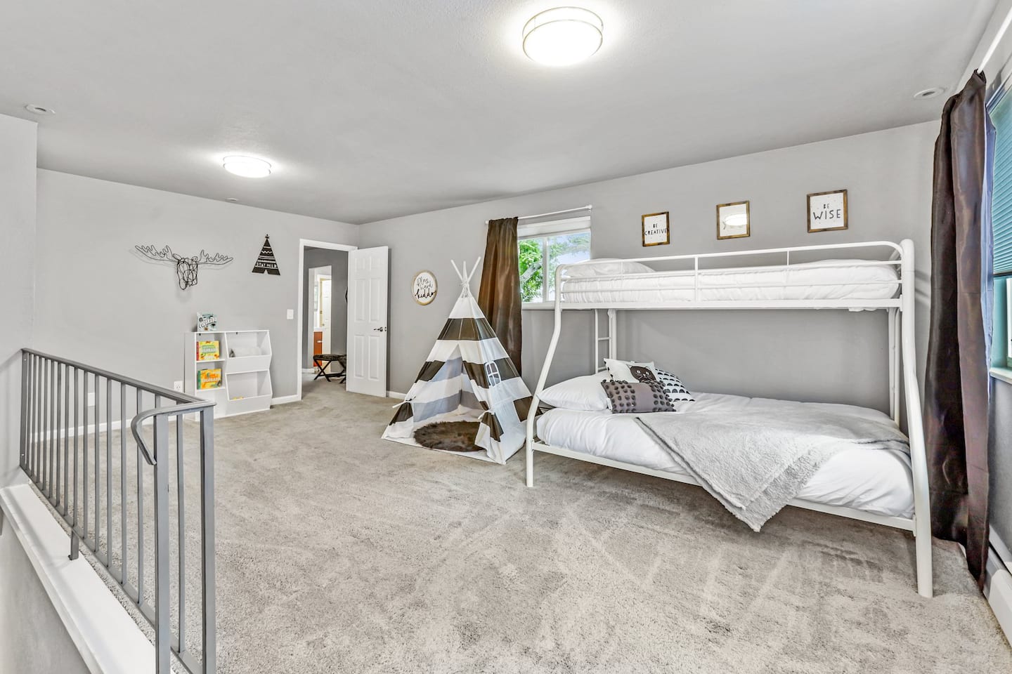 Bedroom #2, designed for children, is located just off the master bedroom or accessed via a back staircase, and features a twin over full bunk bed, a play tent, a pack n play, and ample play space.
