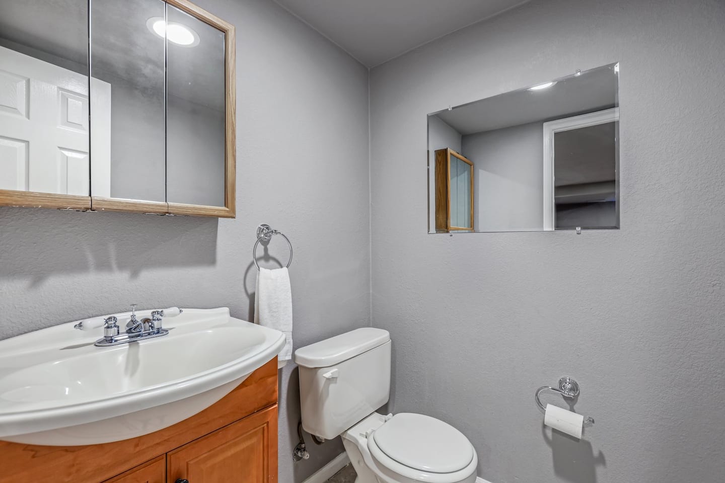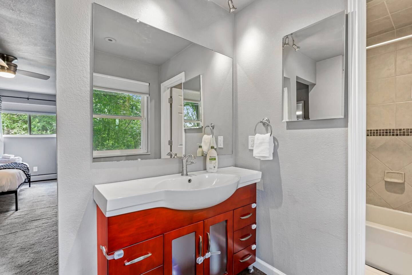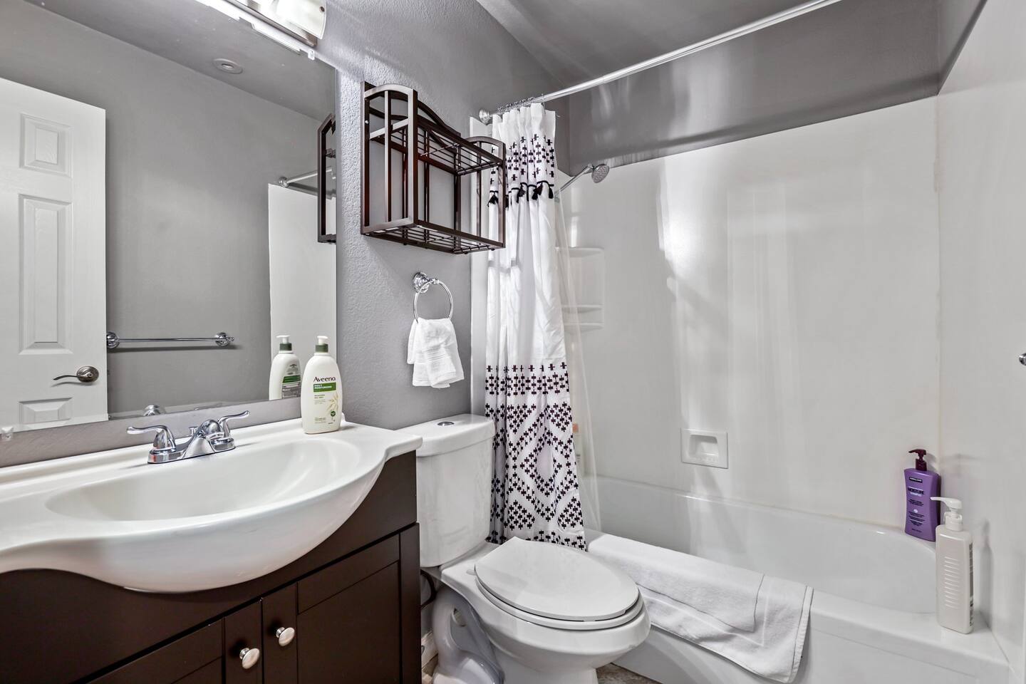 The hallway bathroom on this floor includes a shower/tub combo, toilet, and sink, with toiletries provided.